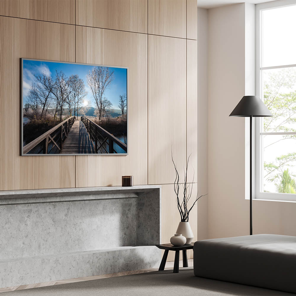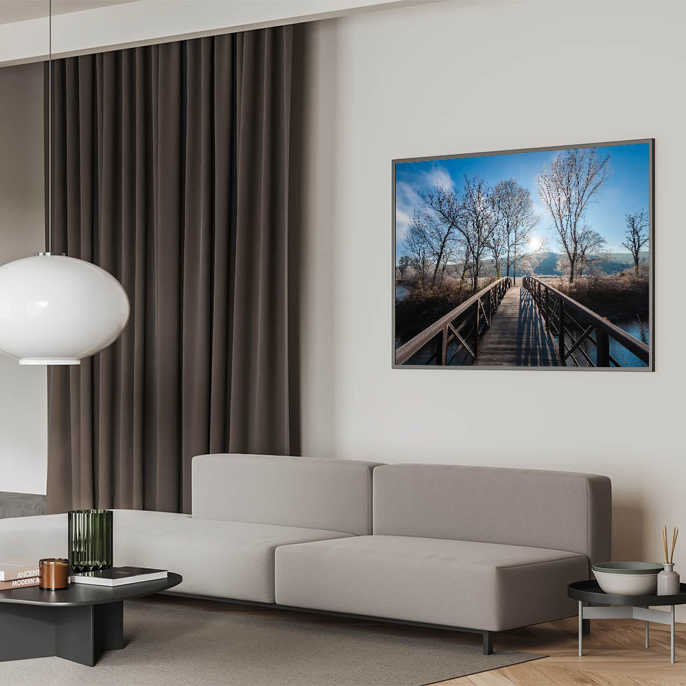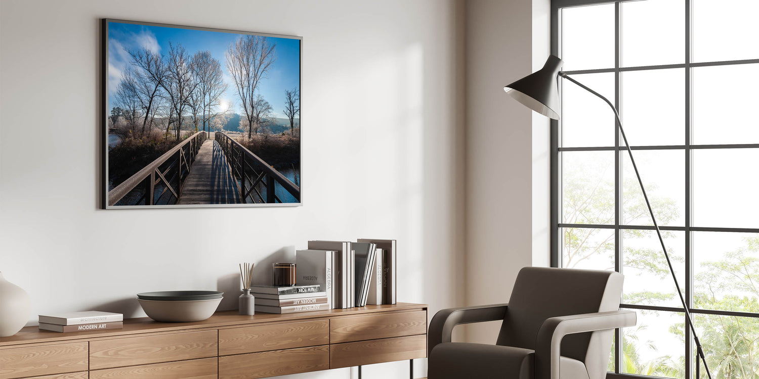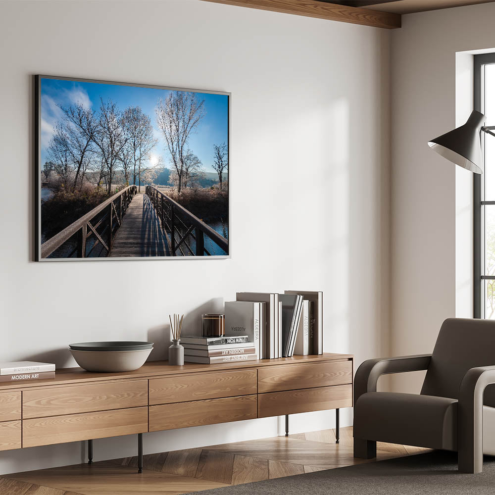 Step into the quiet beauty of a Vermont winter with this stunning wall art featuring a frosty bridge leading into a peaceful landscape. The crisp blue sky and the sunlit trees create a captivating contrast against the dark wooden bridge, casting long shadows that enhance the depth and serenity of the scene. The frost-covered trees and soft sunlight make this Vermont scenic art perfect for bringing a touch of nature’s tranquility into your home.