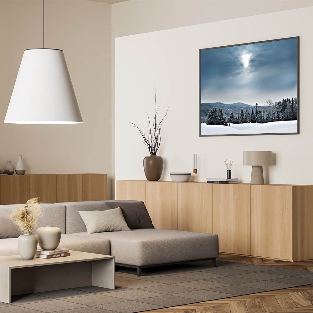 Embrace the peaceful beauty of a Vermont winter with this stunning wall art showcasing snow-covered pine trees against a backdrop of rolling mountains. This Vermont scenic art captures the calm and tranquility of a snowy landscape, with soft light filtering through the clouds and gently illuminating the forest. Perfect for those who appreciate the quiet elegance of winter, this Vermont winter art will bring a sense of calm to any space.