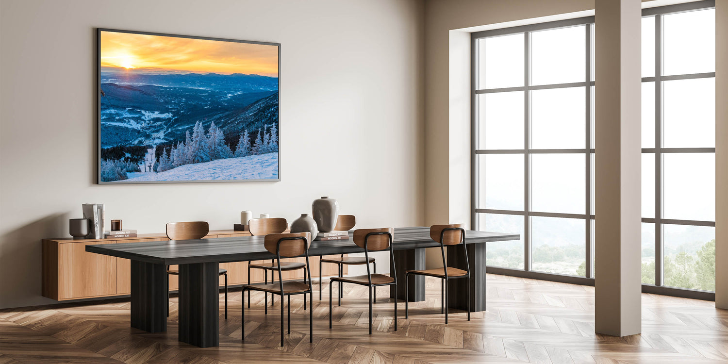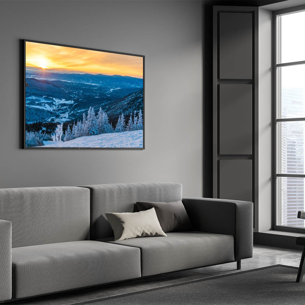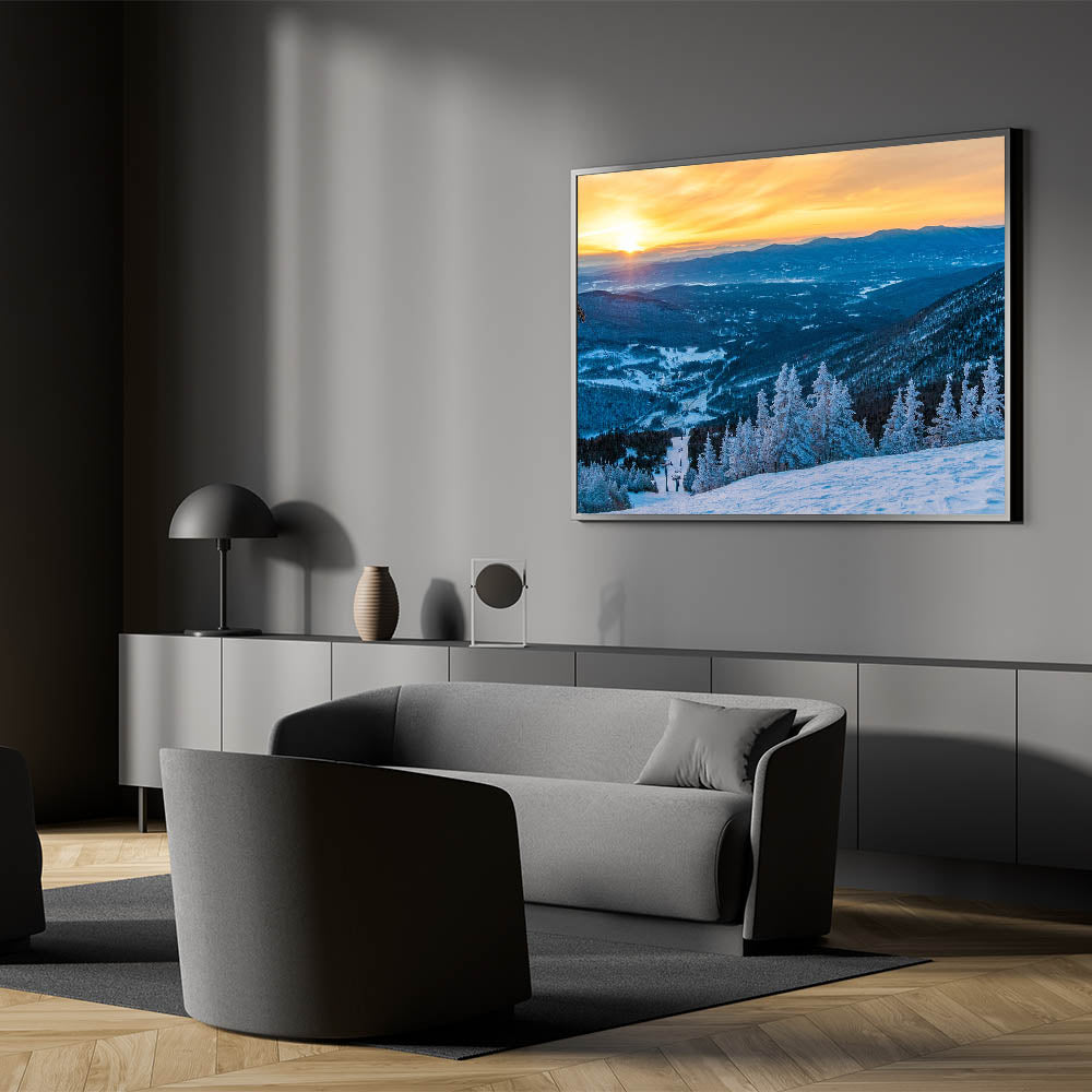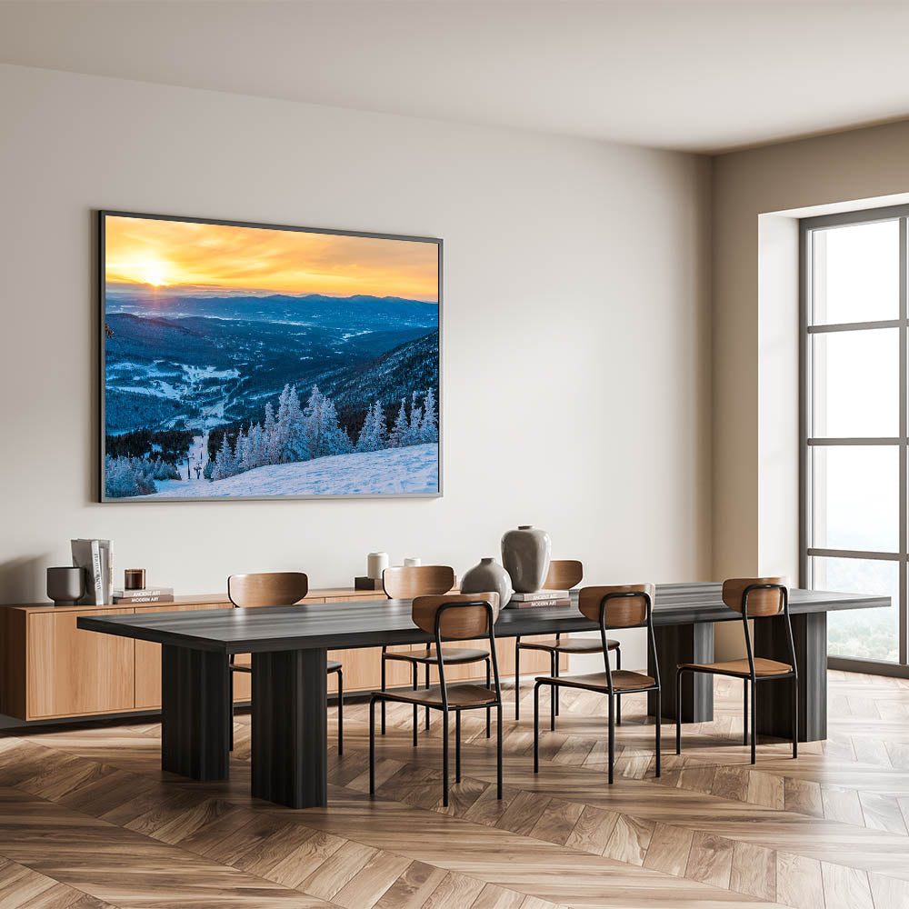 Capture the breathtaking beauty of Vermont’s winter wonderland with this stunning wall art showcasing a panoramic view of snow-covered mountains under a glowing sunset. The vibrant golden hues of the setting sun reflect off the snowy slopes, creating a captivating contrast against the cool blues of the valley and distant peaks. This Vermont scenic art is perfect for those who love the peaceful majesty of winter landscapes and the excitement of mountain ski resorts.