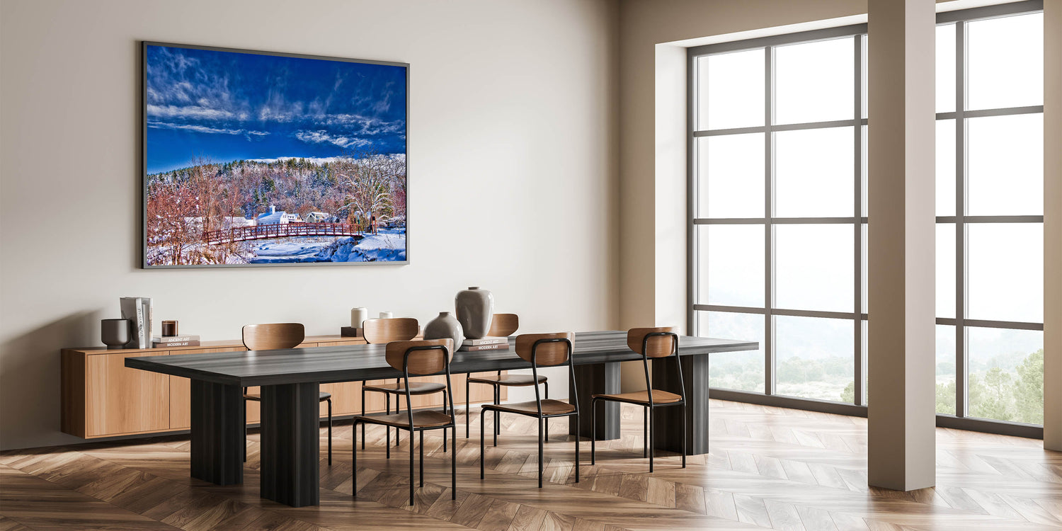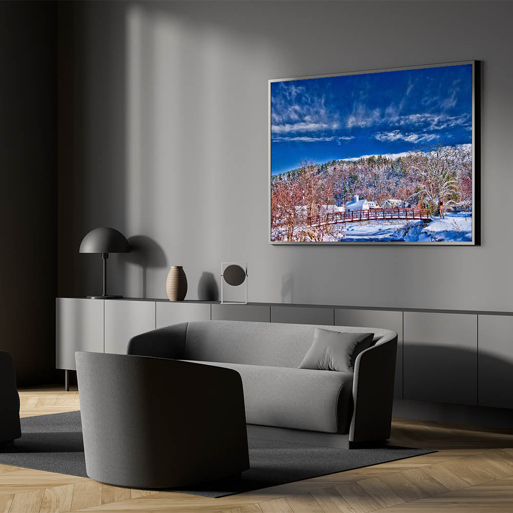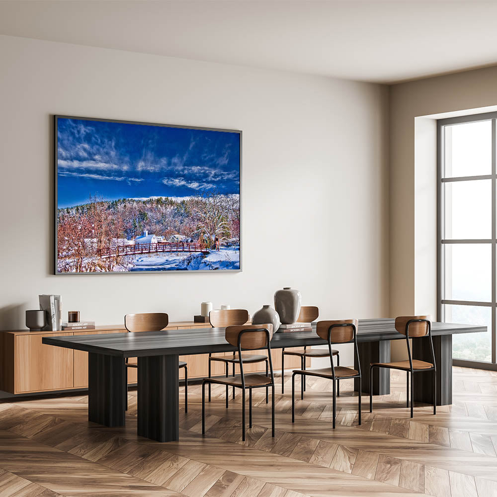 Bring the charm of a Vermont winter village into your home with this captivating wall art. Featuring a snow-covered bridge, quaint village houses, and a vibrant blue sky, this Vermont scenic art captures the beauty of winter in New England. The crisp white snow contrasts perfectly with the deep blue of the sky and the warm tones of the village, creating a scene that’s both inviting and peaceful. This artwork is ideal for anyone who loves the charm of small towns and the magic of winter.