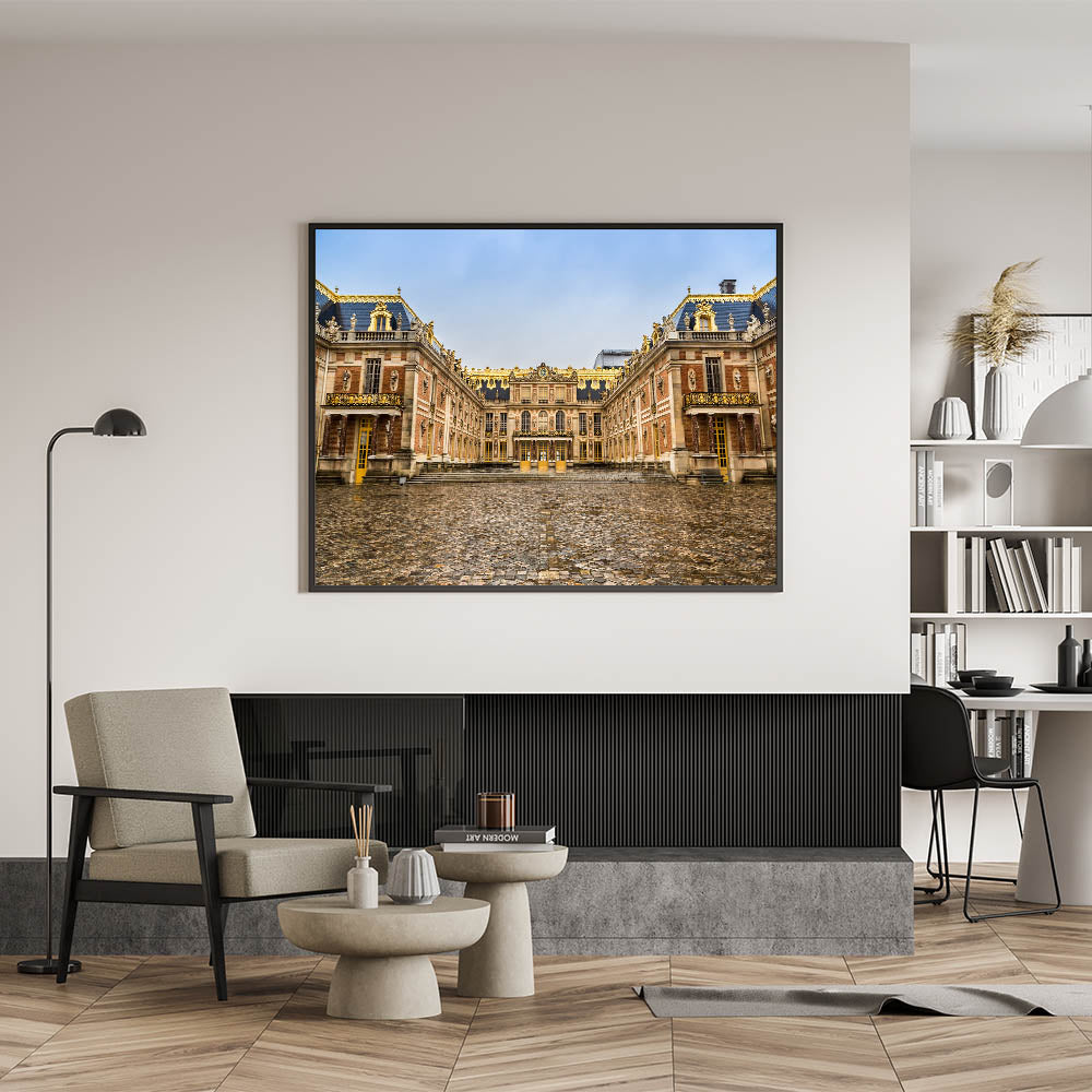 This remarkable Versailles wall art captures the grandeur of the Palace of Versailles courtyard in stunning detail. The rich gold accents on the palace’s façade, along with the intricate stonework, make this piece an exquisite addition to any space. Ideal for those who appreciate French architecture wall decor, this print beautifully showcases the majestic essence of one of Europe’s most iconic landmarks.