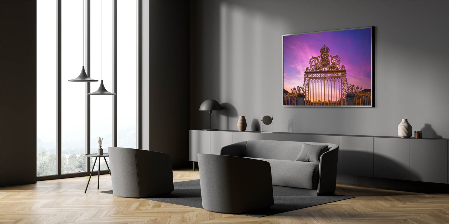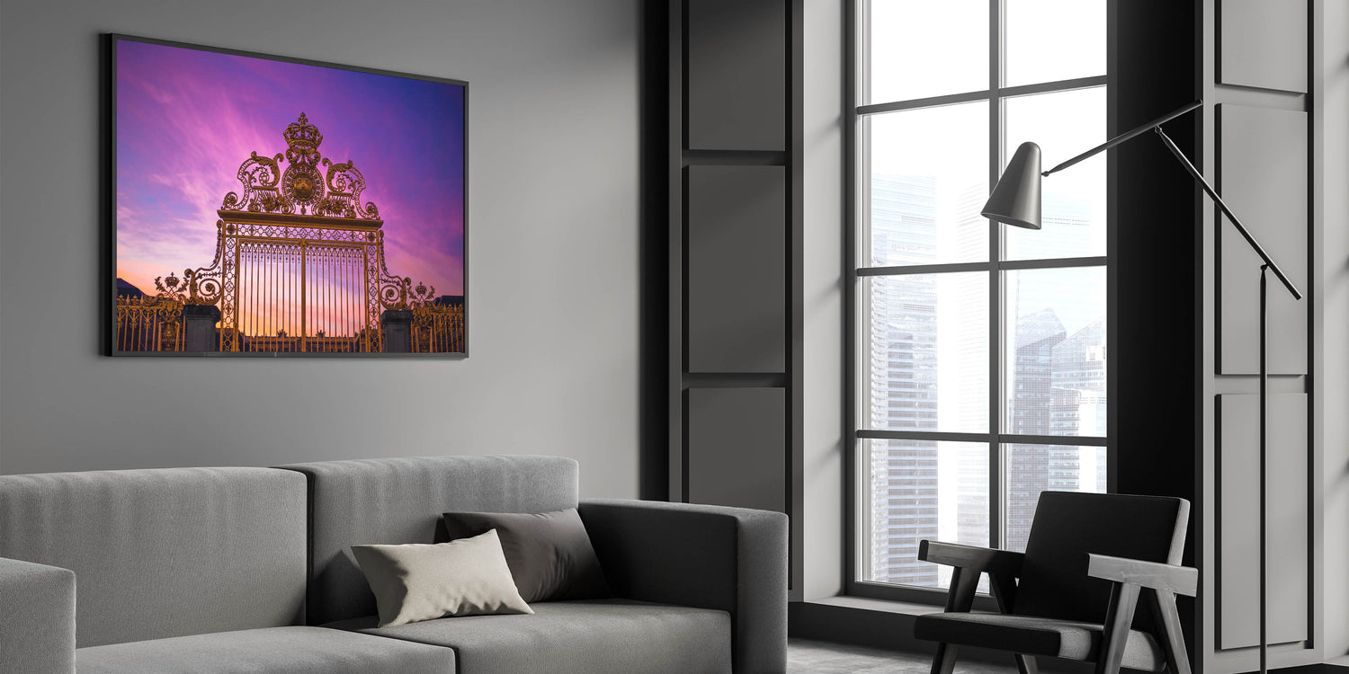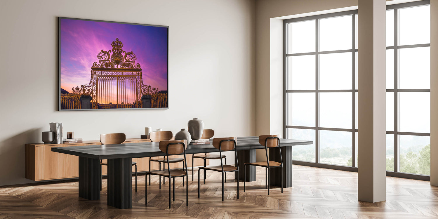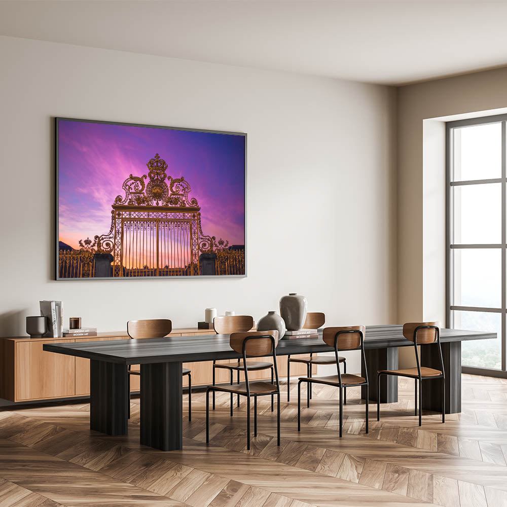 This stunning Versailles wall art features the iconic golden gate of the Palace of Versailles set against a vibrant sunset sky. The intricate detailing of the golden gate combined with the soft, warm hues of the sunset makes this piece a perfect representation of French palace wall art. Ideal for those looking to add a touch of luxury to their home, this artwork will transform any room into a space of elegance and sophistication.
