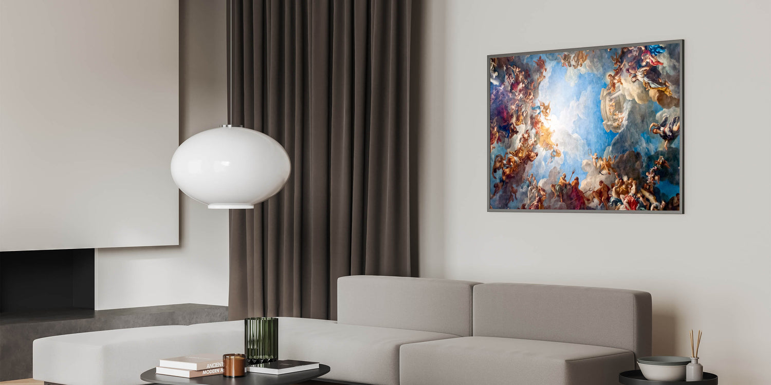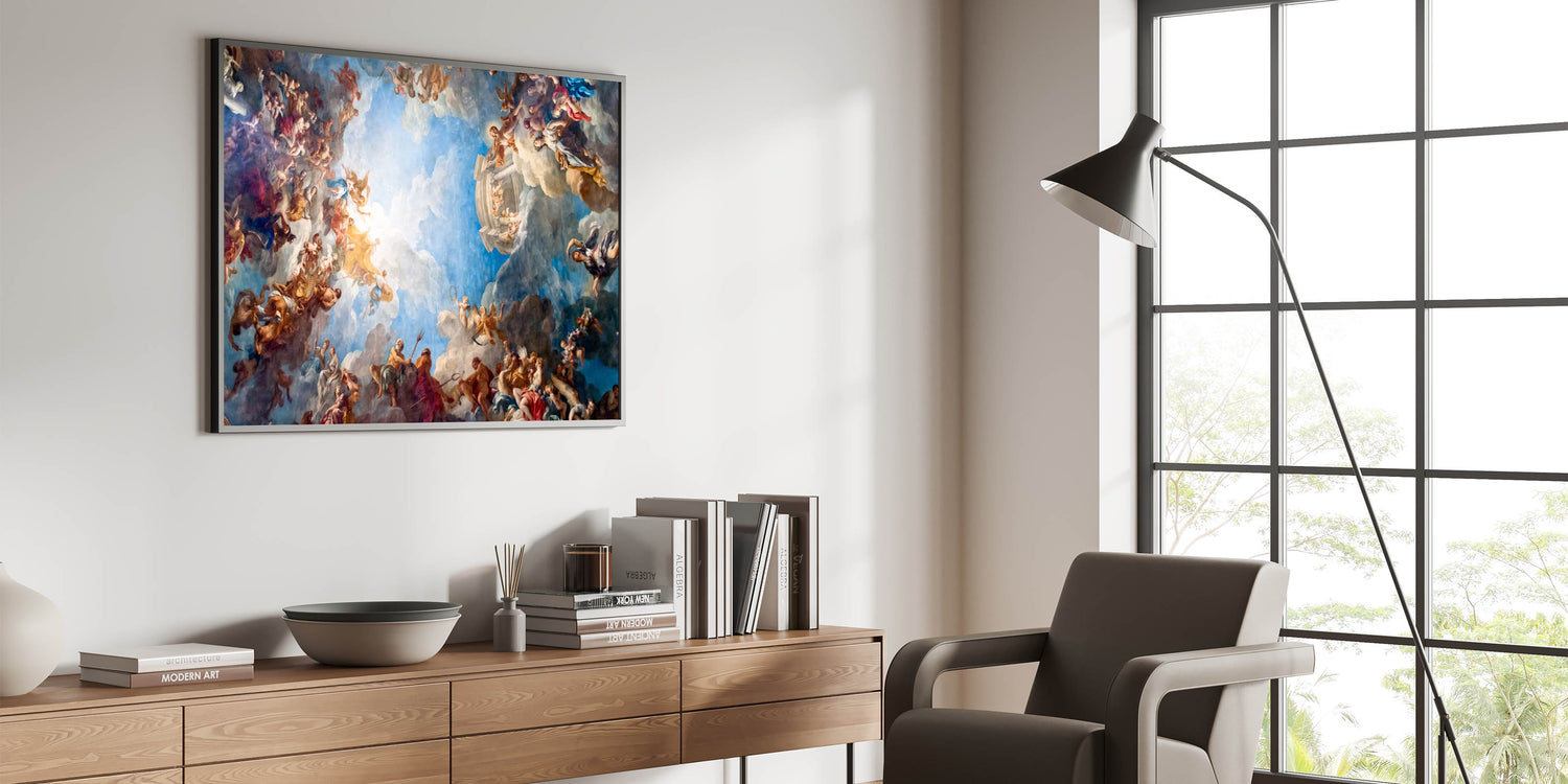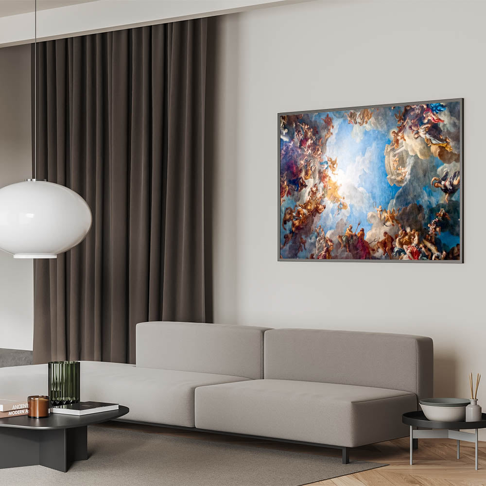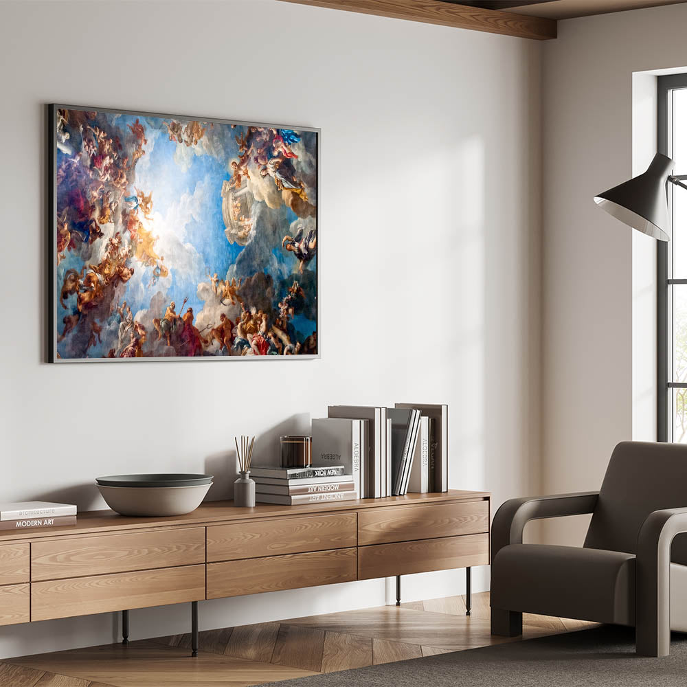 Bring the opulence of Versailles home décor into your living space with this incredible Baroque ceiling painting. Whether on canvas or in a frame, this Versailles canvas print combines timeless elegance with artistic beauty, creating a striking focal point for your home.