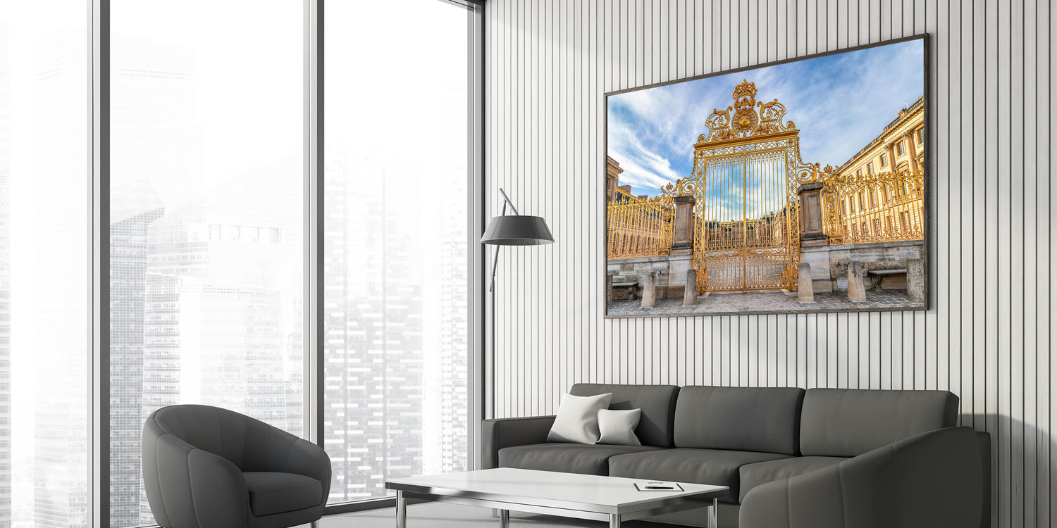 This breathtaking Versailles wall art features the iconic golden gate of the Palace of Versailles against a clear blue sky. The intricate design and luxurious gold details of the gate are masterfully captured, making this piece an excellent choice for those seeking to add a touch of royal elegance to their home. The French palace wall art showcases the grandeur of European scenery art in a timeless and sophisticated way.