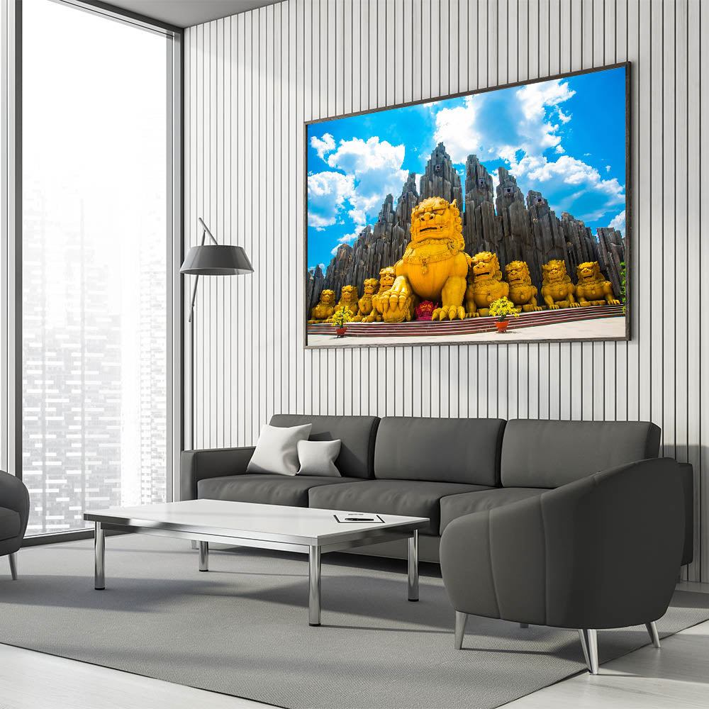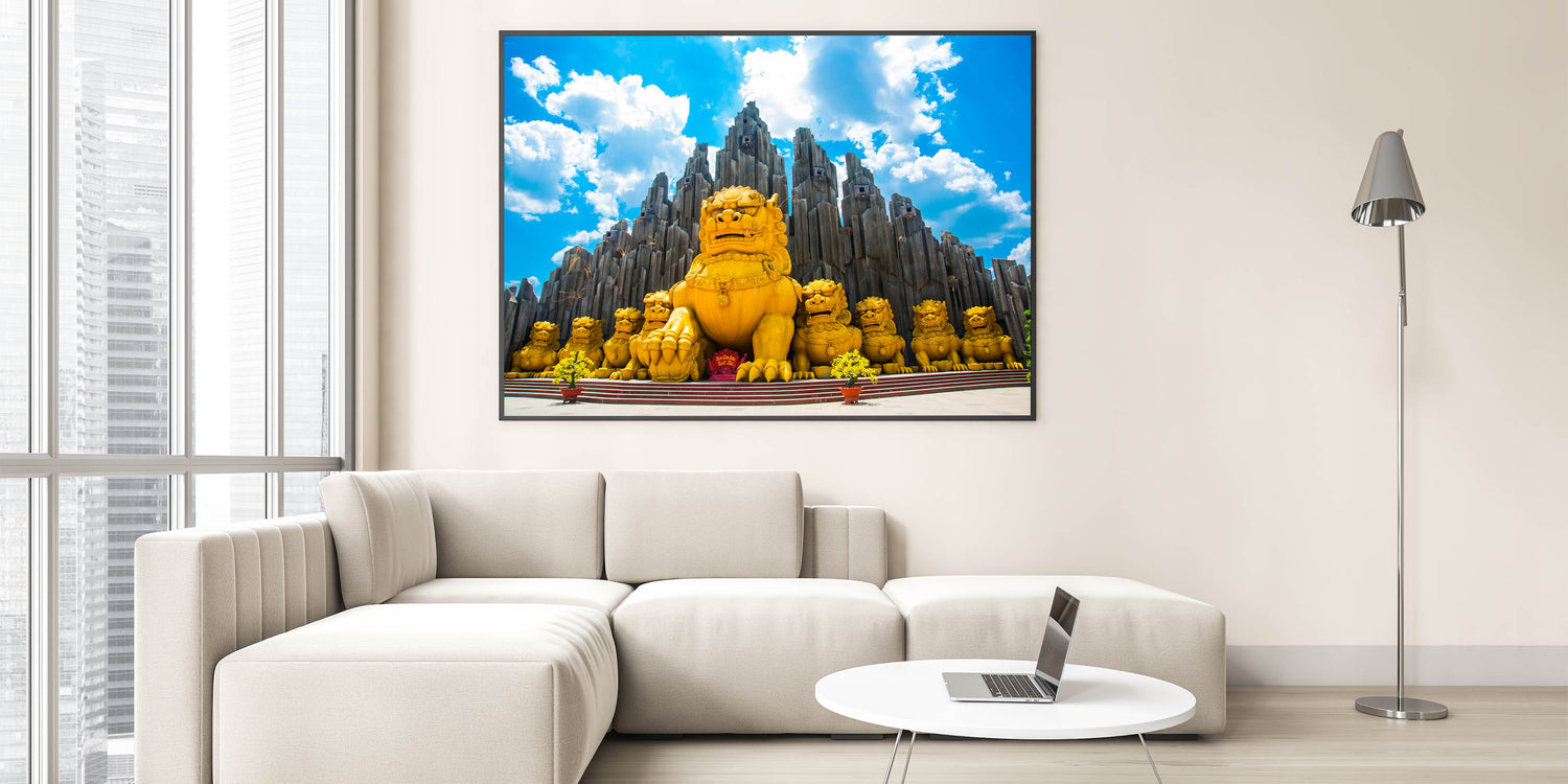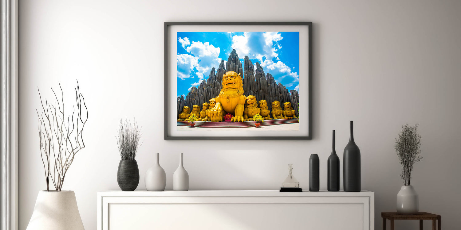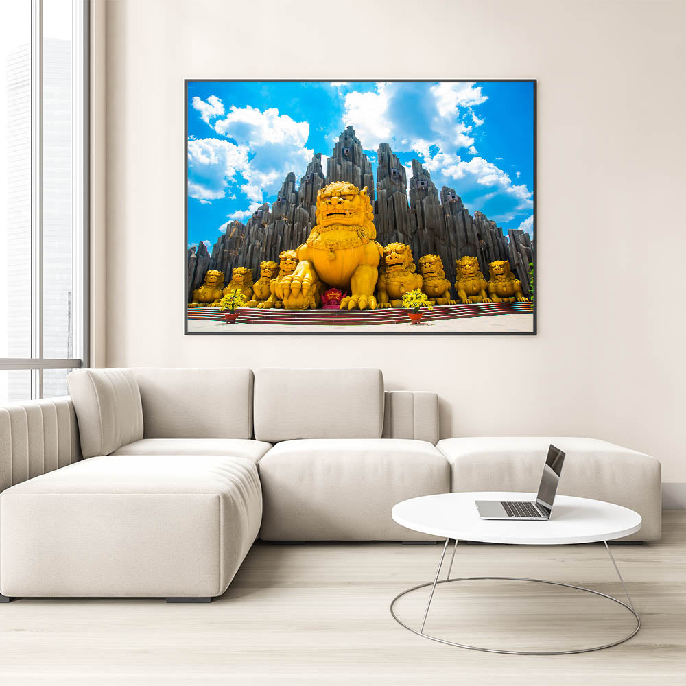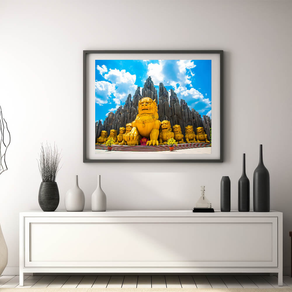 Discover the majestic presence of Vietnam's cultural icons with this striking wall art featuring vibrant yellow lions against a dramatic backdrop of towering stone pillars. This unique piece captures the essence of Vietnamese artistic expression and spiritual guardianship, making it a standout addition to any collection.