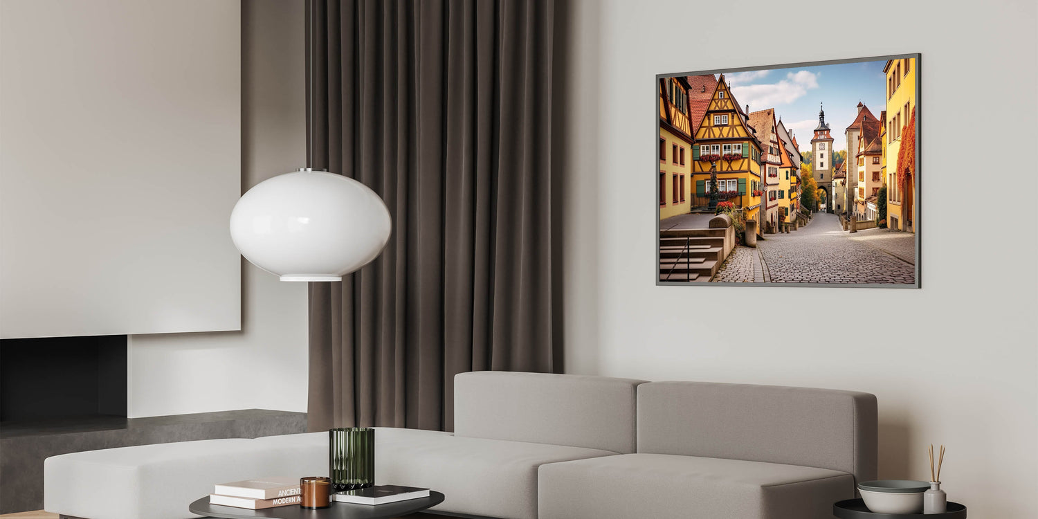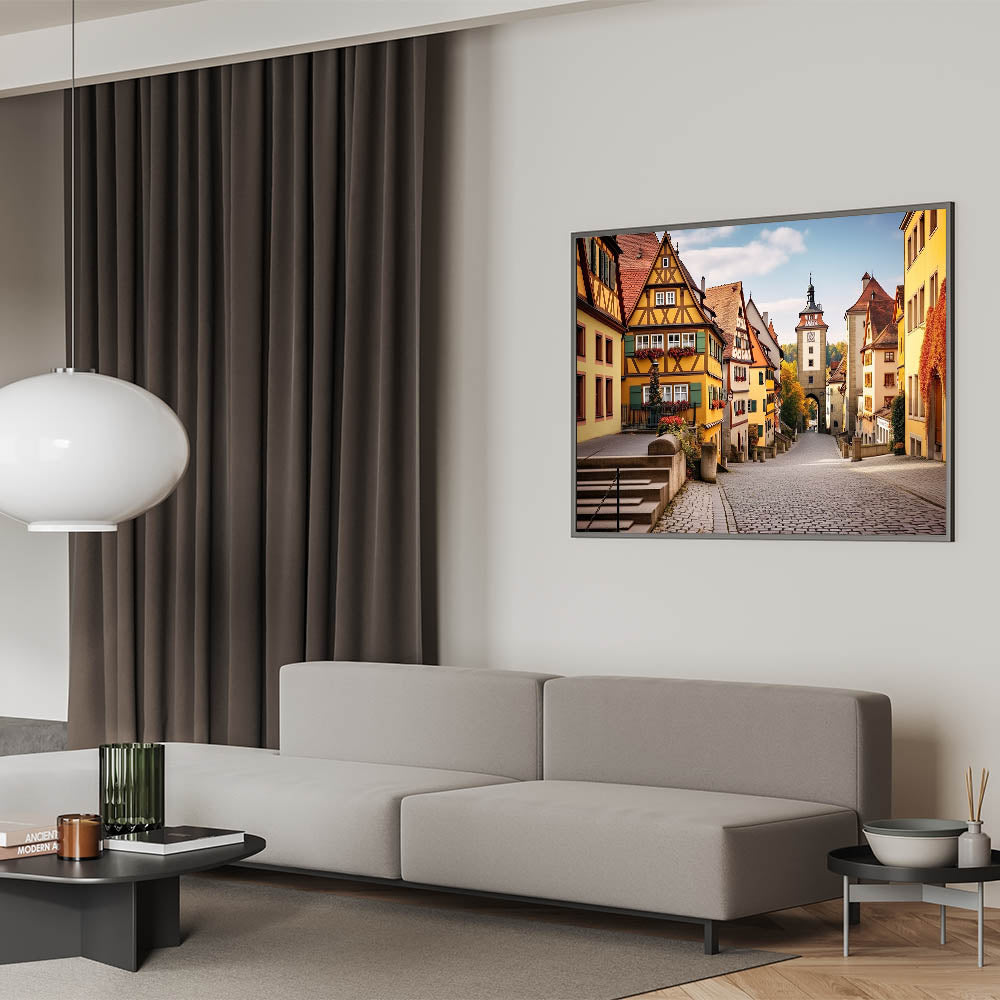 This village scene wall decor is perfect for anyone who appreciates the charm of European architecture and the tranquility of small-town life. Whether displayed in a living room, study, or hallway, this idyllic village canvas print will bring warmth and character to your space.