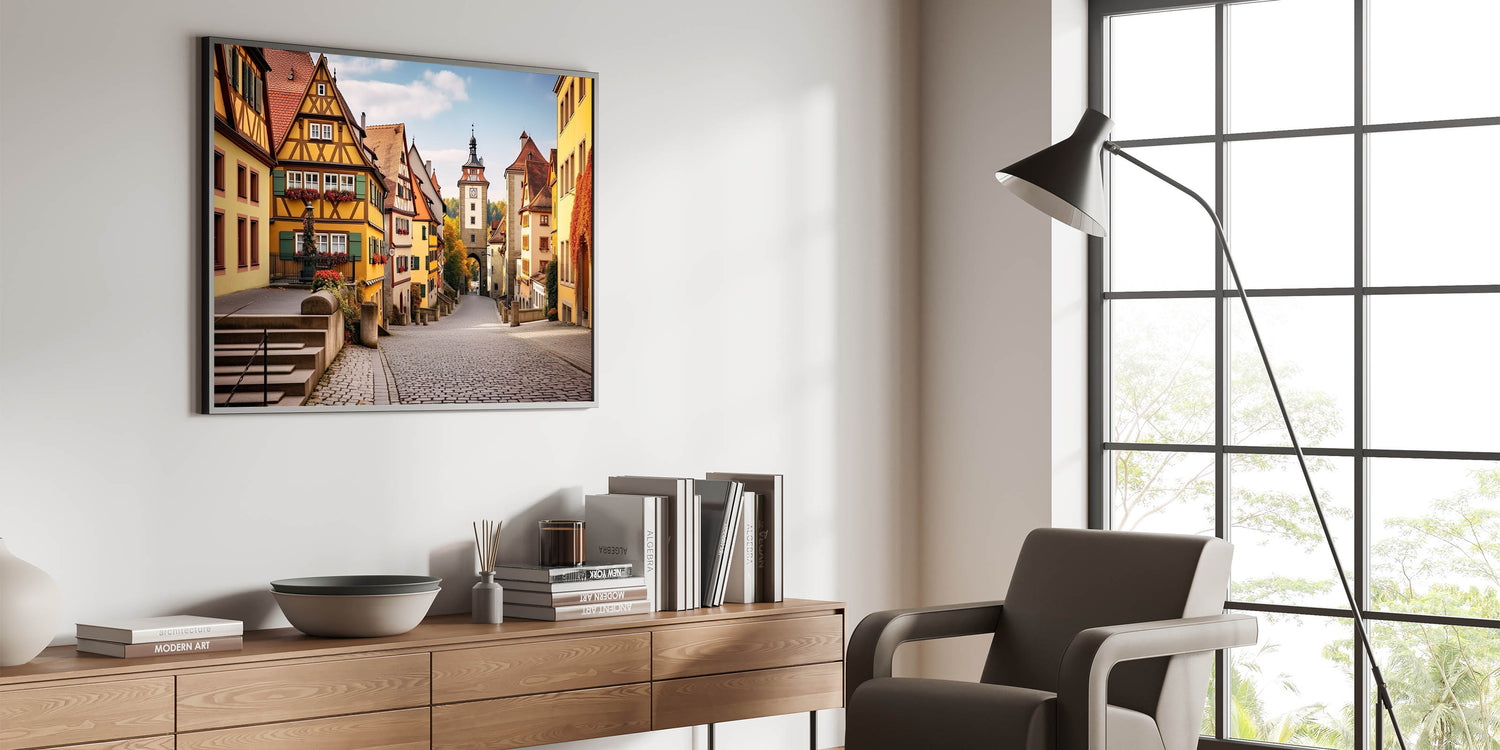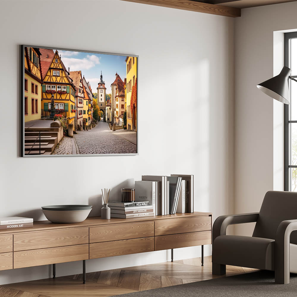 Step back in time with this exquisite village landscape painting that captures the timeless beauty of a historic German village. The artwork showcases a charming street lined with traditional half-timbered houses, each adorned with colorful window boxes and climbing ivy. The warm tones of the buildings contrast beautifully with the cobblestone path, leading the eye towards a picturesque tower in the distance. This scene evokes a sense of nostalgia and tranquility, making it an ideal addition to any room seeking a touch of European elegance.