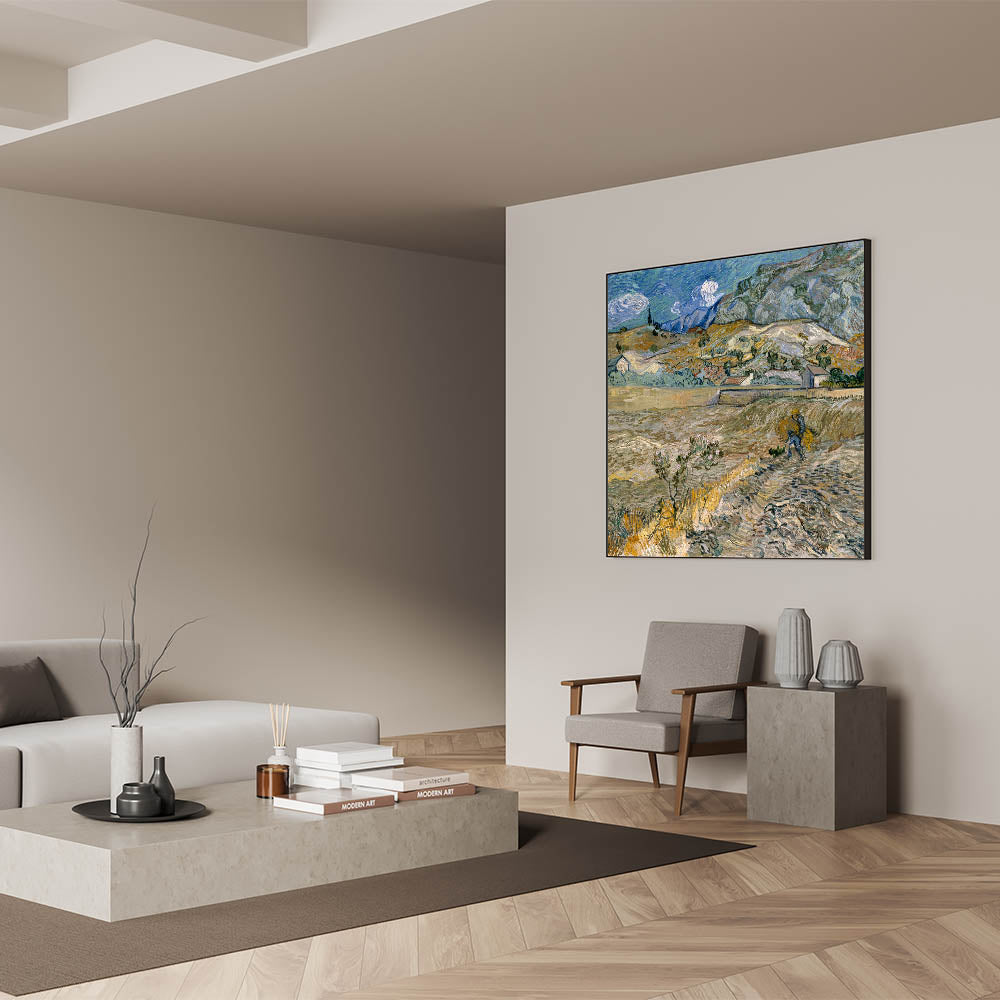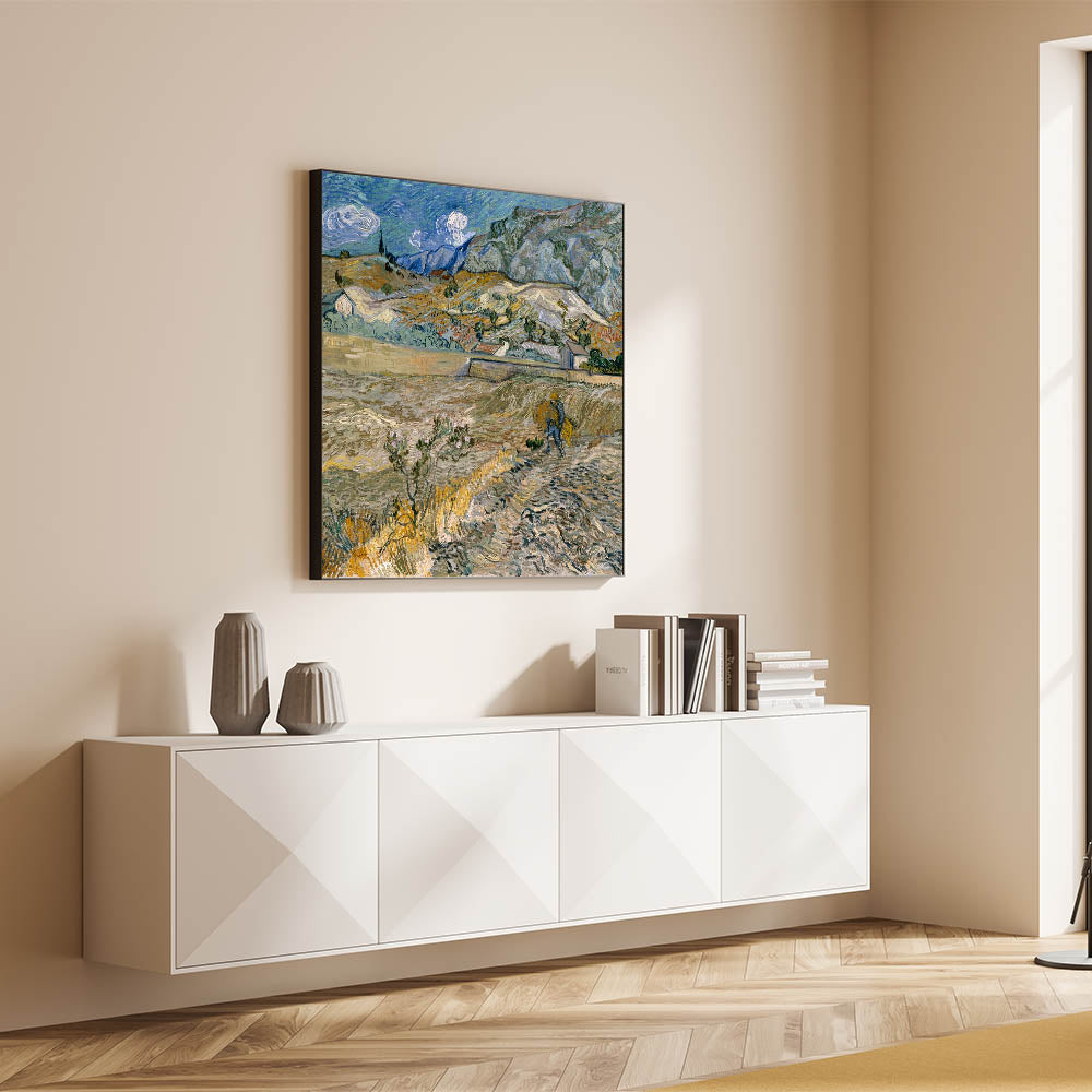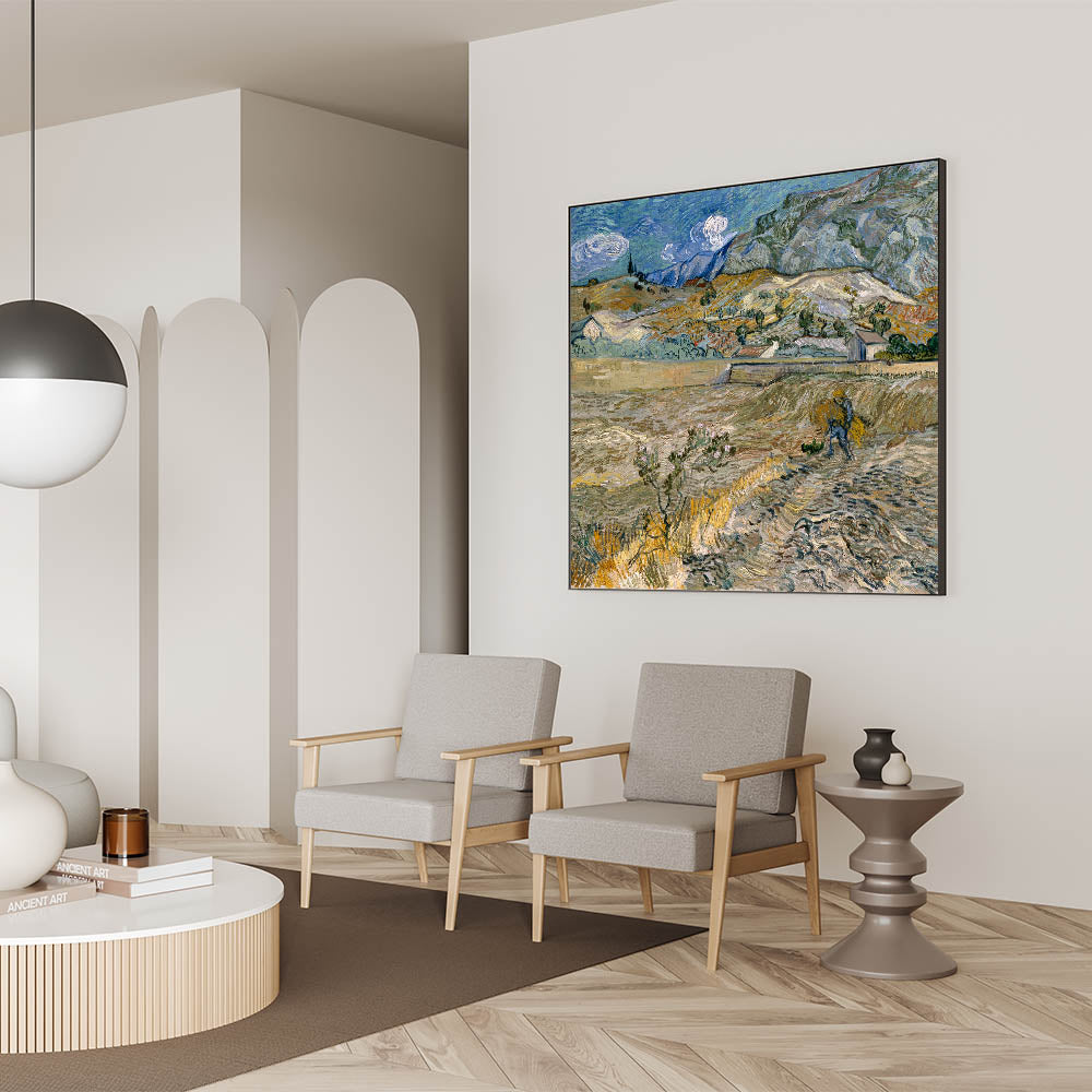 Immerse yourself in the tranquil beauty of the countryside with this Starry Night wall art by Vincent van Gogh. Featuring a serene landscape of rolling hills, rustic cottages, and a lone farmer at work, this masterpiece captures the charm of rural life through van Gogh’s signature bold brushstrokes and earthy tones. The expressive sky and textured fields create a harmonious balance, making this artwork a perfect choice for those who appreciate nature and fine art.
