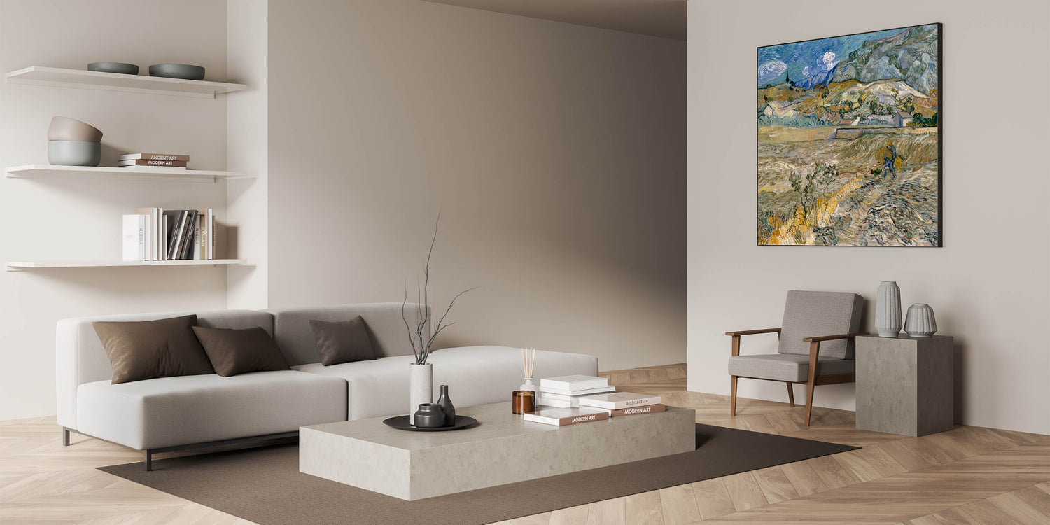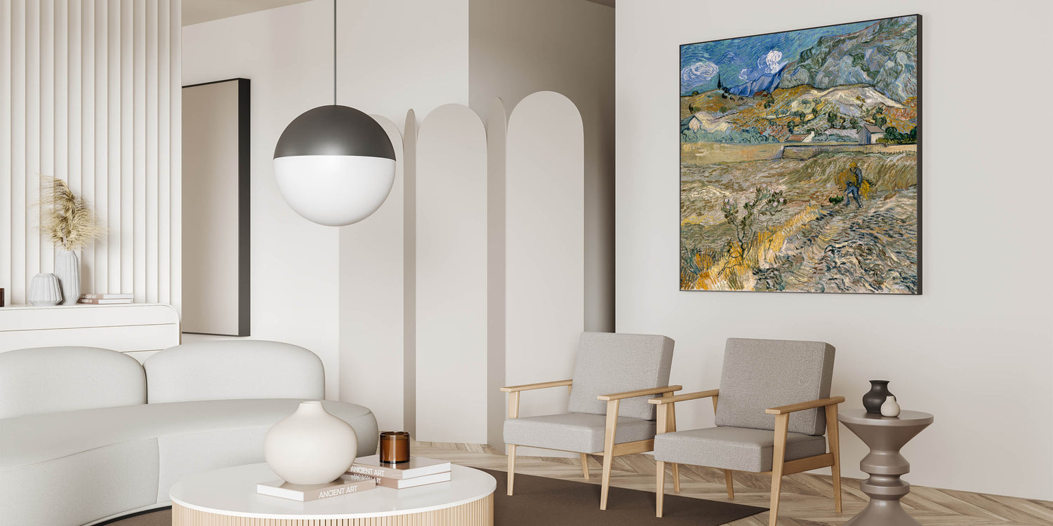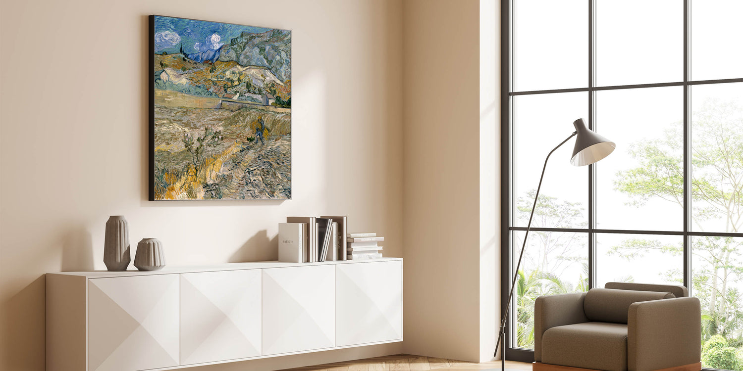 Immerse yourself in the tranquil beauty of the countryside with this Starry Night wall art by Vincent van Gogh. Featuring a serene landscape of rolling hills, rustic cottages, and a lone farmer at work, this masterpiece captures the charm of rural life through van Gogh’s signature bold brushstrokes and earthy tones. The expressive sky and textured fields create a harmonious balance, making this artwork a perfect choice for those who appreciate nature and fine art.
