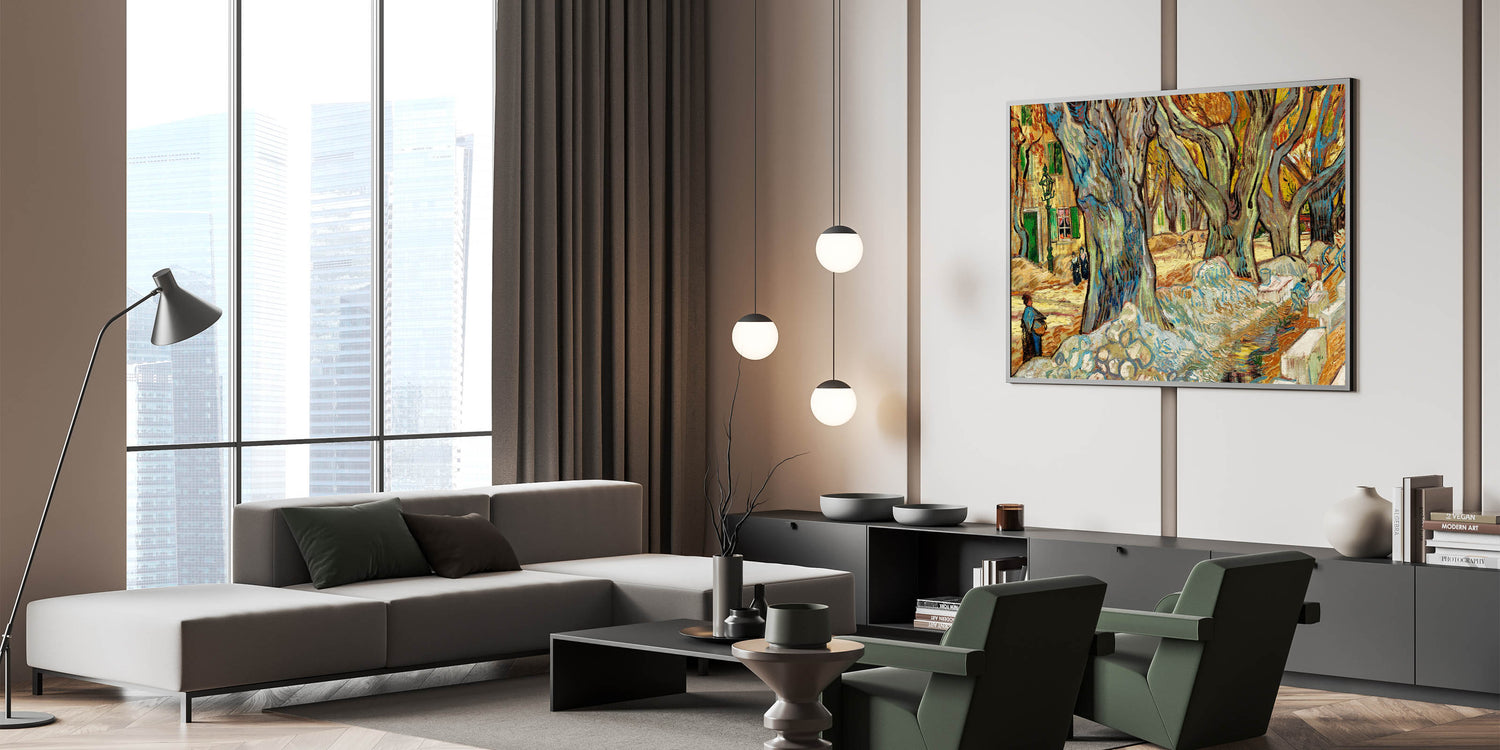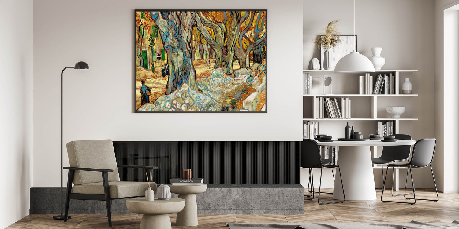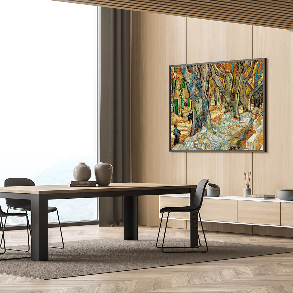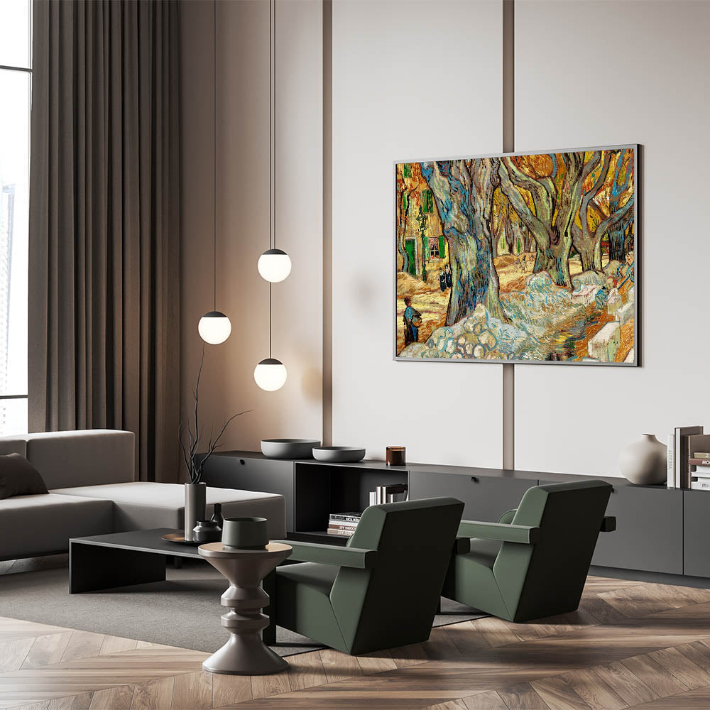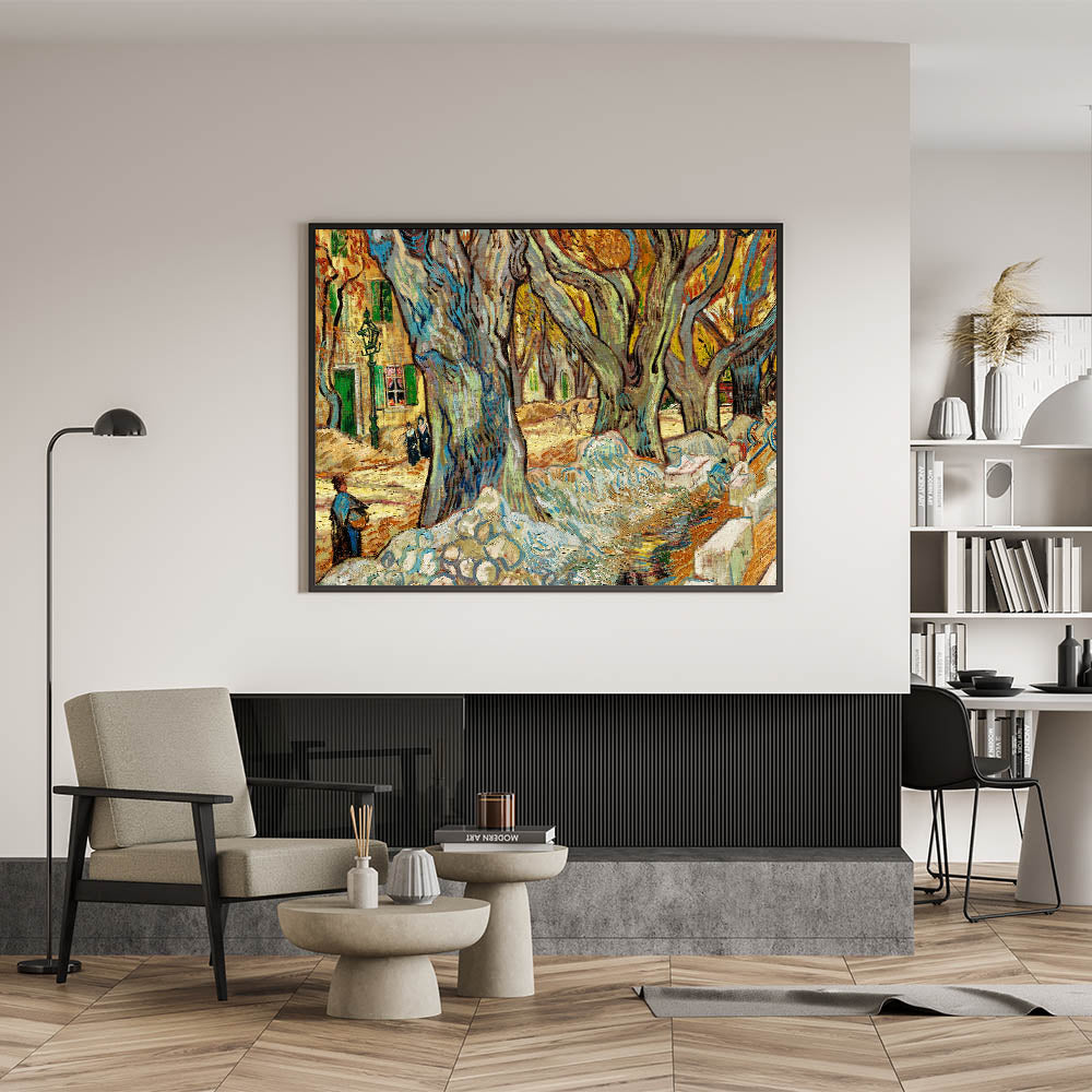 Immerse yourself in the beauty of Vincent van Gogh’s "The Large Plane Trees." This remarkable artwork captures a bustling street scene surrounded by towering plane trees with intricate bark patterns and vibrant autumnal tones. Van Gogh’s signature brushstrokes bring movement and life to this stunning Impressionist masterpiece, making it an ideal addition to your Van Gogh art collection.