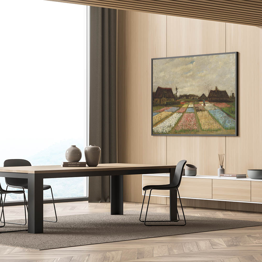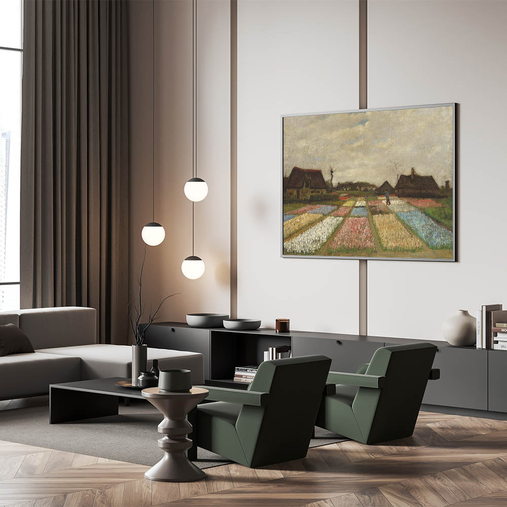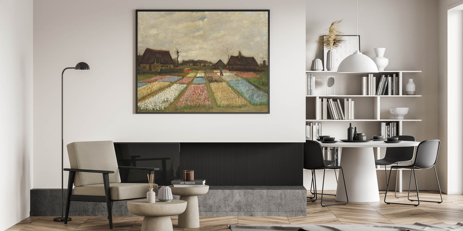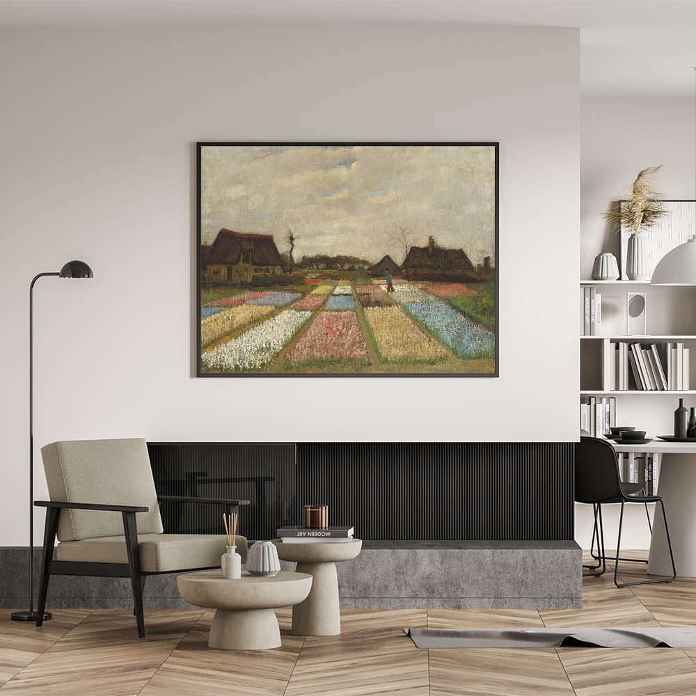 Immerse yourself in the serene beauty of Vincent van Gogh's wall art with this stunning reproduction of "Flower Beds in Holland." This breathtaking piece captures a tranquil rural scene with vibrant flower fields and charming cottages, showcasing Van Gogh's early exploration of landscape art. Perfect for enhancing your living or working space, this artwork is an ideal choice for lovers of Van Gogh wall decor.