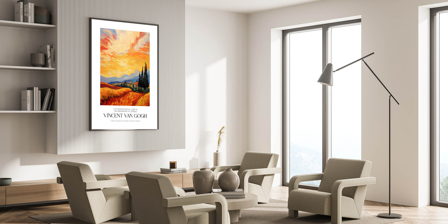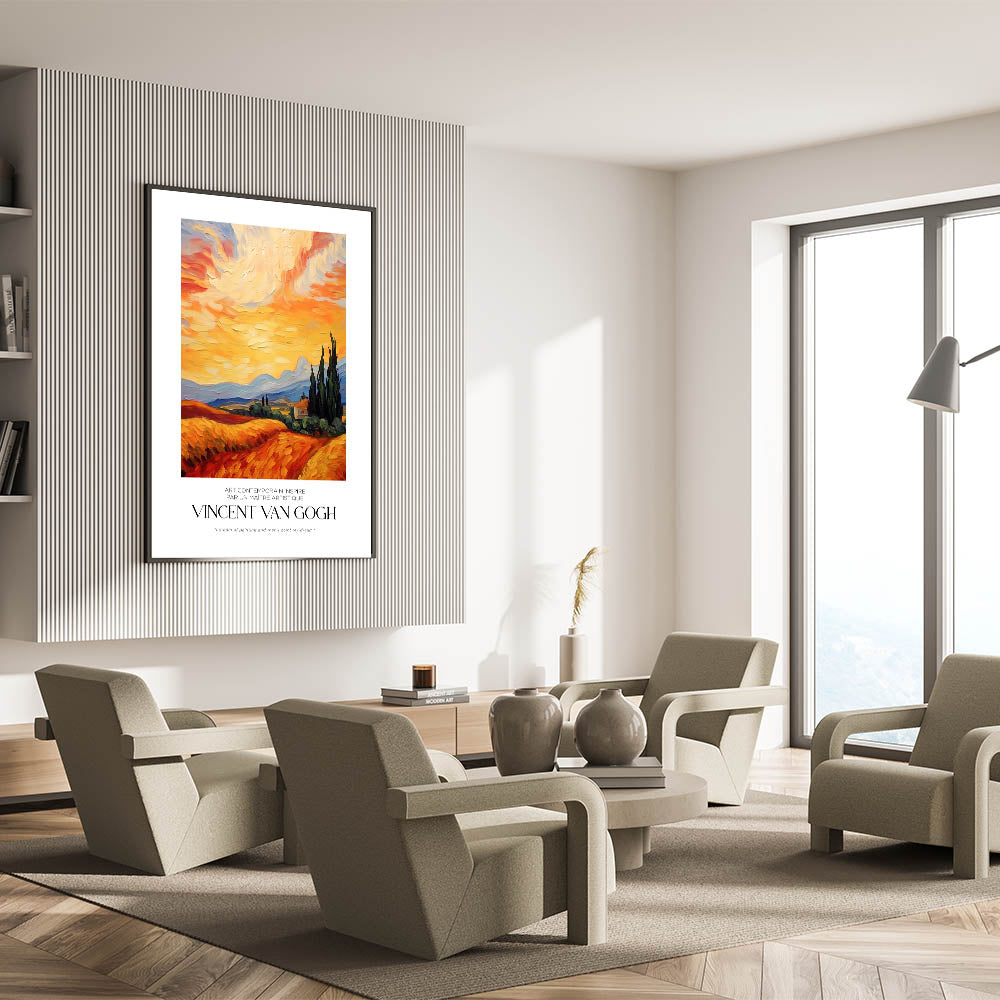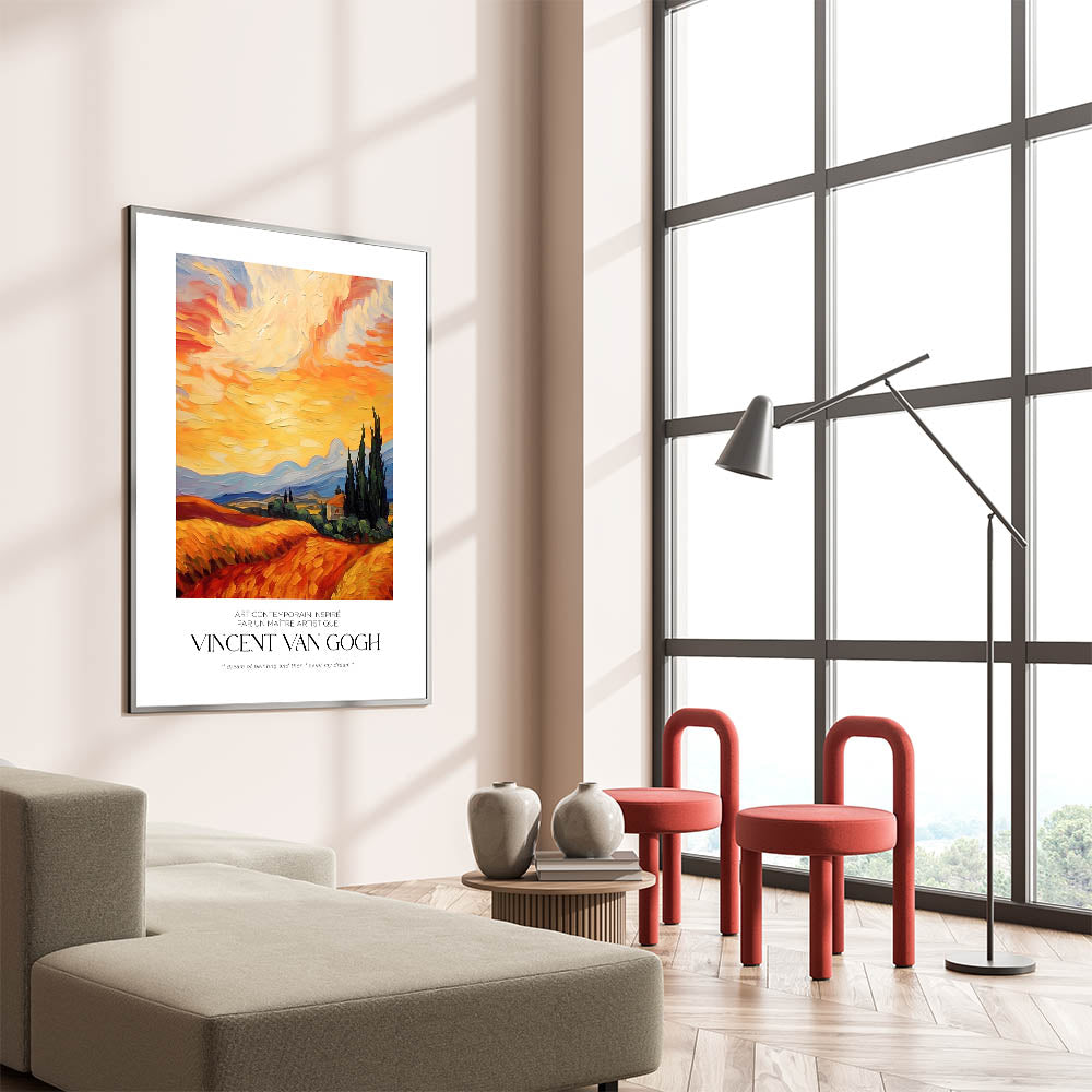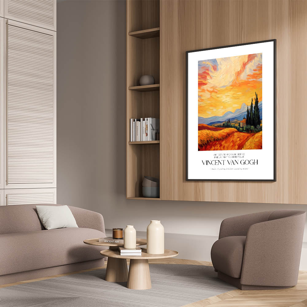 • Design: A stunning reproduction of Van Gogh's countryside-inspired masterpiece, emphasizing vibrant oranges, yellows, and blues