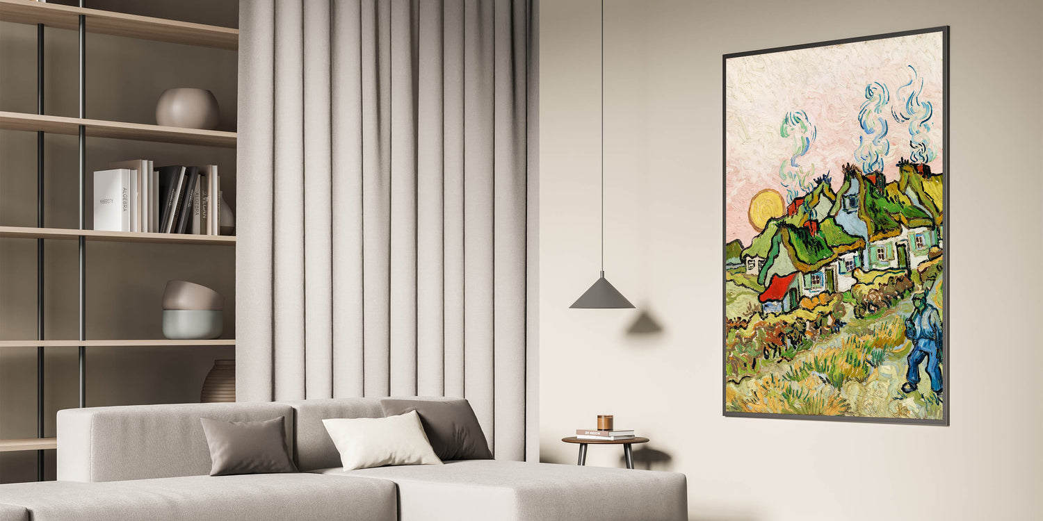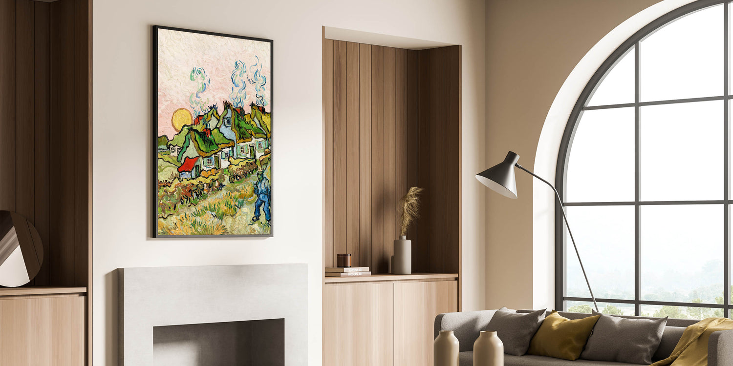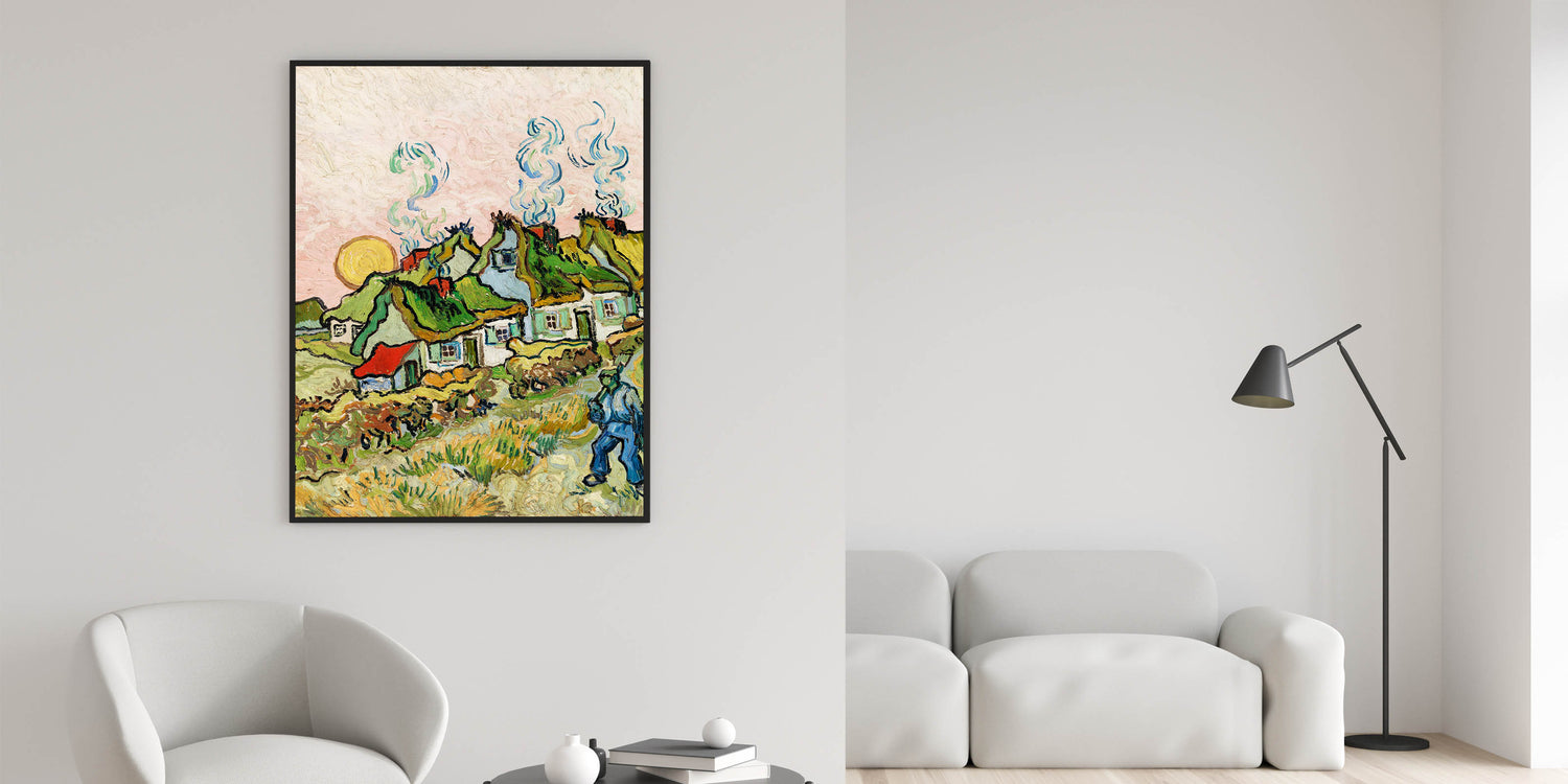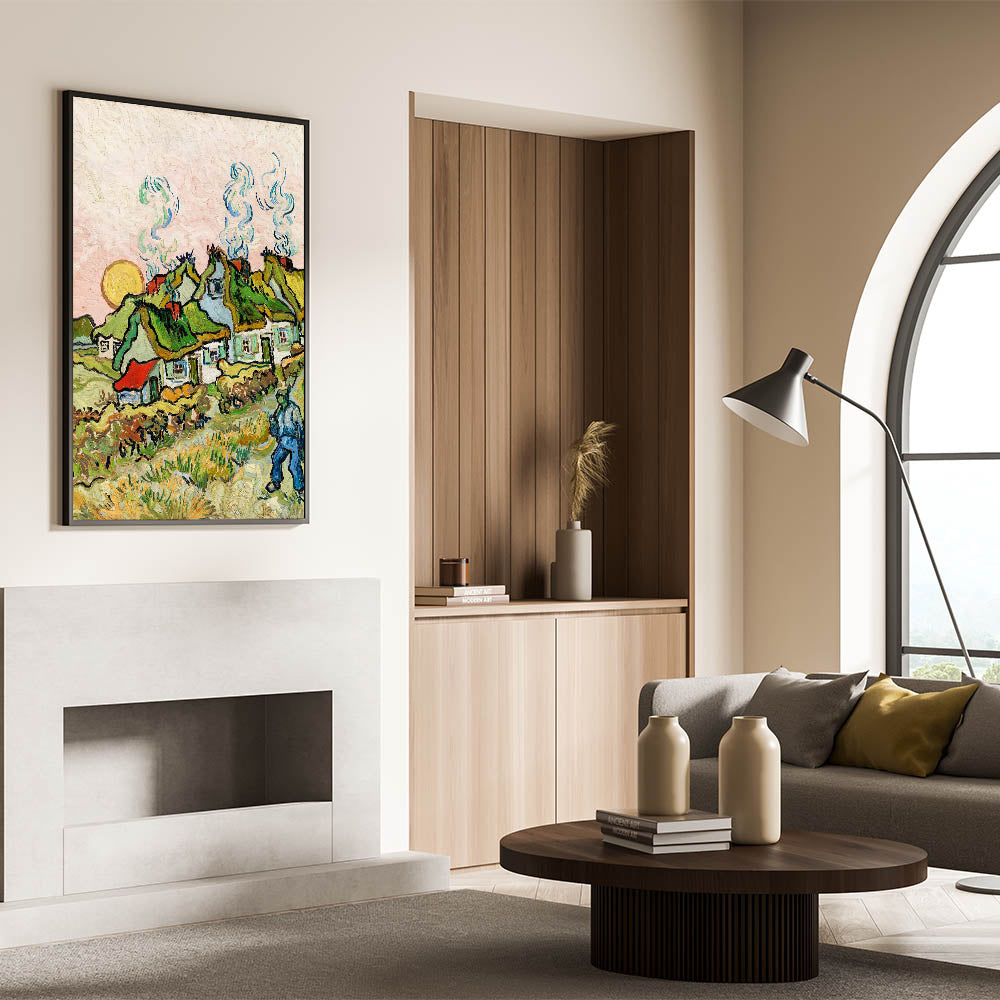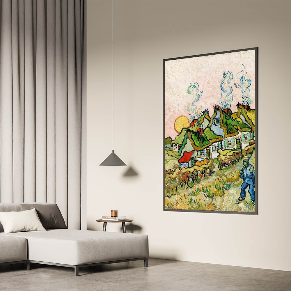 Add a touch of rustic charm to your interior with Van Gogh canvas prints, featuring the vibrant Thatched Cottages and Trees. This masterpiece reflects Van Gogh's love for rural landscapes, with lush green fields, quaint cottages, and a glowing sun that radiates warmth and tranquility. Perfectly blending natural beauty with bold brushstrokes, this artwork will bring life and character to any space.