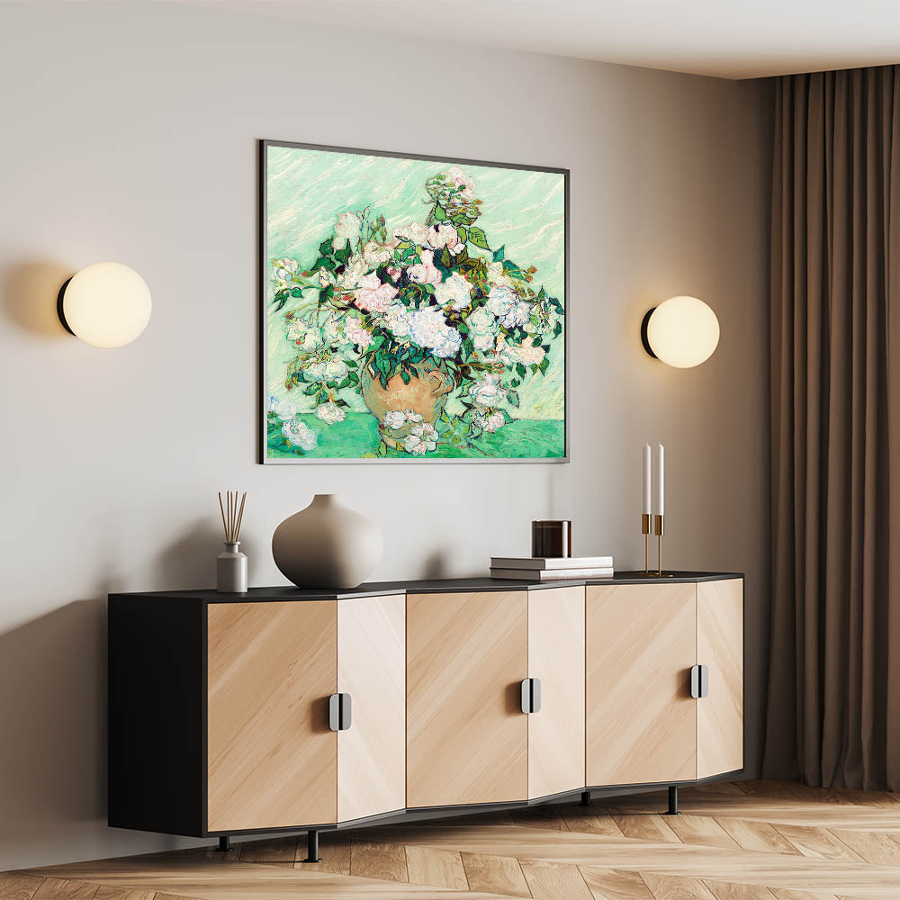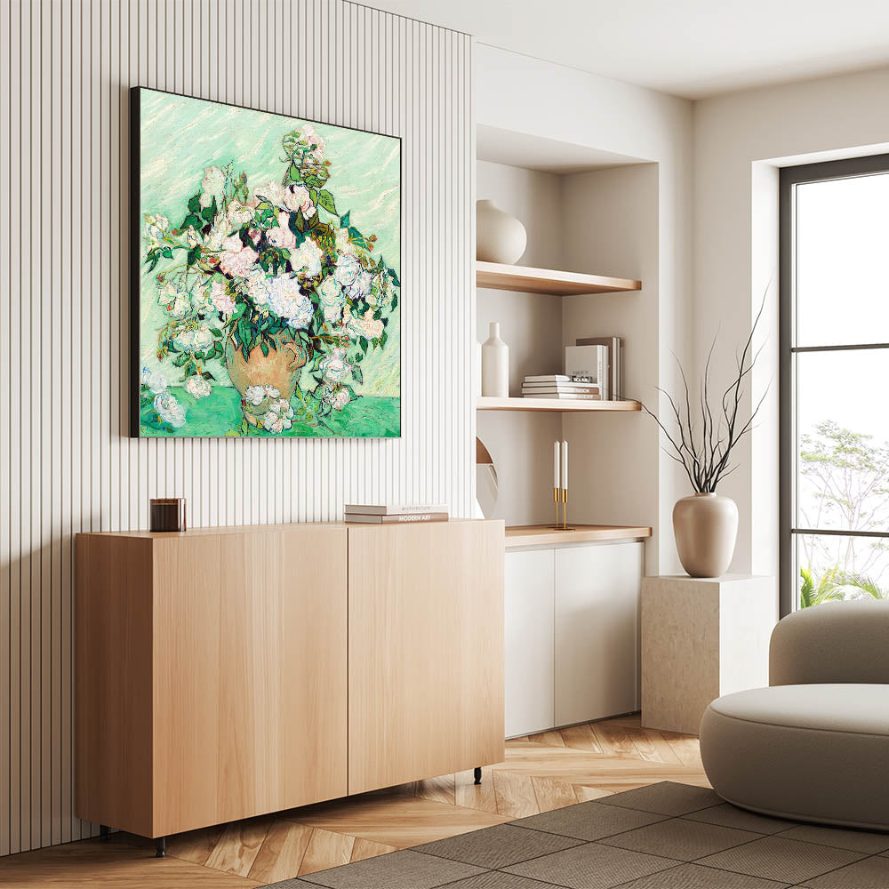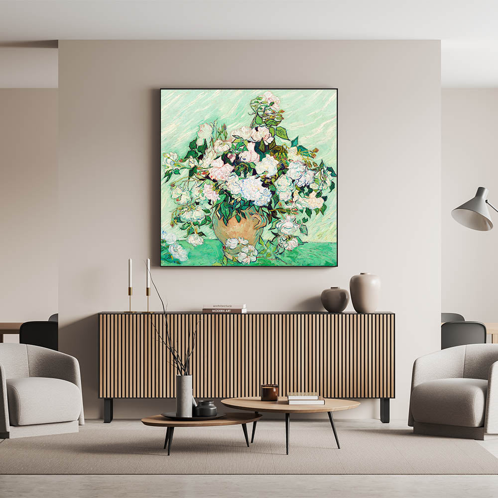 - Iconic Artwork: Features Van Gogh's delicate brushstrokes and pastel tones, beautifully depicting a vase of roses.
