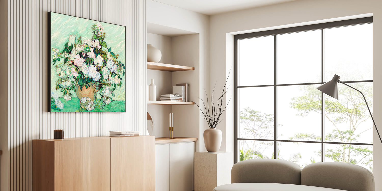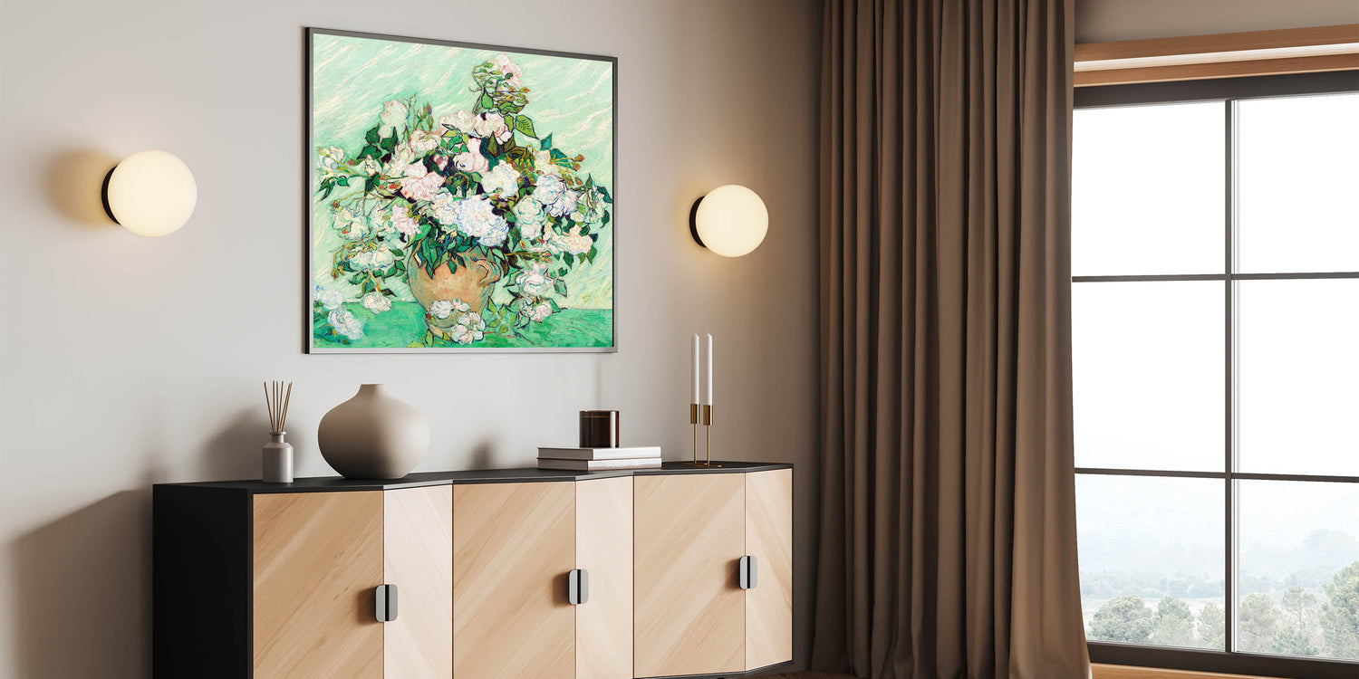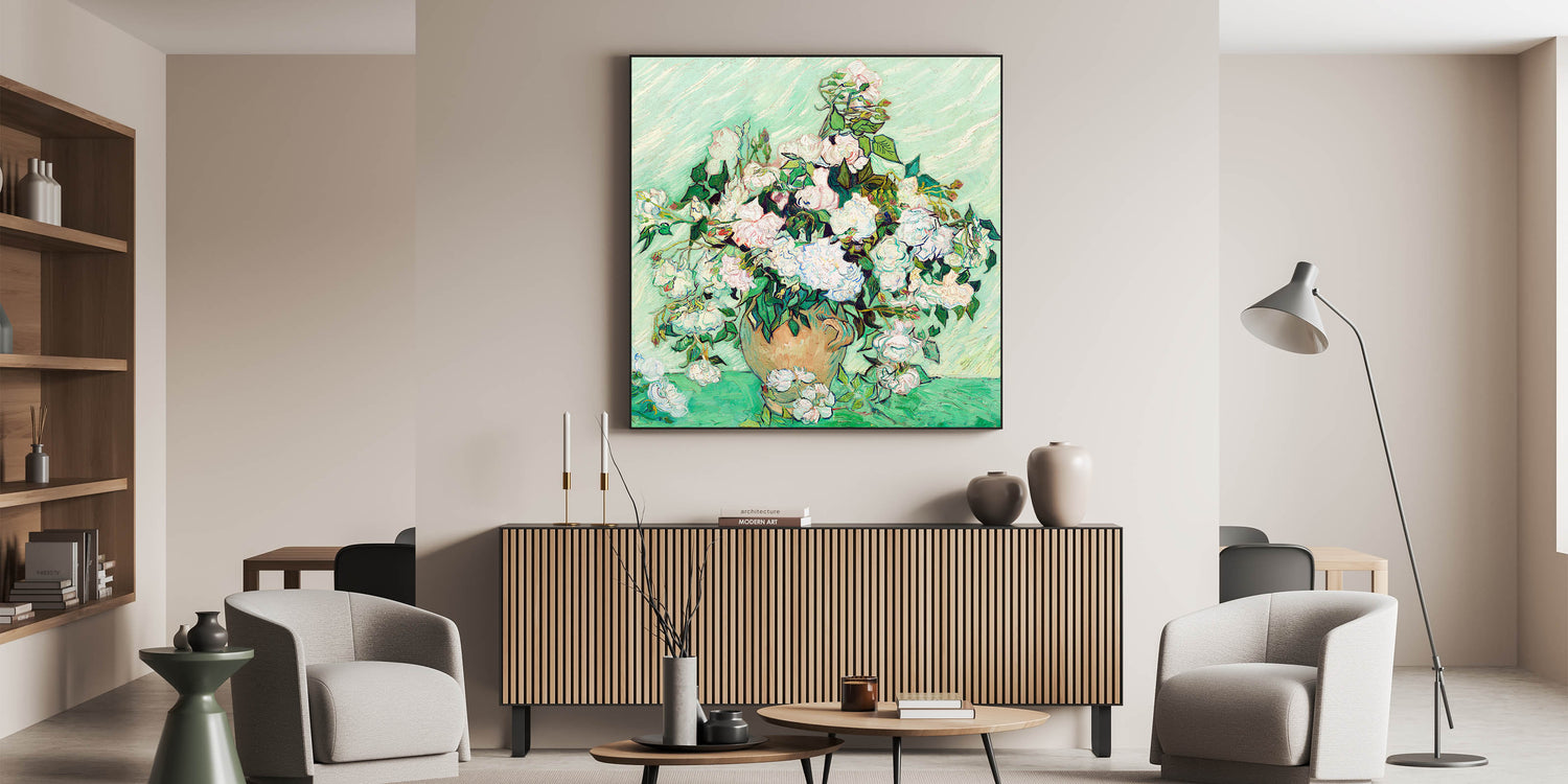 - Iconic Artwork: Features Van Gogh's delicate brushstrokes and pastel tones, beautifully depicting a vase of roses.