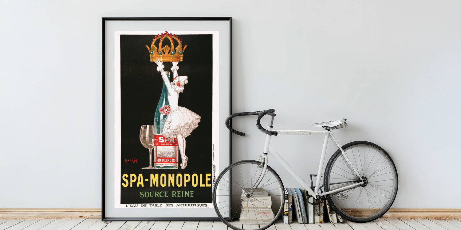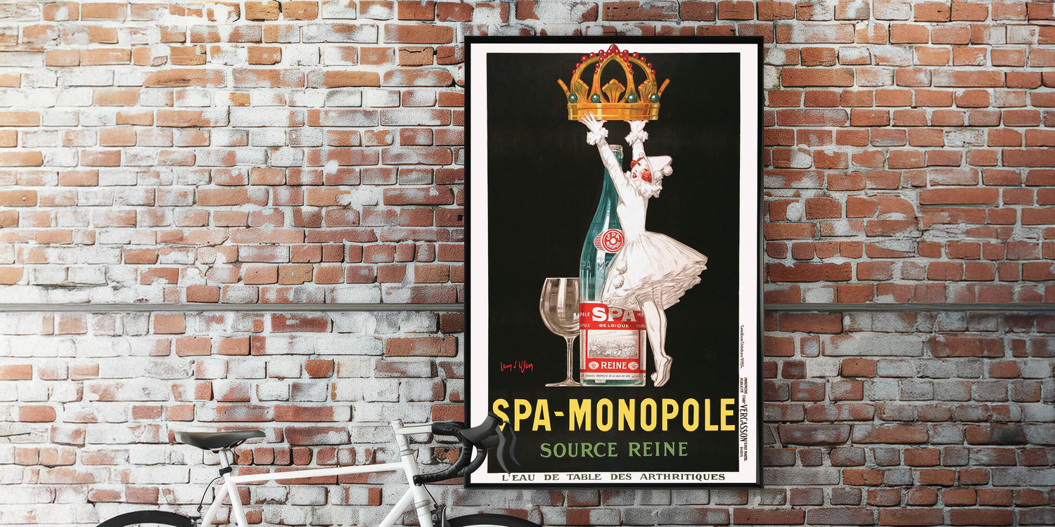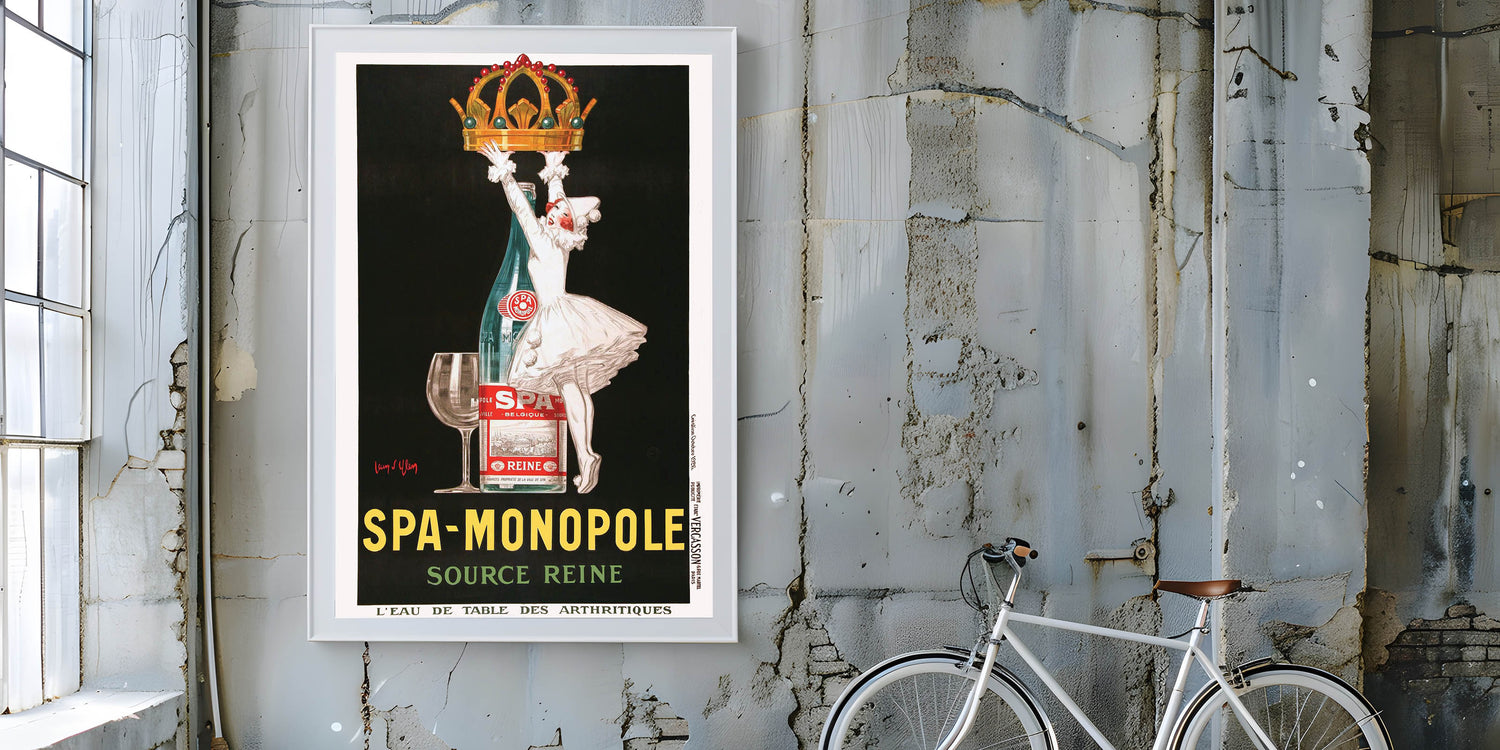 Bring a touch of nostalgia to your home with this Vintage Advertising Poster featuring the iconic Spa Monopole mineral water ad. This classic vintage ad showcases a whimsical design with a ballerina gracefully placing a golden crown on a sparkling water bottle, embodying elegance and historical charm.