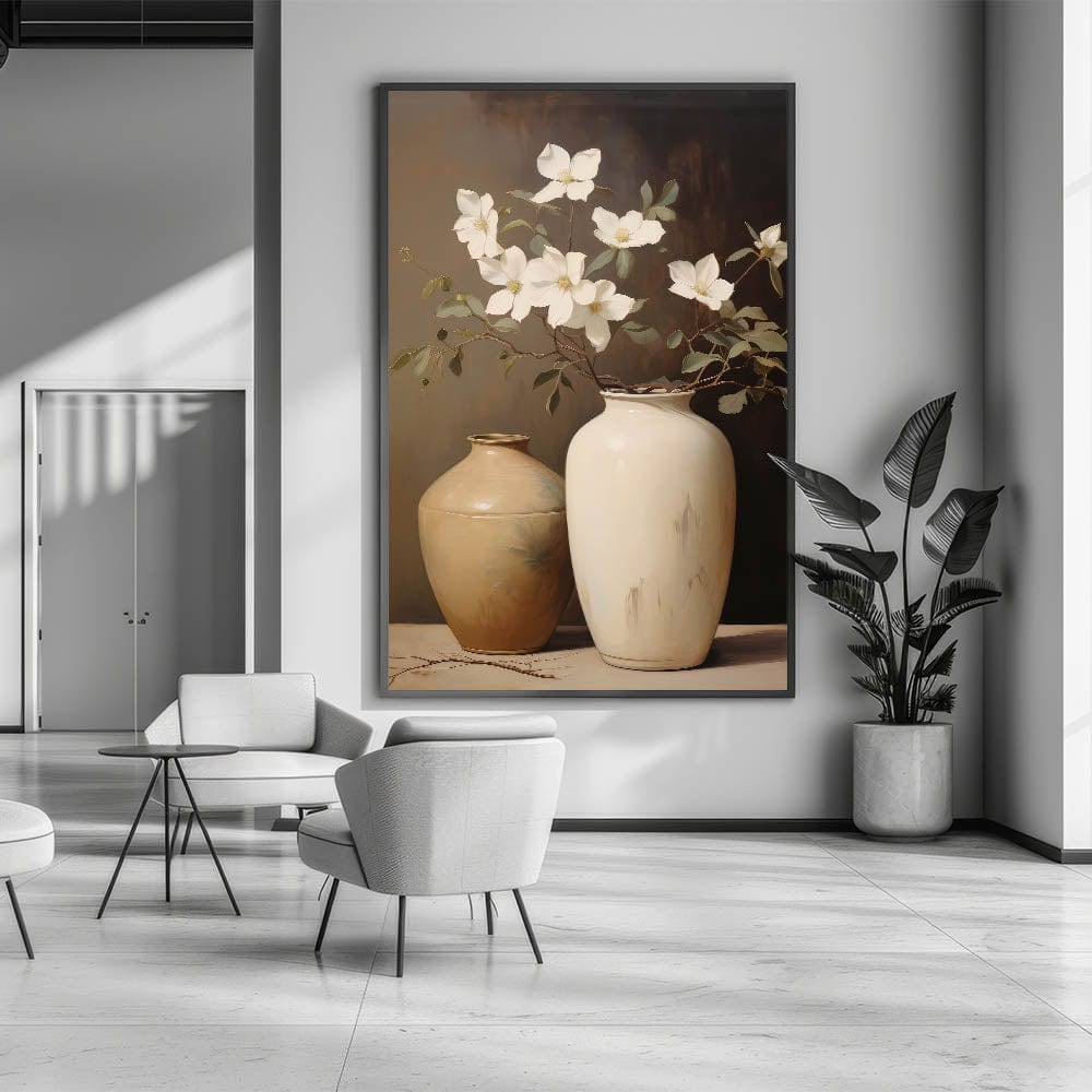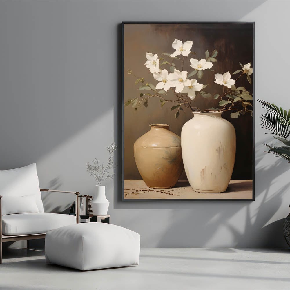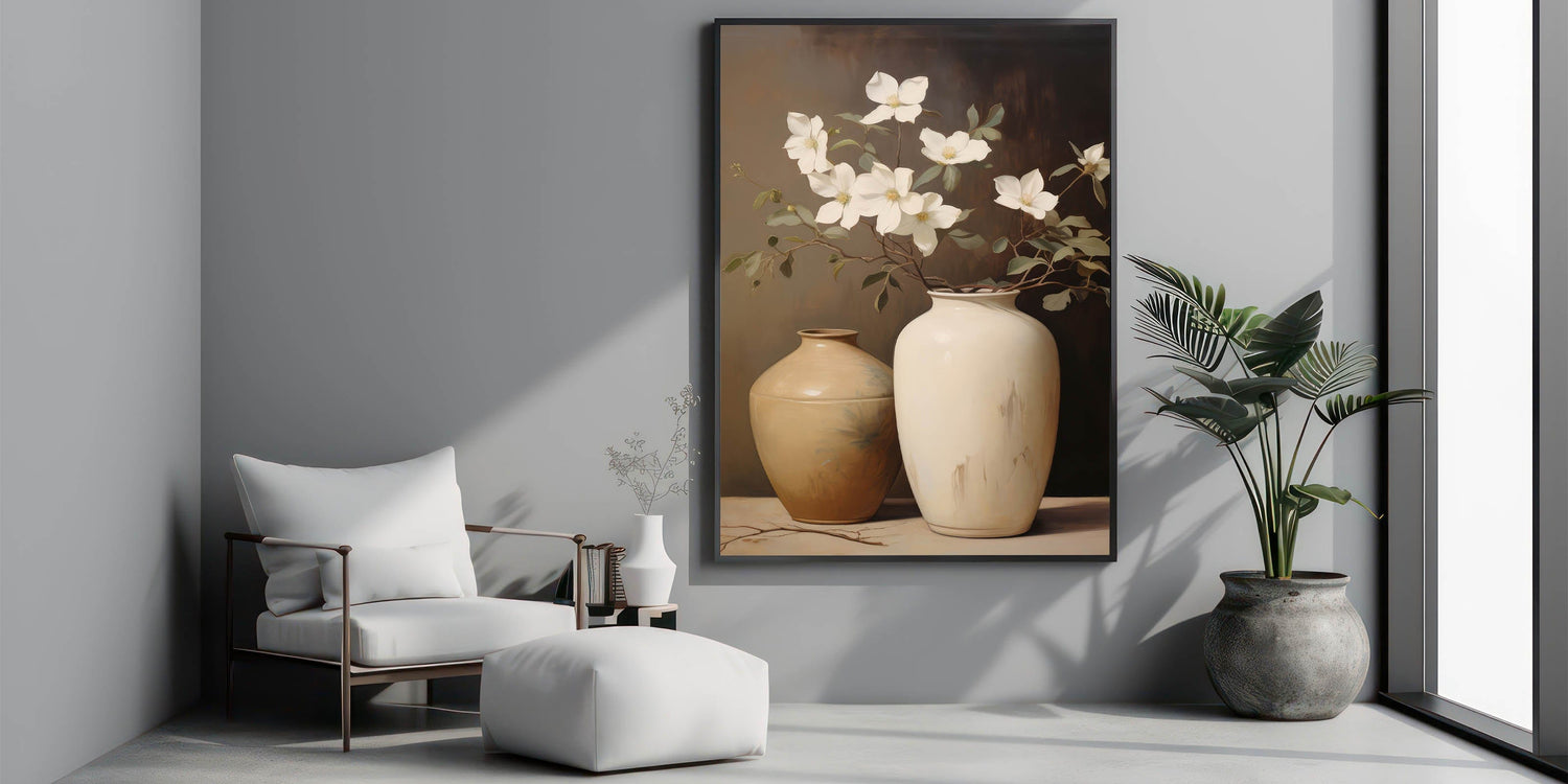 This vintage botanical art print captures the elegance of magnolia flowers gracefully arranged in two ceramic vases. The soft, muted tones of the vases complement the delicate white magnolias, creating a peaceful and sophisticated atmosphere. Ideal for those who appreciate the beauty of nature captured in classic still life, this print will add a touch of timeless charm to any room. Whether you're drawn to botanical illustration art or vintage style decor, this piece brings serenity and refinement into your home.