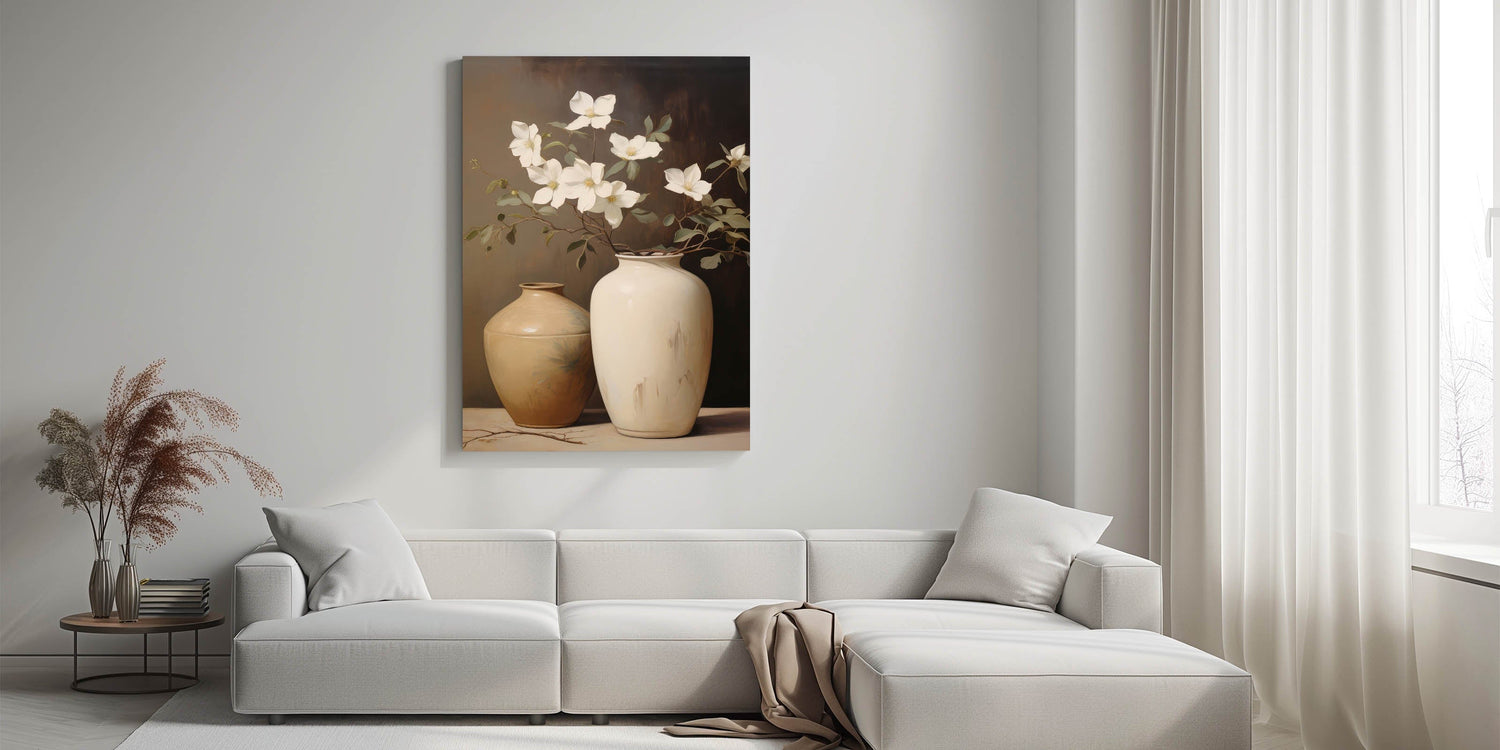 - Features elegant white magnolia flowers in soft beige and neutral vases