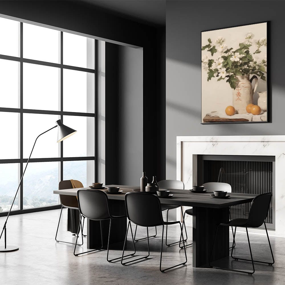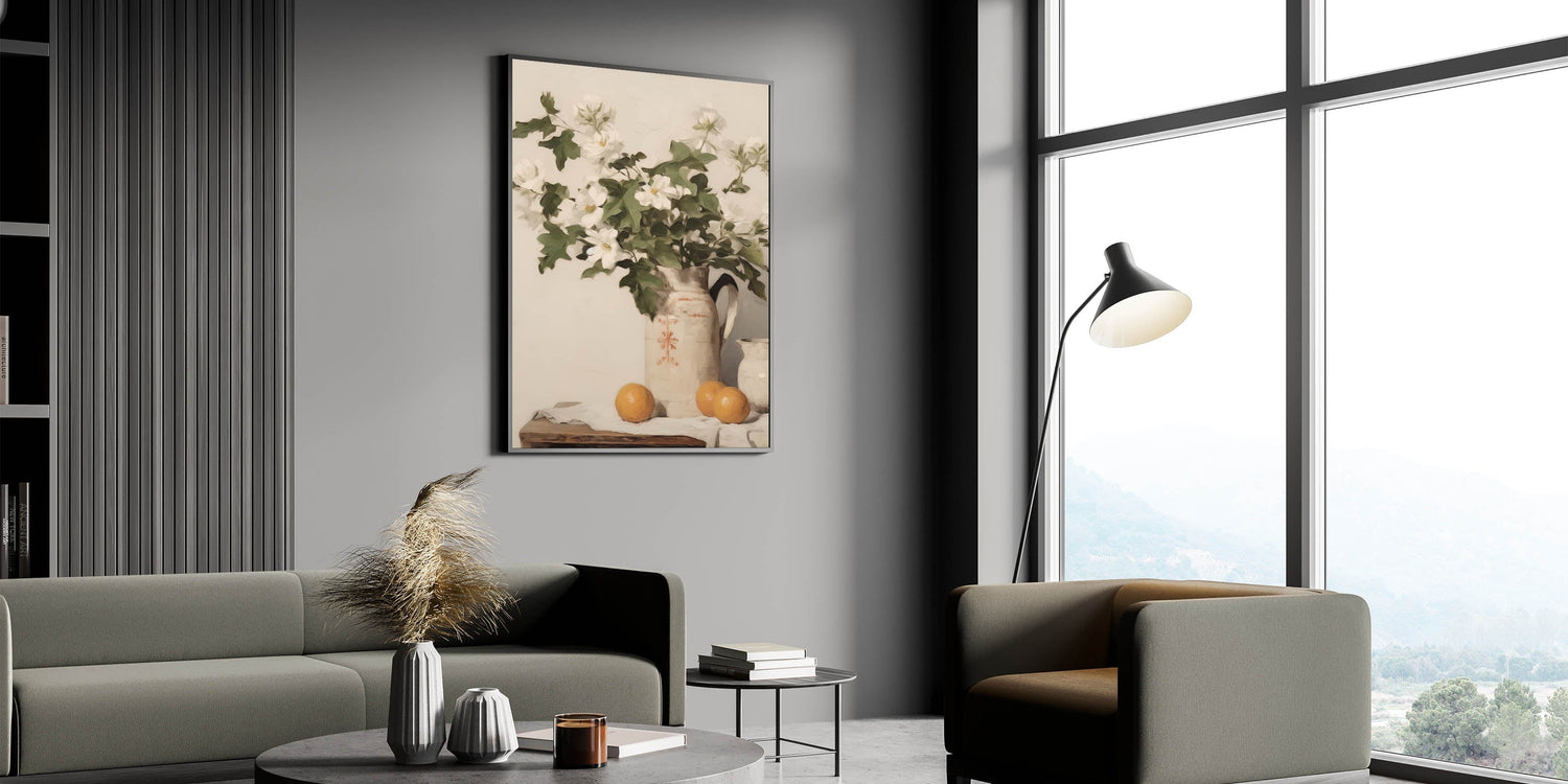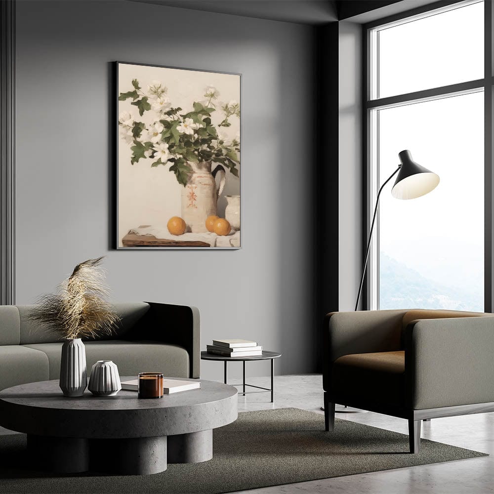 This Vintage Botanical Art Print features an elegant arrangement of white flowers in a rustic pitcher, set alongside two oranges. The soft, muted tones and delicate brushstrokes create a serene and timeless piece, making it perfect for vintage-style or nature-inspired decor. The gentle color palette and natural subject matter evoke a sense of tranquility, ideal for brightening up your home or office.