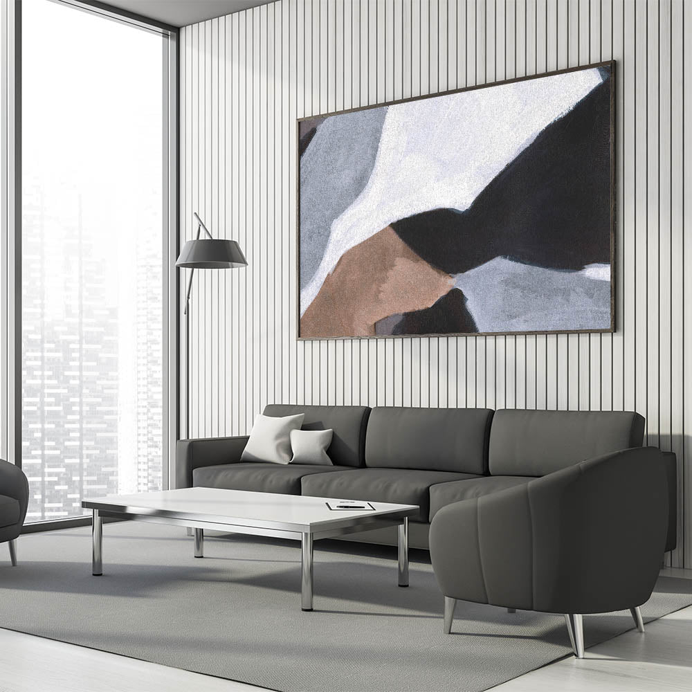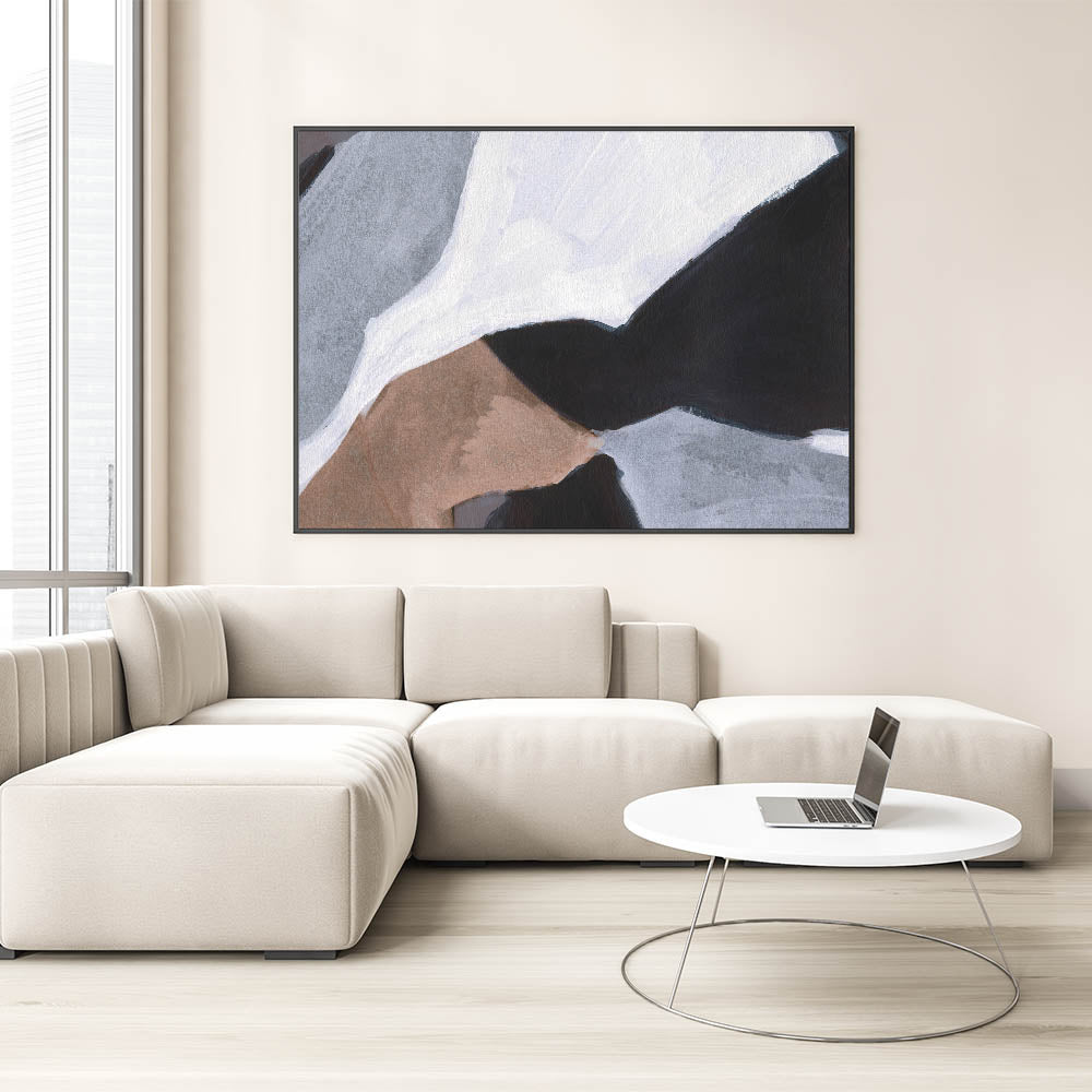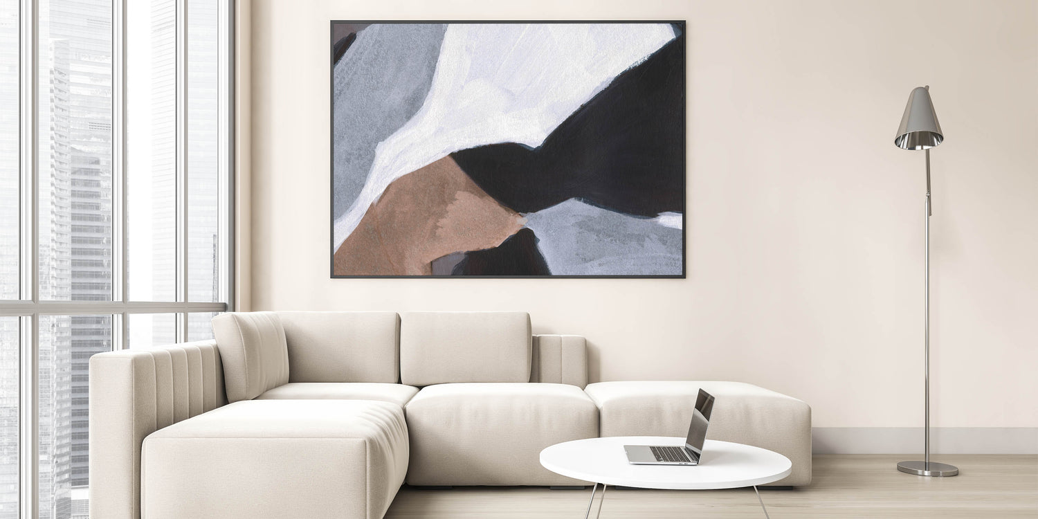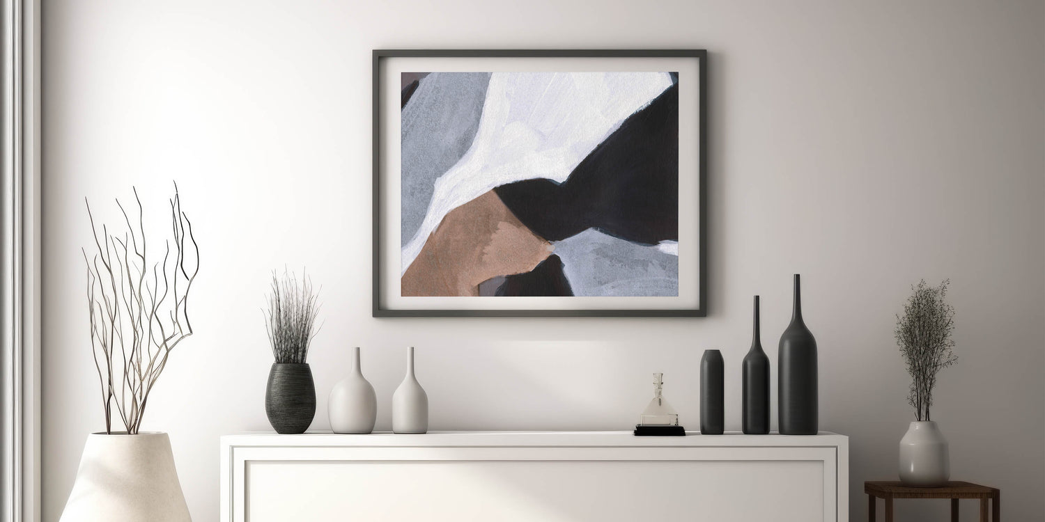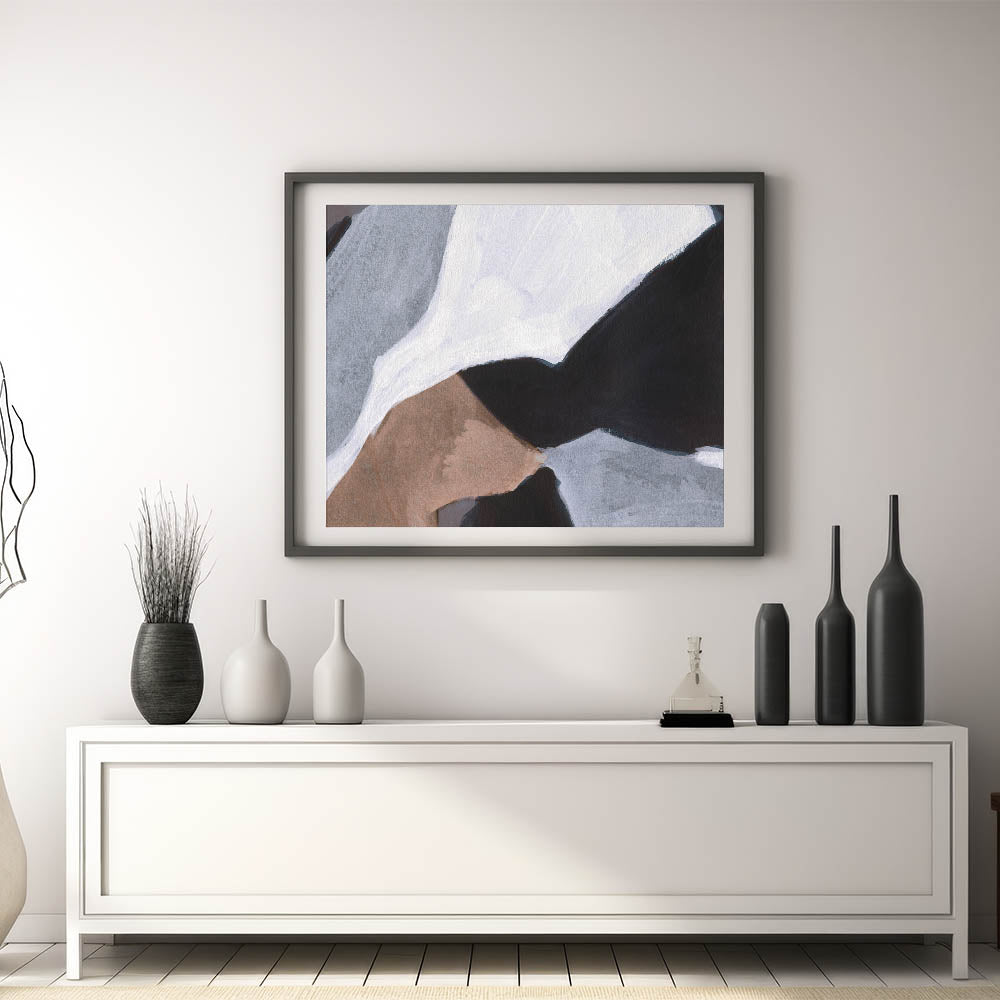 This modern abstract wall art blends earthy and monochrome tones to create a harmonious balance of form and texture. Featuring fluid geometric shapes in black, white, gray, and brown, this piece evokes a sense of movement and depth, making it a versatile addition to any contemporary space. As part of the modern abstract art collection, this artwork complements a range of interior styles, from minimalist and industrial to bohemian and modern chic.