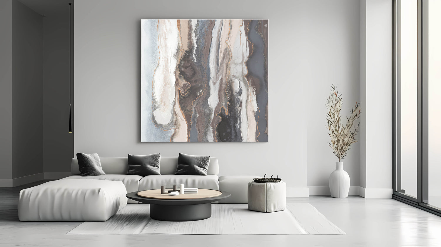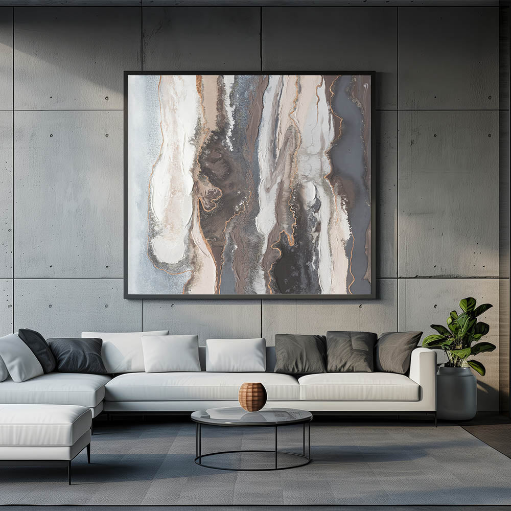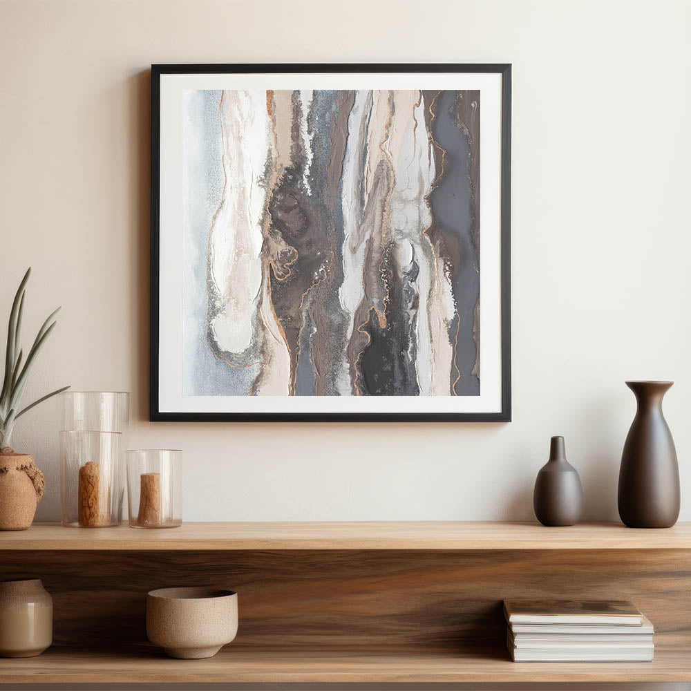 Introduce a sense of organic beauty to your space with this serene landscape photography print. Featuring an abstract representation of earthy tones, rich browns, deep blacks, and soft beiges, this artwork captures the essence of tranquil nature scenes with a sophisticated and modern appeal. The flowing textures and natural color palette make it a perfect statement piece for contemporary interiors.