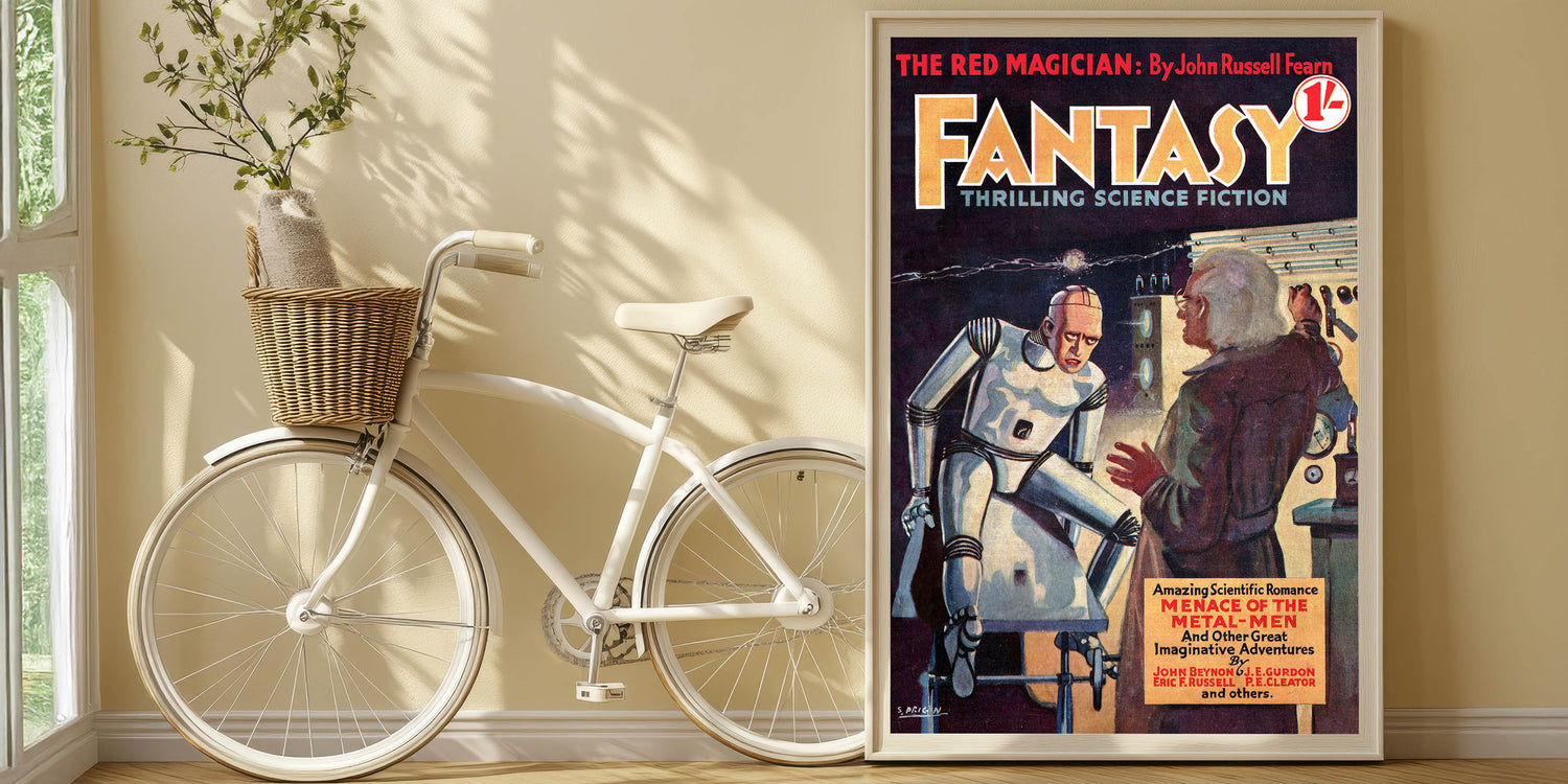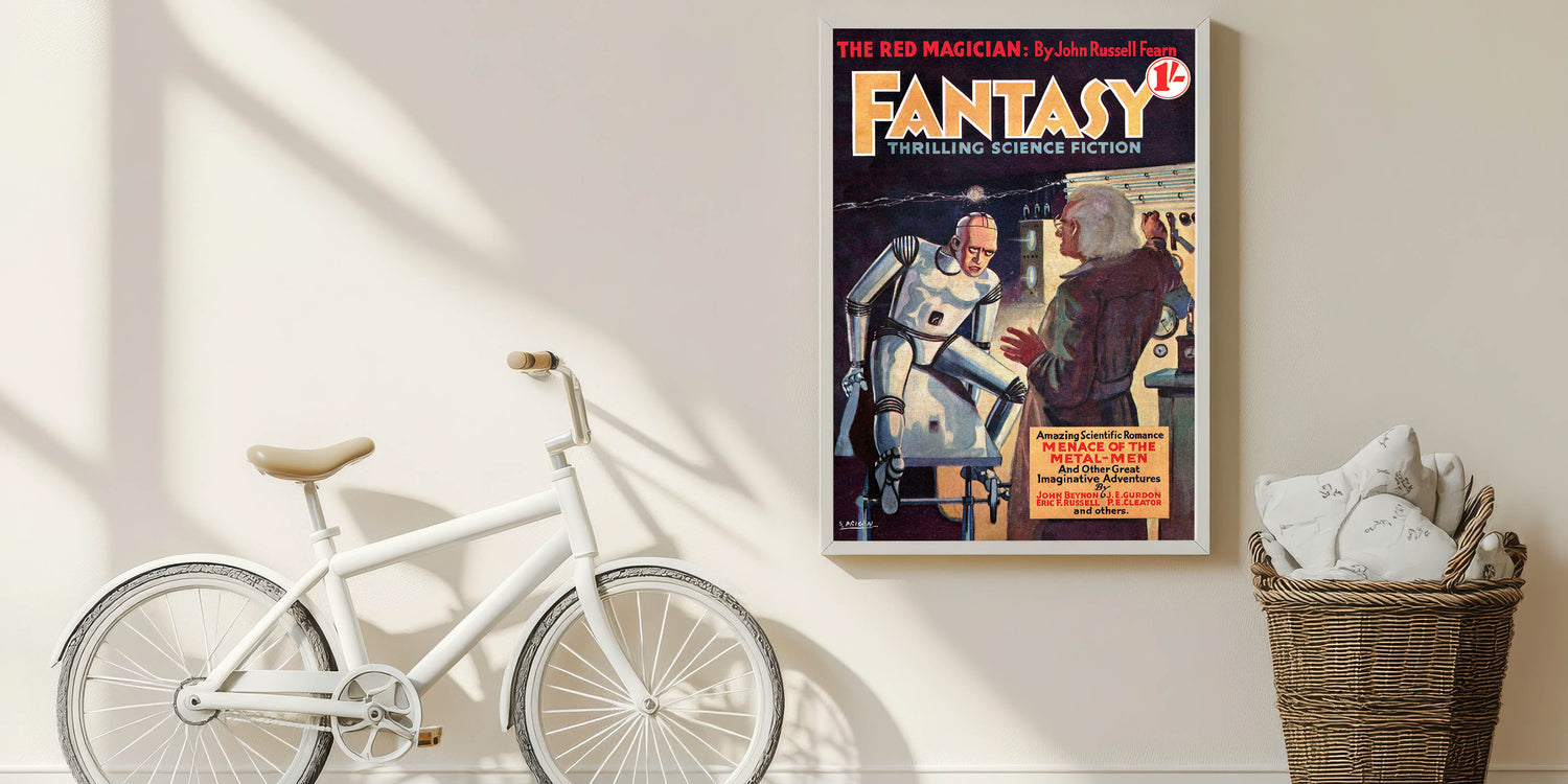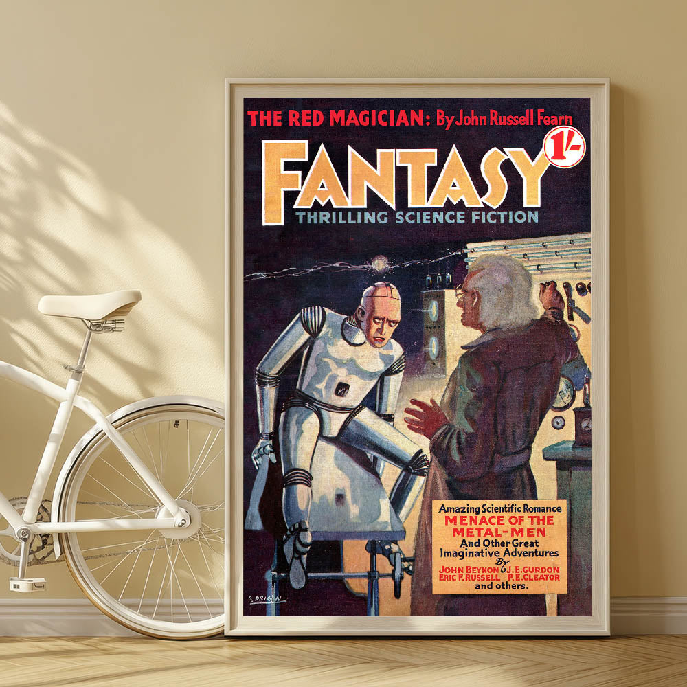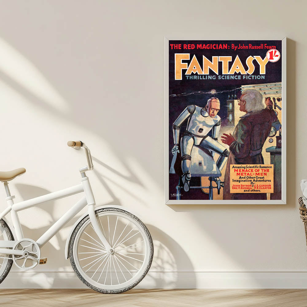 Step into the golden age of science fiction with this vintage magazine cover wall art featuring a thrilling robotic encounter. This classic magazine cover artwork from the 1930s showcases an eerie humanoid robot and a scientist in a dramatic confrontation, embodying the era’s fascination with futuristic technology. A perfect addition to any nostalgic vintage decor prints collection, this artwork blends bold illustration with retro sci-fi storytelling.