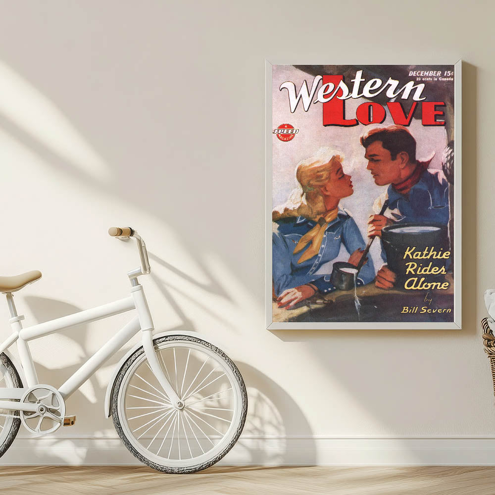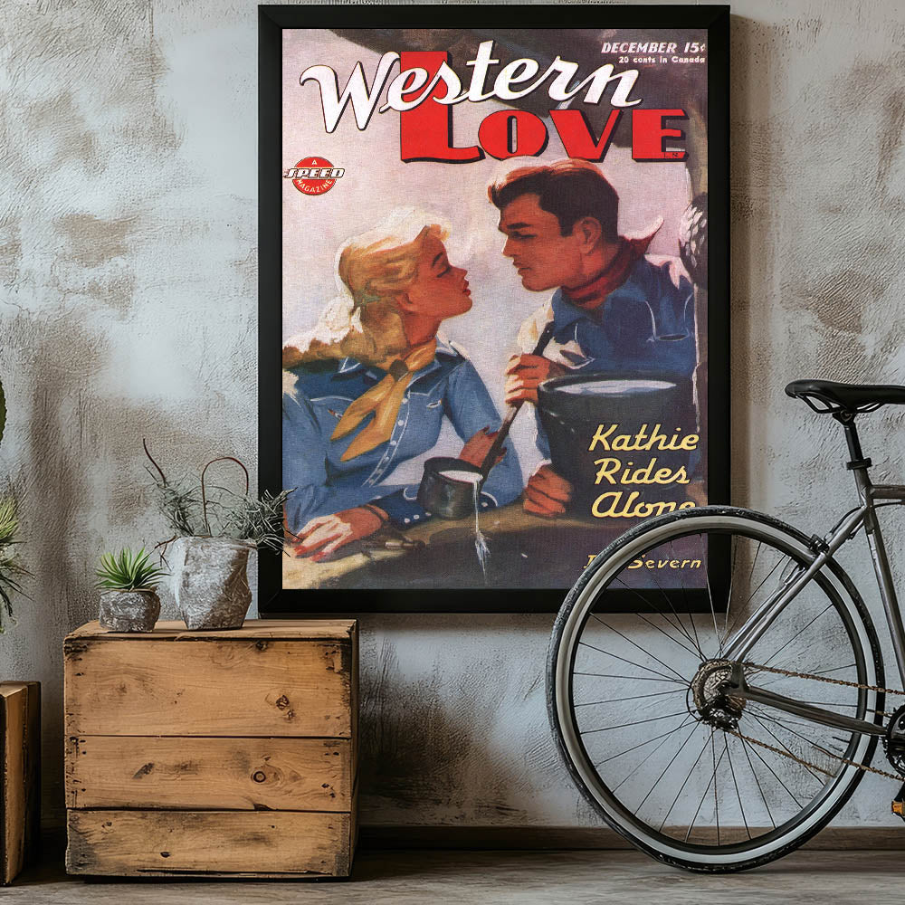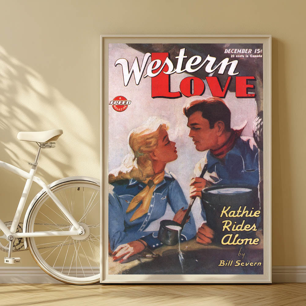 This retro magazine cover print adds warmth and charm to any space. Whether displayed as a centerpiece or part of a collectible magazine cover collection, it embodies the passion and adventure of classic Western love stories.