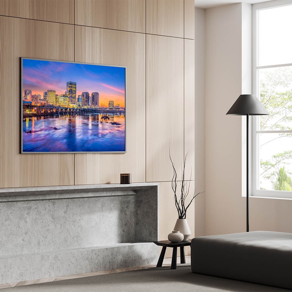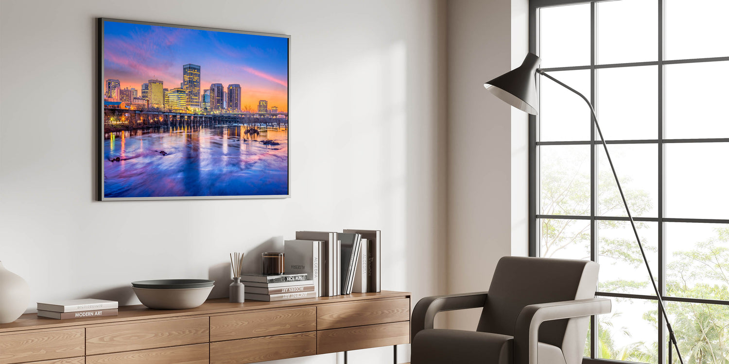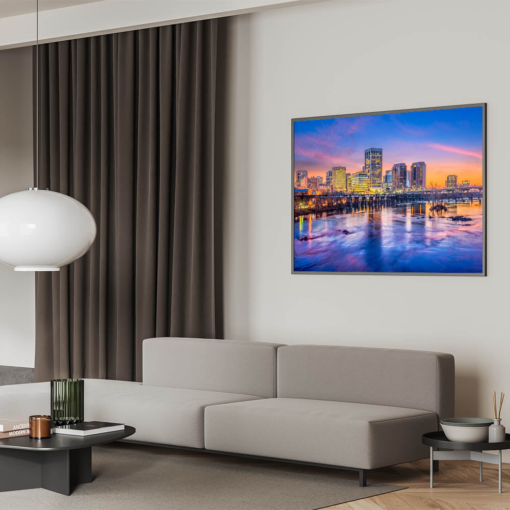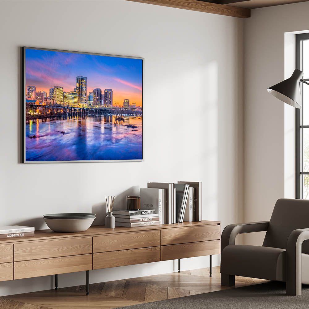 Bring the energy and vibrancy of Richmond, Virginia into your space with this beautiful Richmond skyline wall art, showcasing the city's iconic buildings during a breathtaking sunset. The vivid hues of the sky, combined with the reflections on the James River, create a dramatic scene that perfectly blends urban life with natural beauty. This Virginia cityscape photography is ideal for anyone looking to add a touch of modern sophistication to their home or office decor.