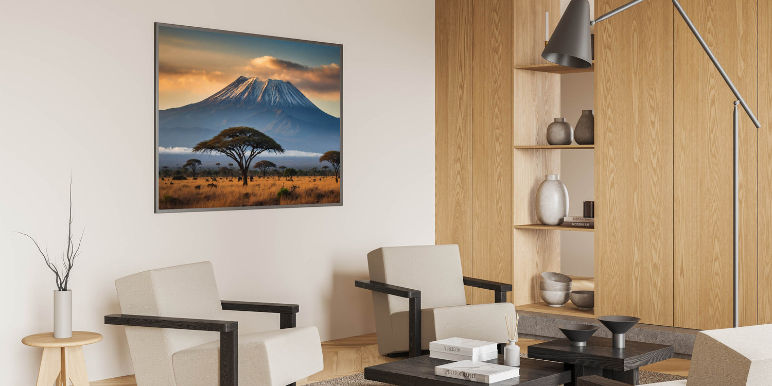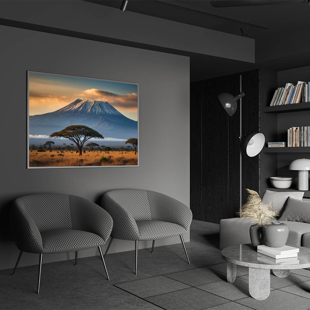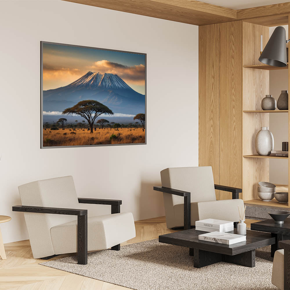 Capture the essence of the African wilderness with our African Volcano Landscape Art. This stunning artwork features a majestic volcanic mountain rising above the expansive savanna, with iconic acacia trees dotting the landscape. The soft golden hues of the sunset enhance the dramatic contrast between the mountain's snowy peak and the warm, earthy tones below. This piece is perfect for those who love the beauty of Africa and want to bring a touch of its wild, untamed spirit into their home.