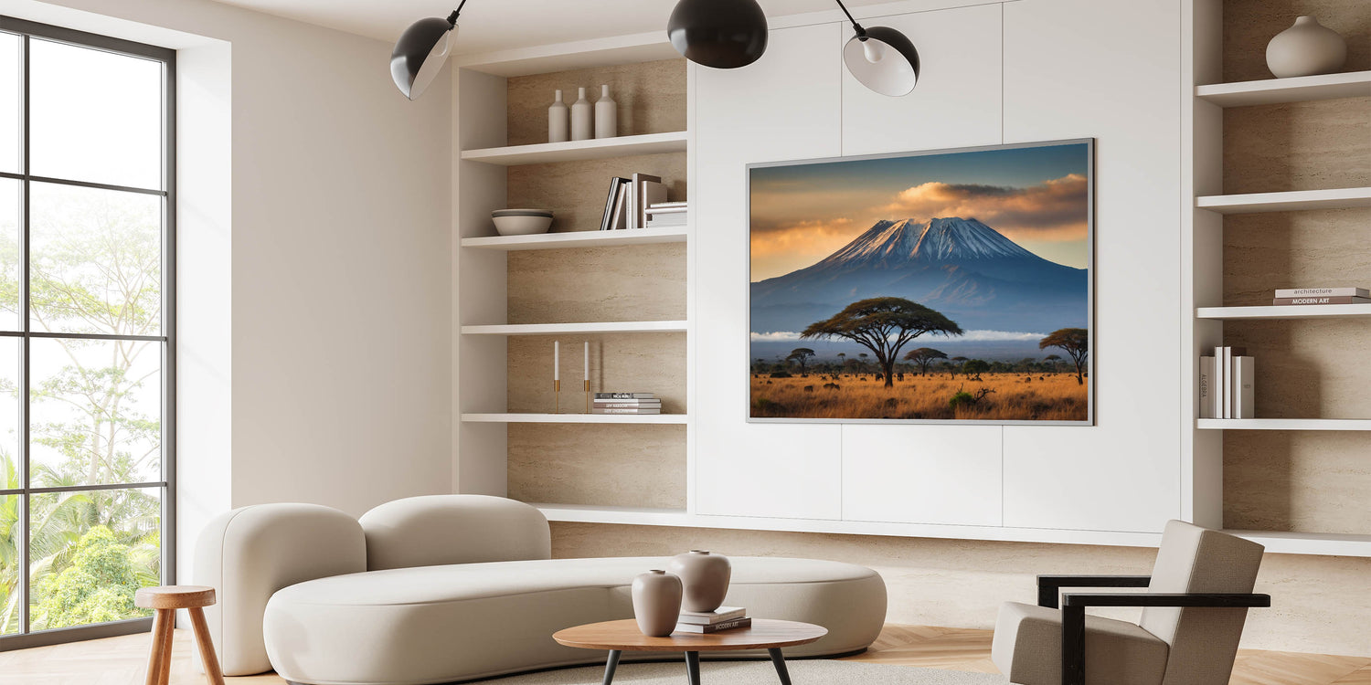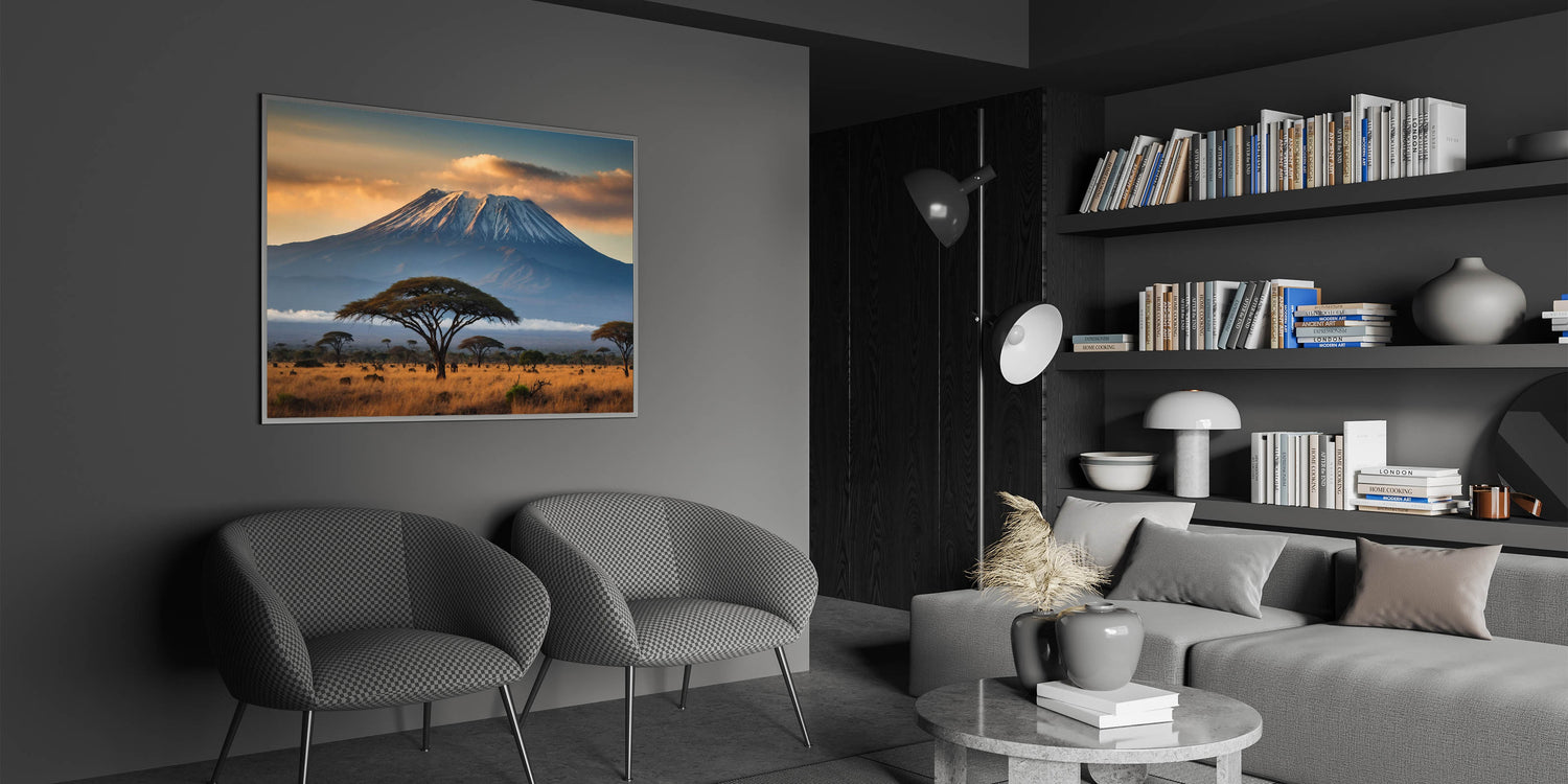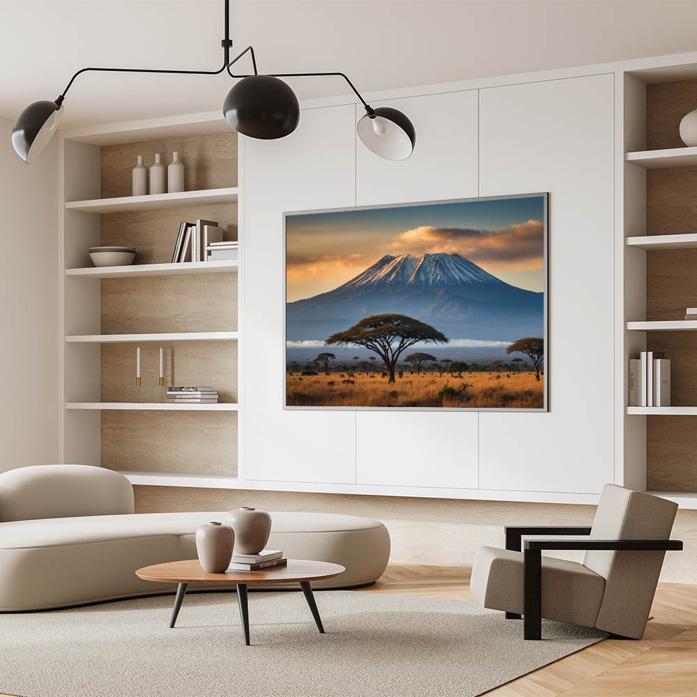 Capture the essence of the African wilderness with our African Volcano Landscape Art. This stunning artwork features a majestic volcanic mountain rising above the expansive savanna, with iconic acacia trees dotting the landscape. The soft golden hues of the sunset enhance the dramatic contrast between the mountain's snowy peak and the warm, earthy tones below. This piece is perfect for those who love the beauty of Africa and want to bring a touch of its wild, untamed spirit into their home.