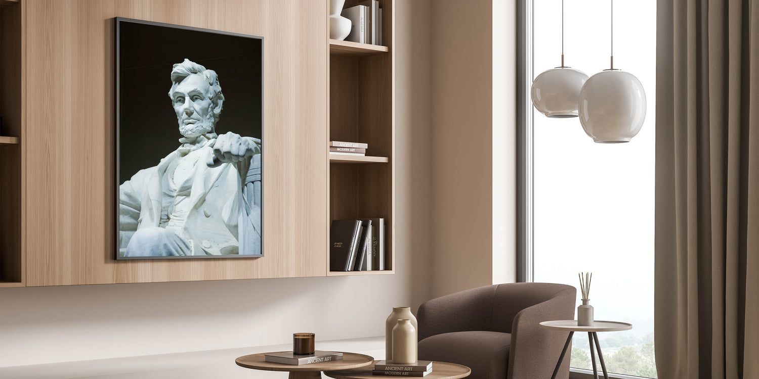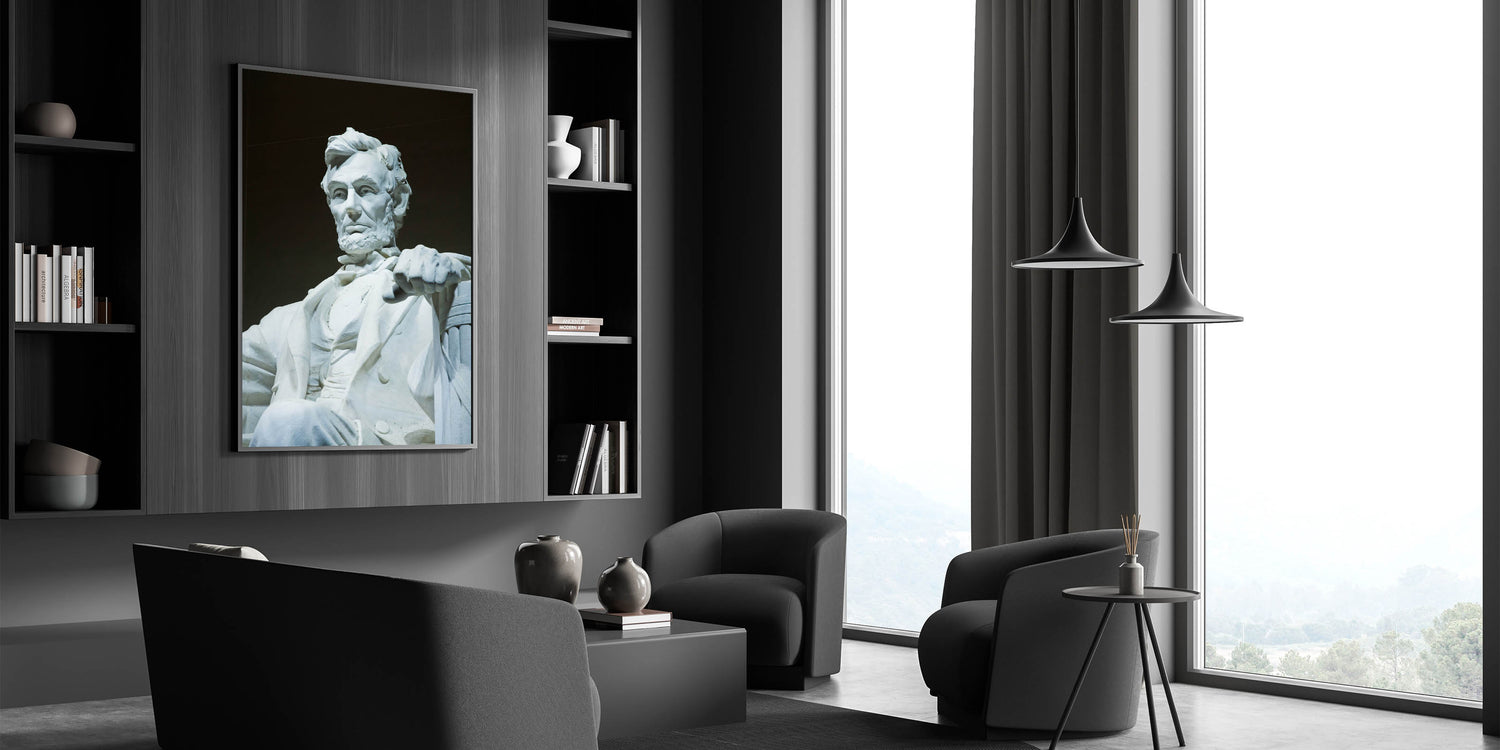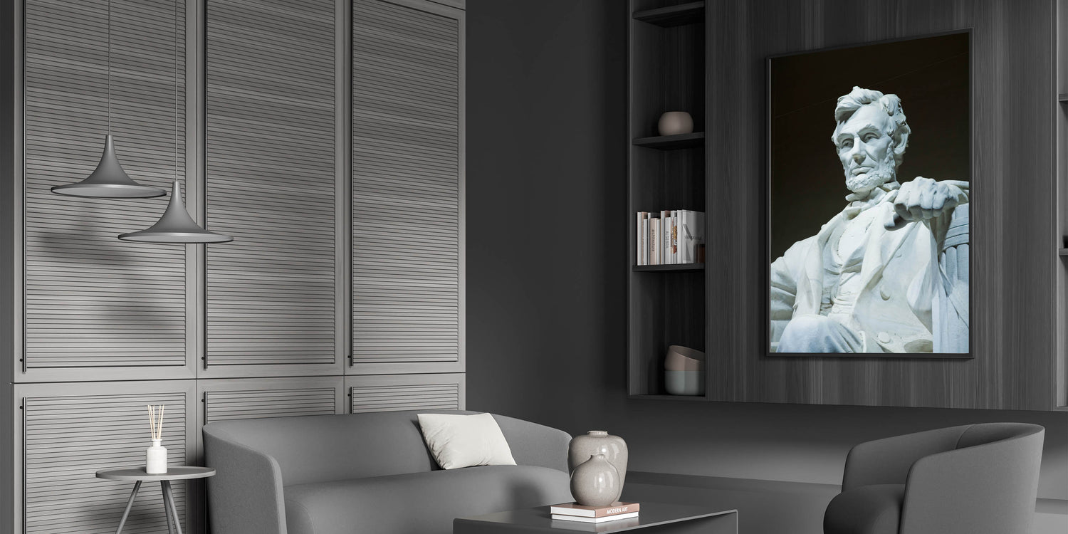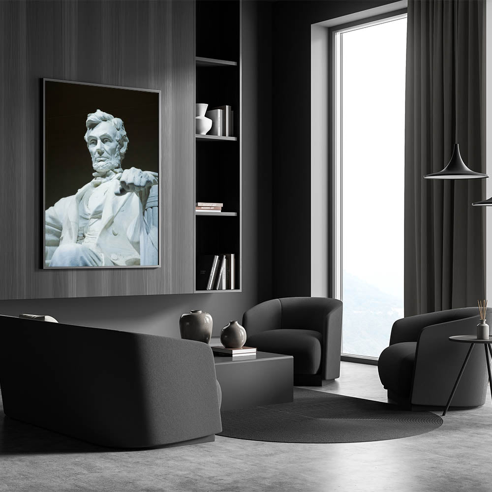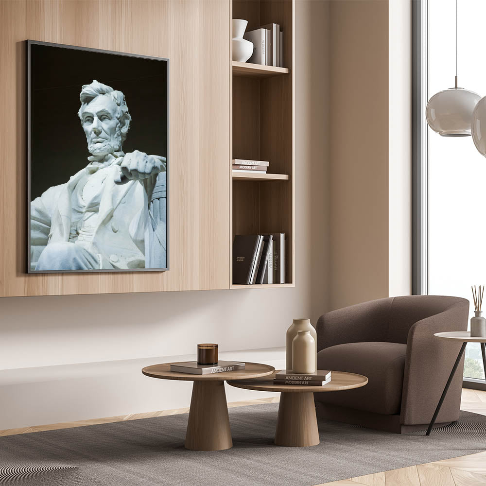 Bring home a powerful piece of American history with this striking Close-Up Abraham Lincoln Statue Wall Art. This high-resolution image captures the detailed craftsmanship of the Lincoln Memorial statue, showcasing the profound expression of Abraham Lincoln in a close-up view. The intricate marble features highlight the strength and leadership of the 16th president, making this artwork a perfect focal point for any home or office.