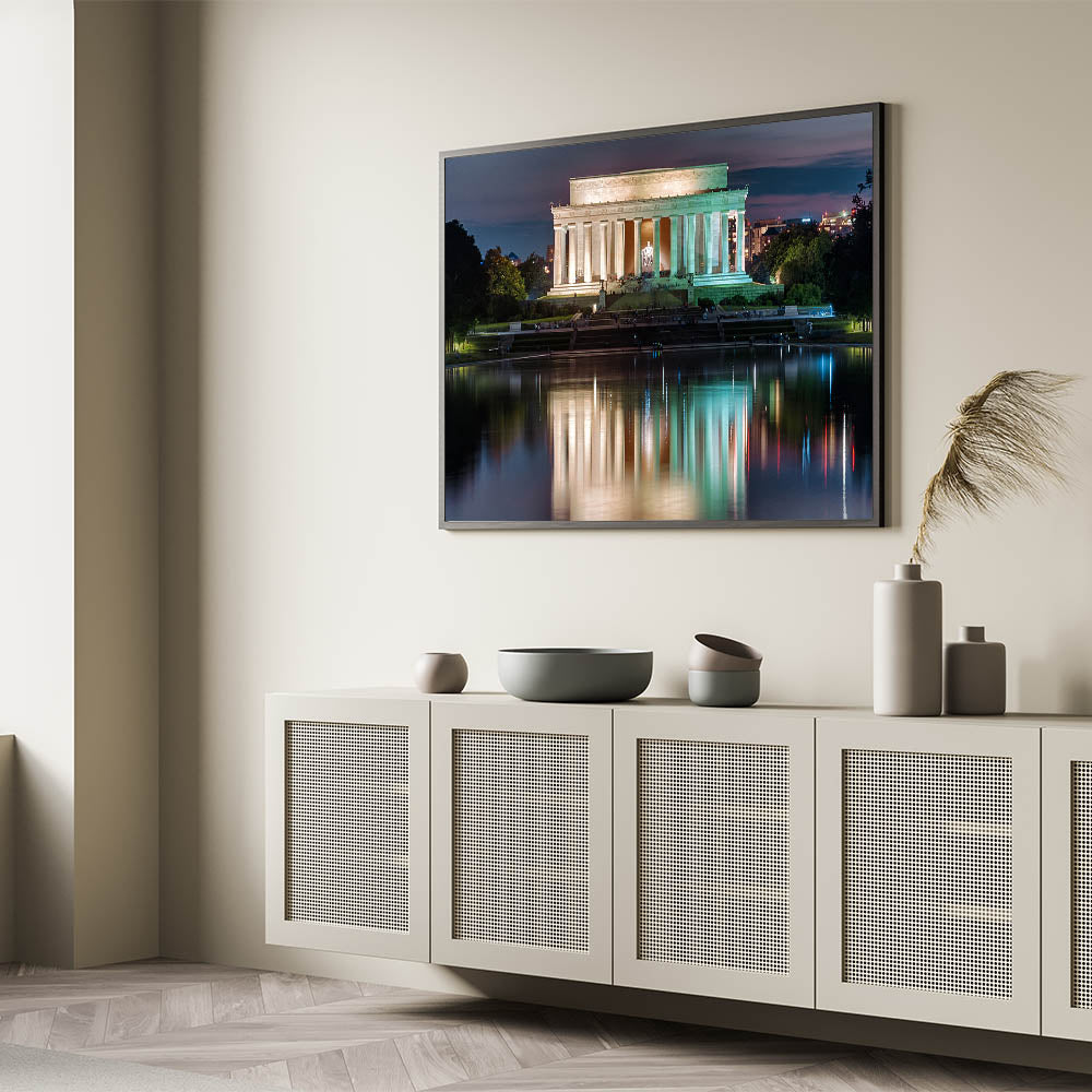 Experience the captivating beauty of the Lincoln Memorial reflected in the tranquil waters of the Reflecting Pool at night. This stunning Lincoln Memorial artwork captures the serene atmosphere of Washington D.C.’s iconic landmark in a unique light, offering a breathtaking view that is perfect for history enthusiasts and art lovers alike. Whether you're decorating your home or office, this piece will add a touch of elegance and meaning to any space.