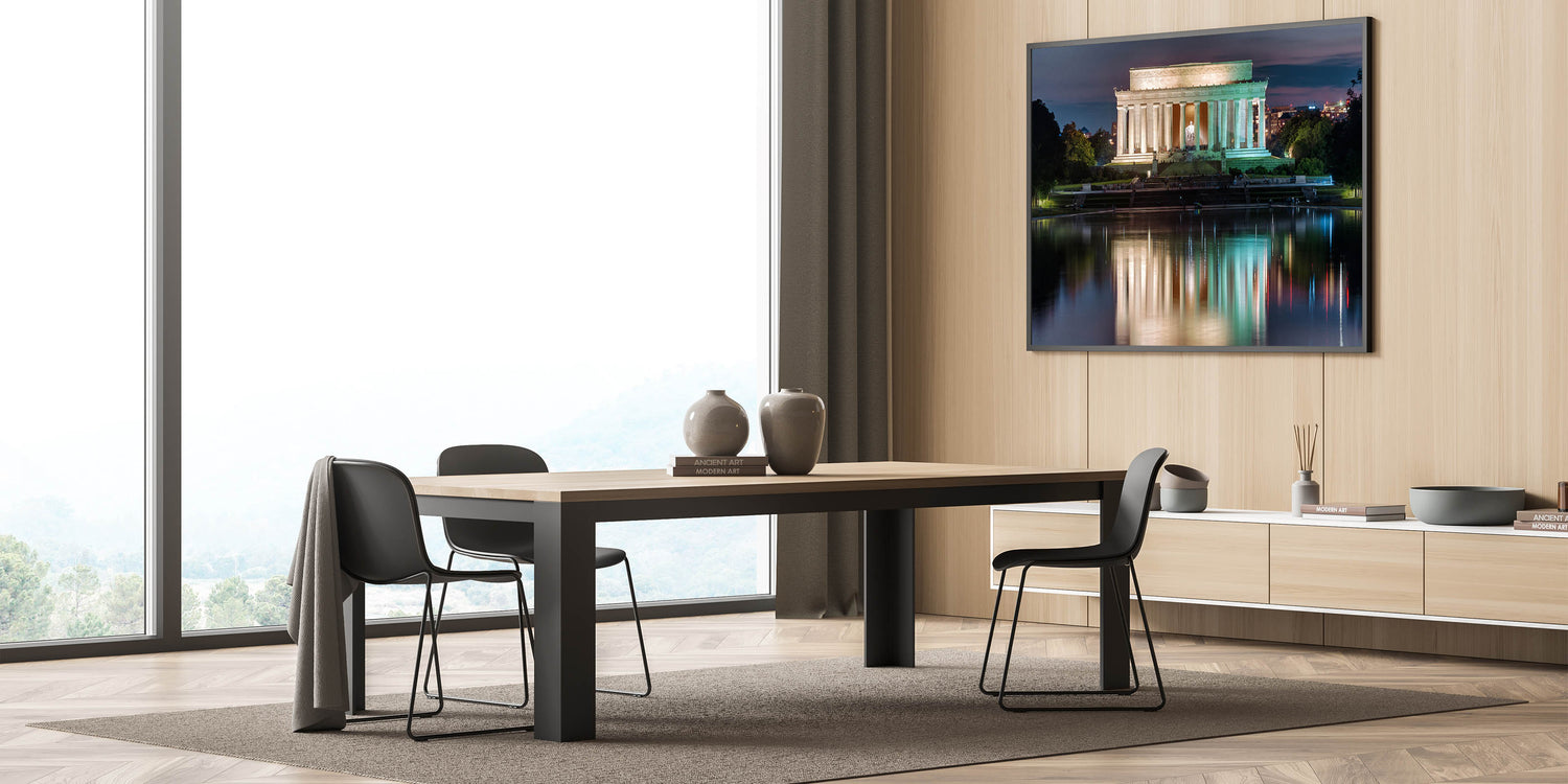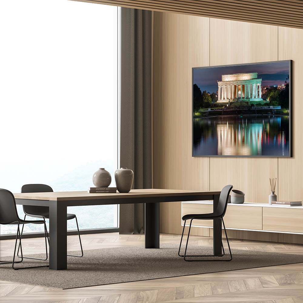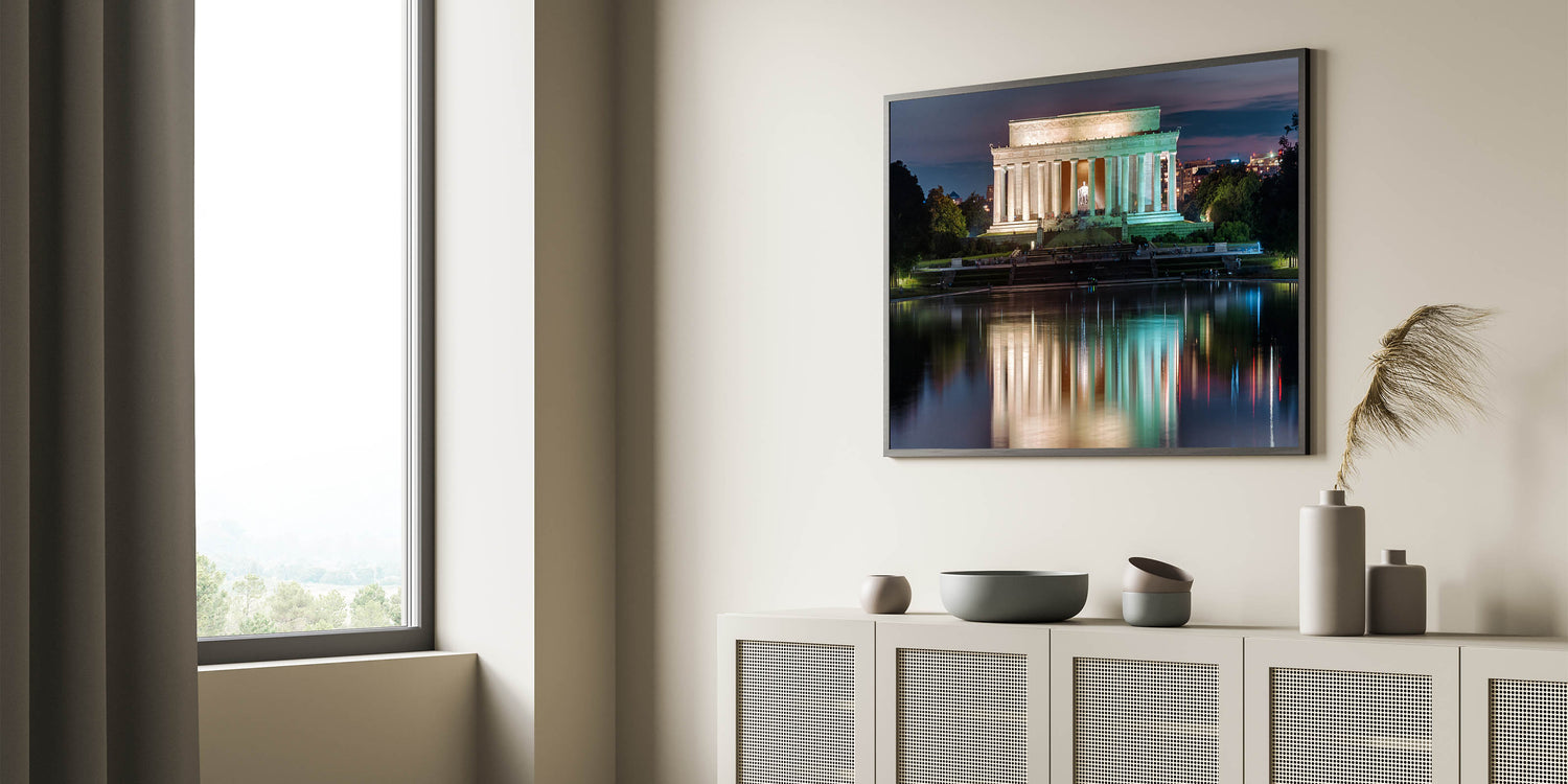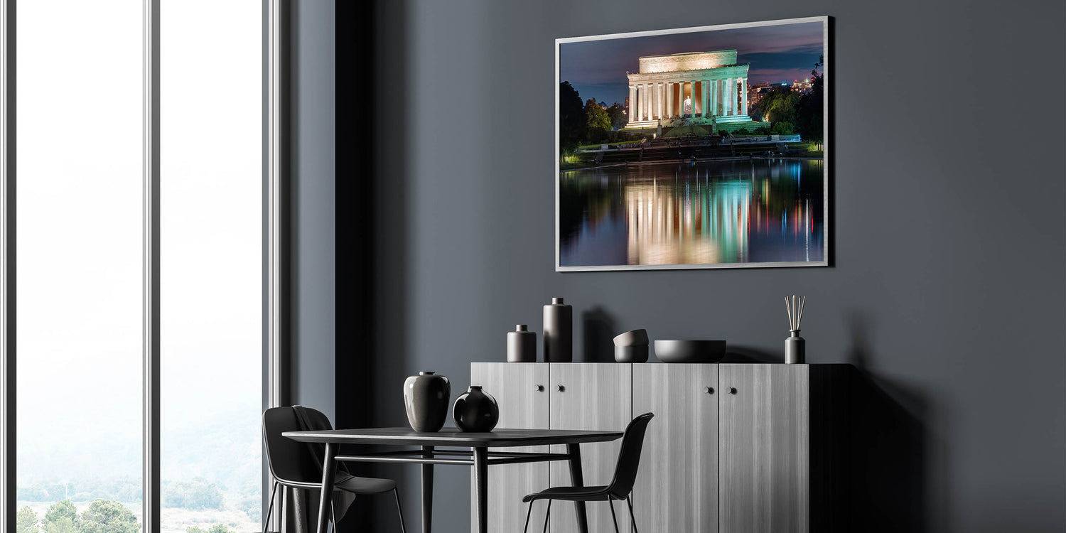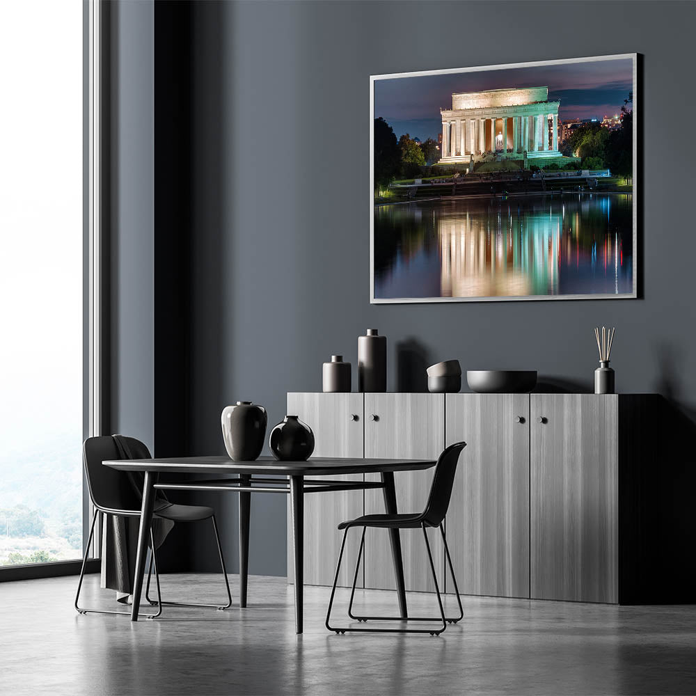The stunning reflection of the Lincoln Memorial in the pool, with soft, muted colors of nightfall, creates a peaceful and inspiring piece that brings the beauty of Abraham Lincoln statue art into your space. Order this Lincoln Memorial canvas art today and transform your space with this timeless American monument.
