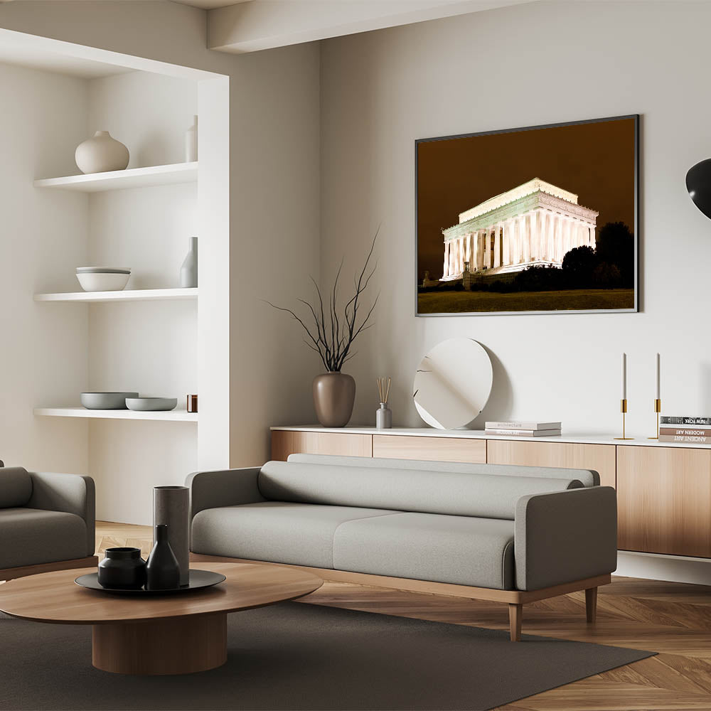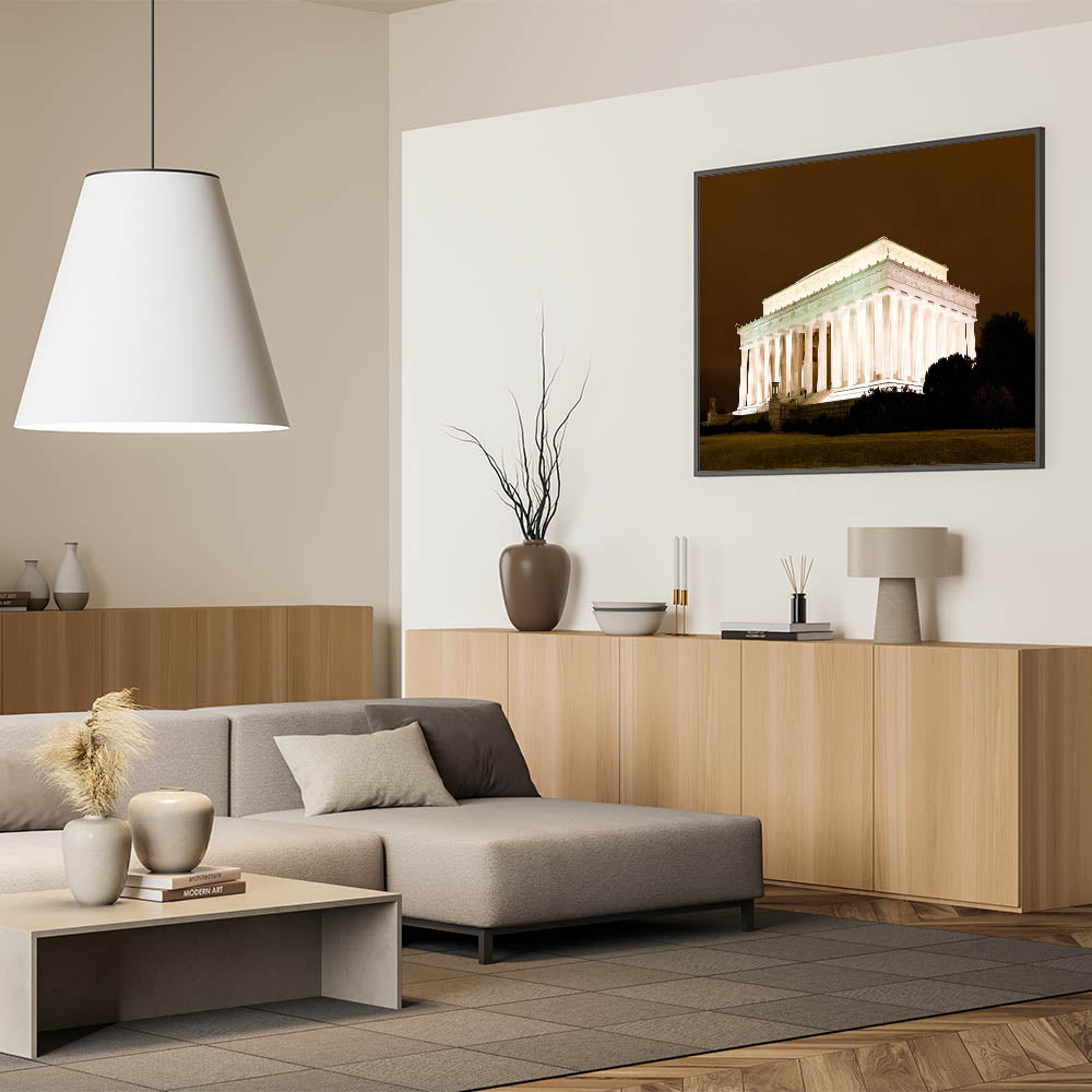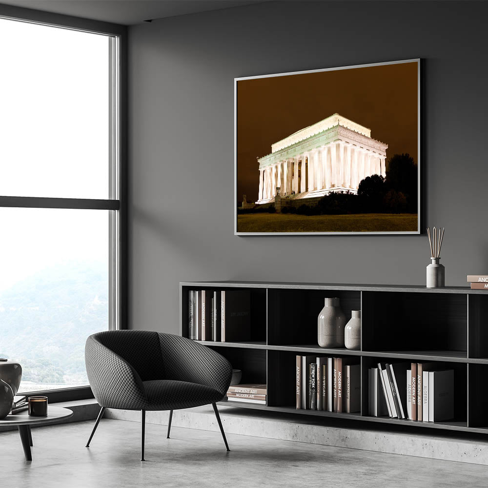 Bring the timeless elegance of Washington, D.C.'s iconic Lincoln Memorial into your space with this stunning wall art. Capturing the monument's majestic beauty at night, this Lincoln Memorial artwork is perfect for any history lover or anyone looking to add a piece of Washington DC art prints to their home. Available in various formats including stretched canvas, framed canvas, acrylic glass, and posters, this piece adds both sophistication and style to any room.