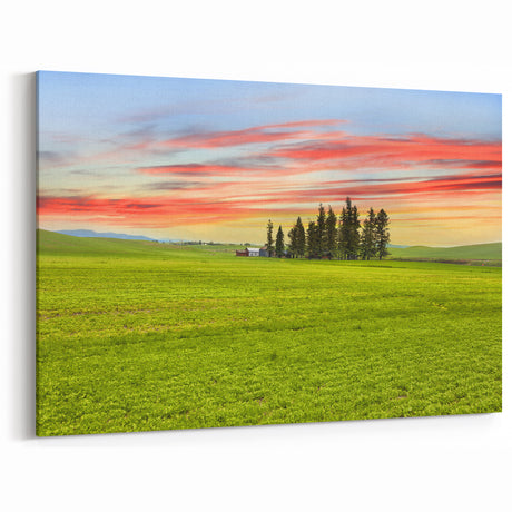 • Rolling hills of Palouse in earthy green tones on stretched canvas, suitable for kitchen wall art.