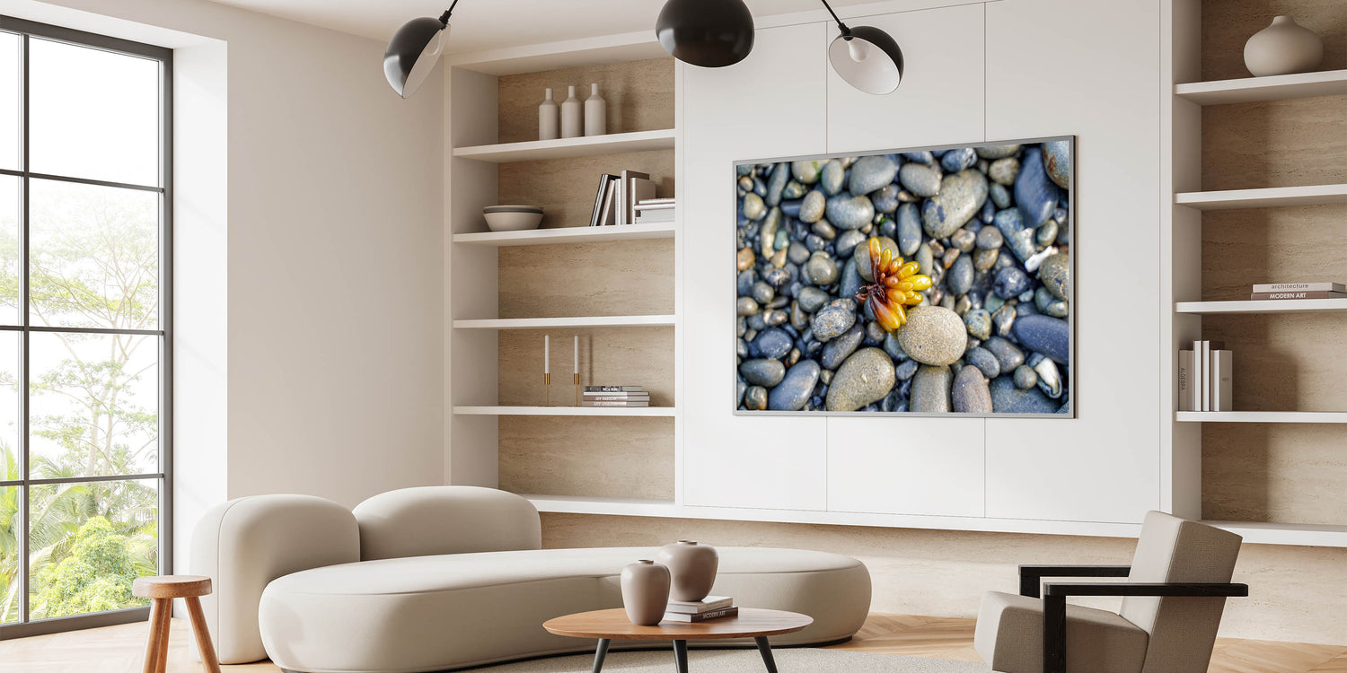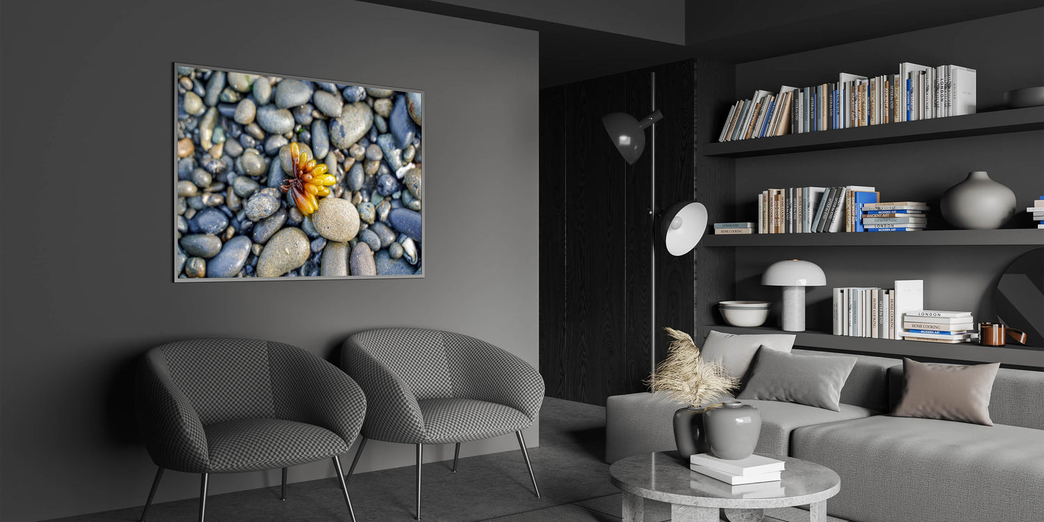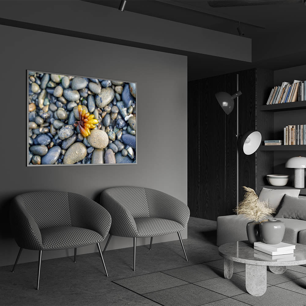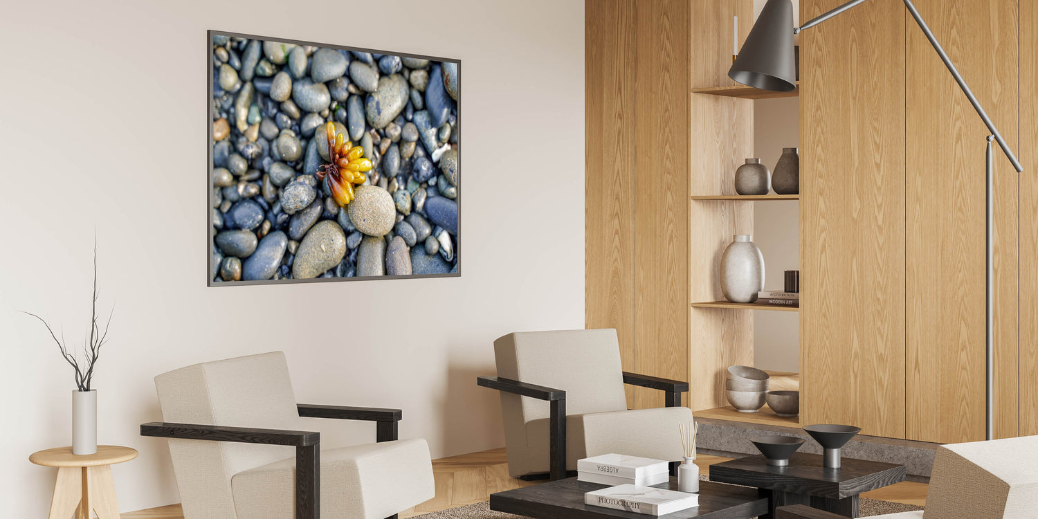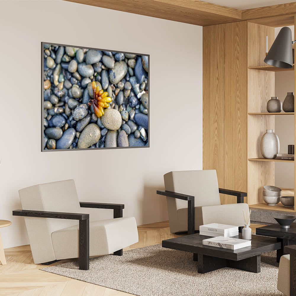 Bring the intricate beauty of nature into your space with this stunning Olympic National Park wall art. Featuring a detailed close-up of smooth pebbles and golden seaweed washed ashore, this piece captures the simplicity and elegance of the Pacific Northwest’s coastal treasures. The rich textures and earthy tones of the stones contrasted with the warm hues of the seaweed make this artwork a unique and captivating addition to any home.