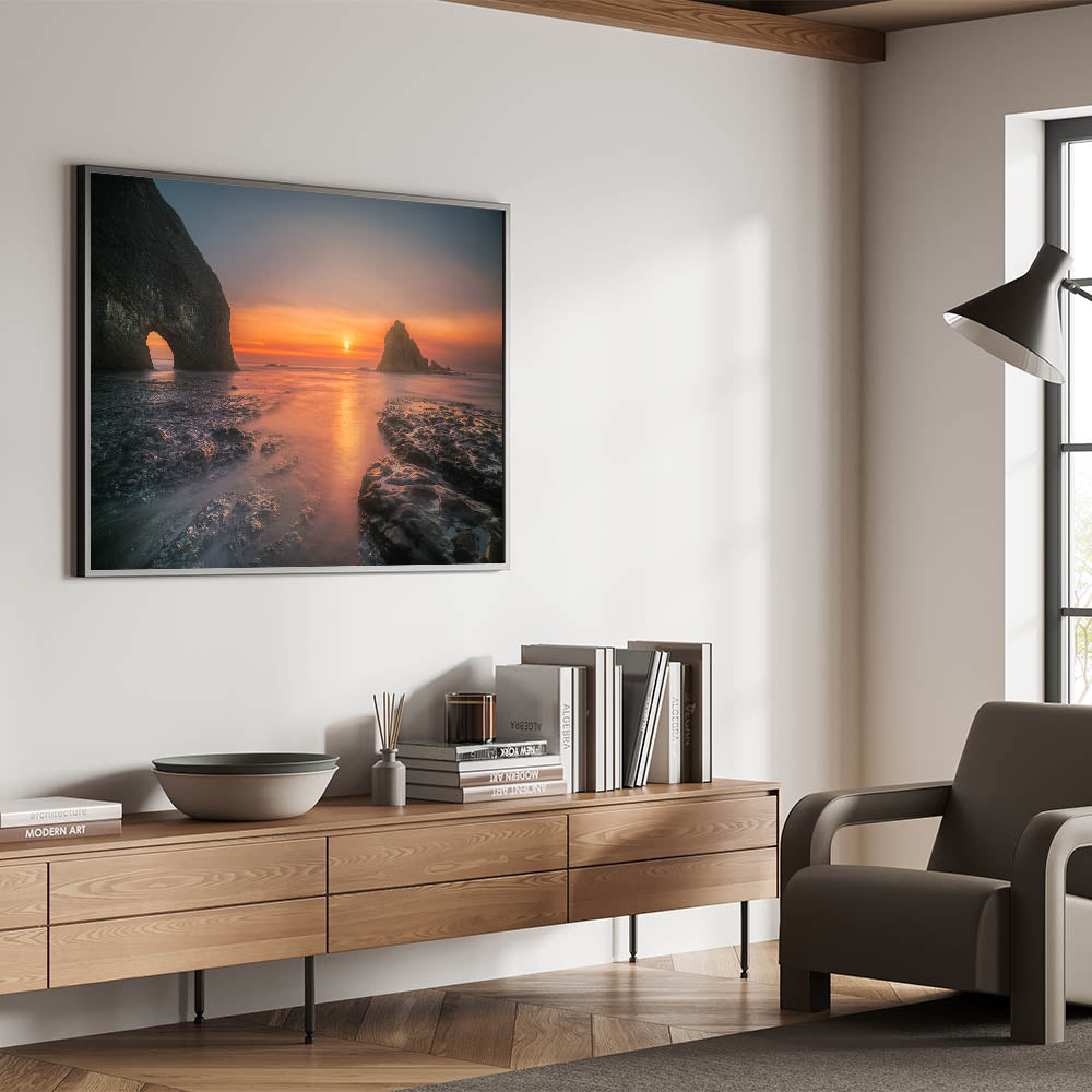 Capture the breathtaking beauty of Olympic National Park’s rugged coastline with this stunning wall art. Featuring a mesmerizing sunset over rocky cliffs and the tranquil ocean, this artwork brings the magic of nature's golden hour into your home. The rich colors and serene scene make it perfect for anyone who loves the outdoors or appreciates the beauty of coastal landscapes.