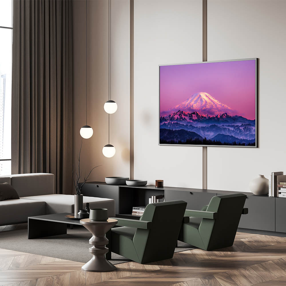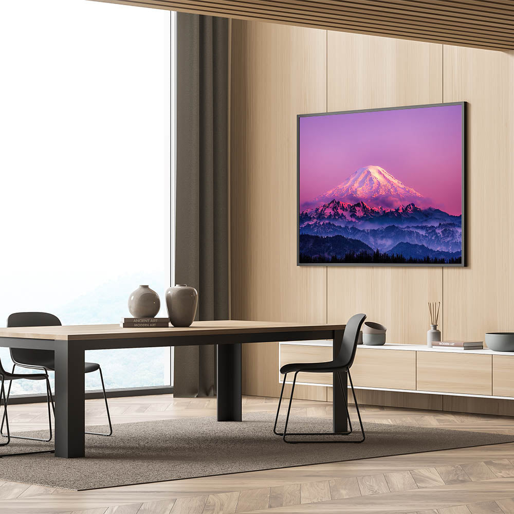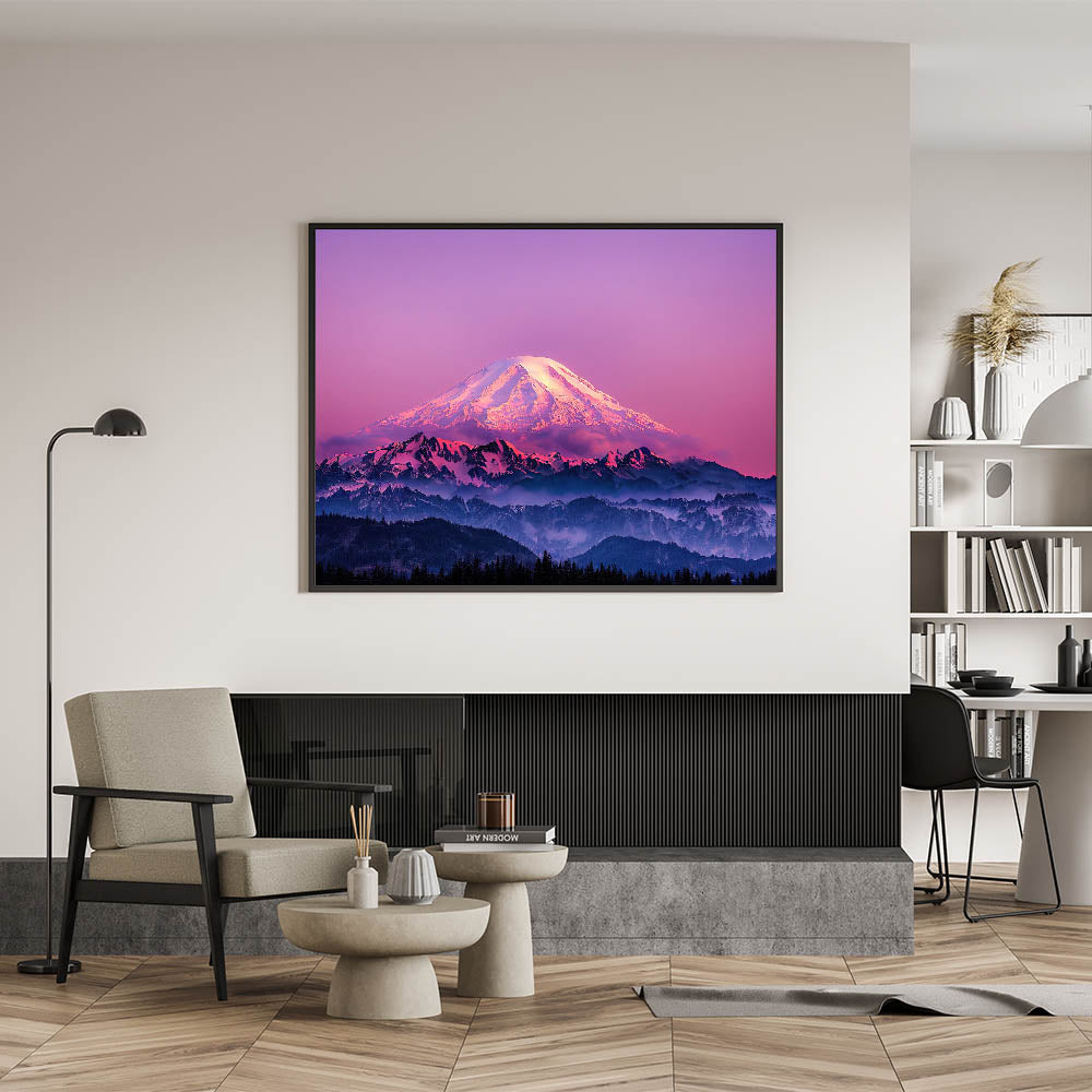 Immerse yourself in the vibrant beauty of Mount Rainier with this captivating wall art featuring stunning shades of pink and purple at sunset. The majestic snow-capped peak is bathed in soft, glowing hues, while the rugged mountains below create a dramatic contrast. Perfect for those who appreciate bold and colorful landscapes, this Mount Rainier art print adds a striking focal point to any room.