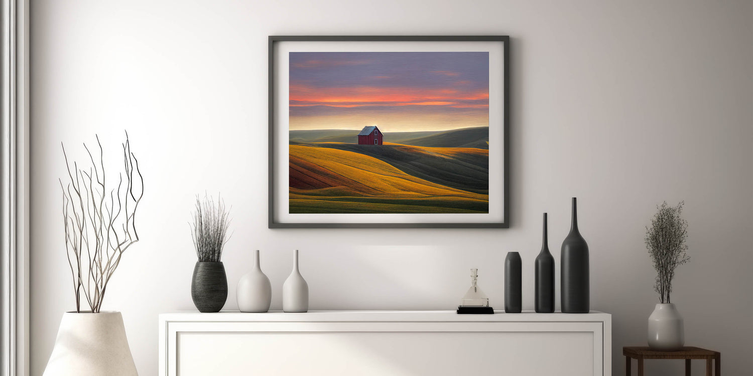 Add a touch of tranquility to your home with this stunning Palouse region wall art, featuring a solitary red barn nestled among the rolling hills under a vibrant sunset. The soft gradient of the sky, transitioning from warm oranges to cool purples, perfectly complements the golden fields and deep greens of the hills. This artwork captures the serene beauty of rural Washington and is an ideal choice for those seeking a peaceful, nature-inspired focal point in their decor.