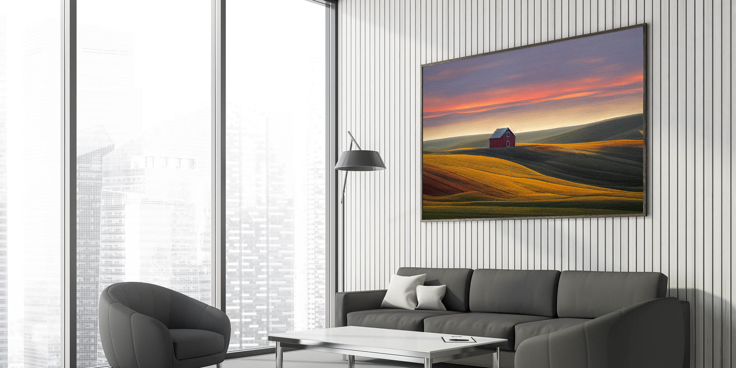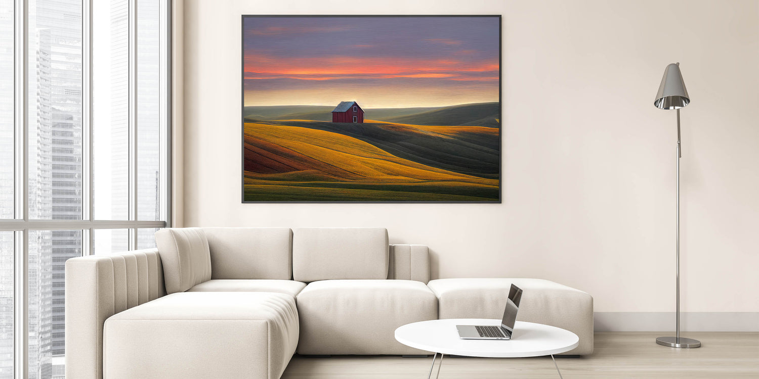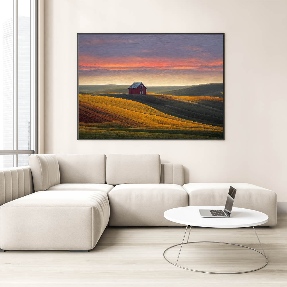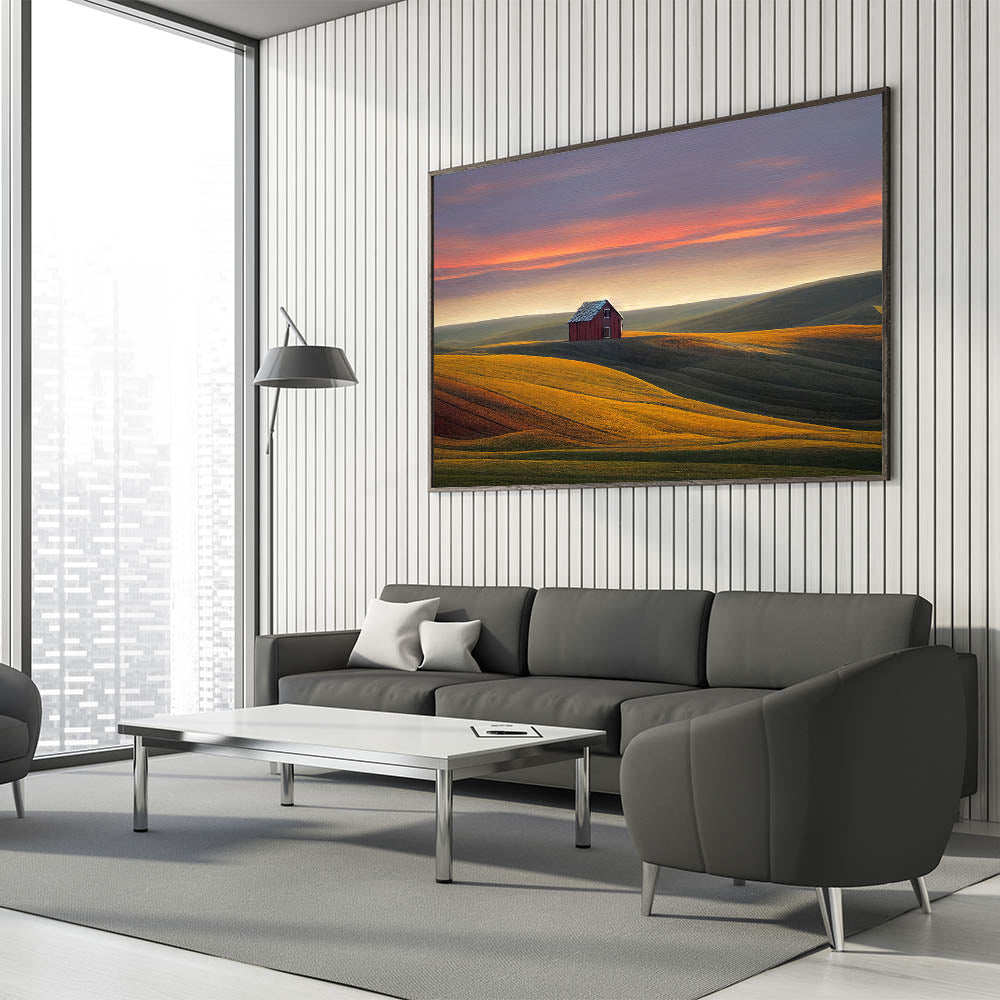 Palouse Region Art - Red Barn at Sunset on Rolling Hills Canvas or Acrylic