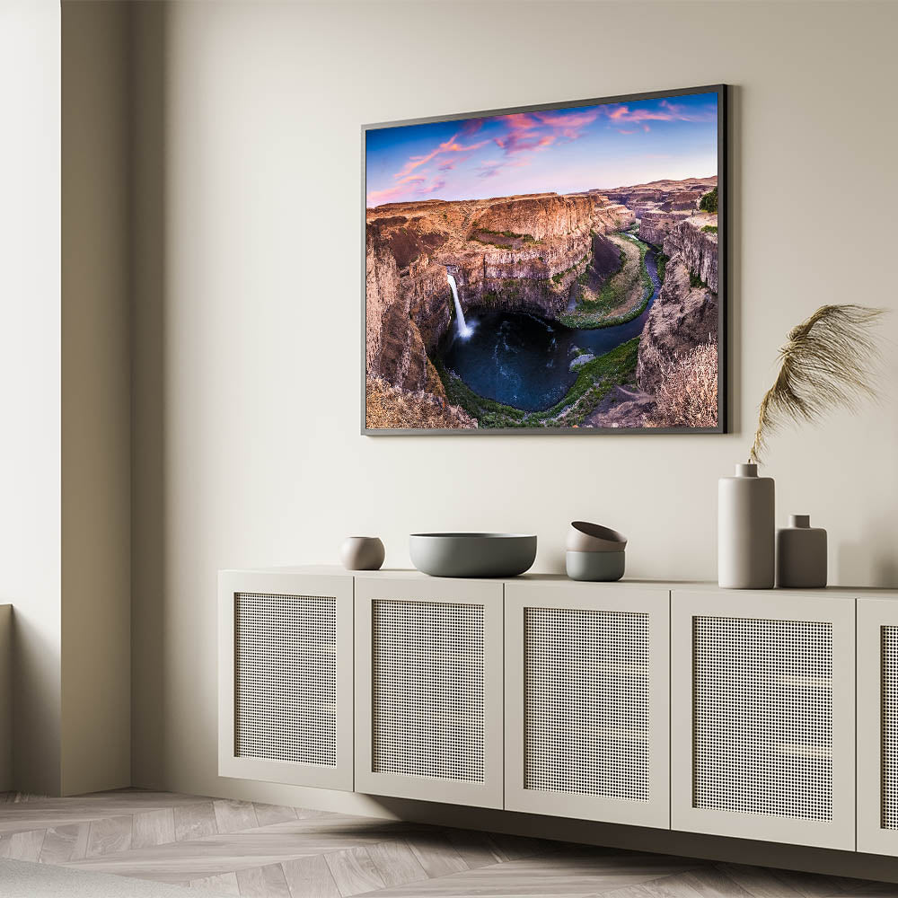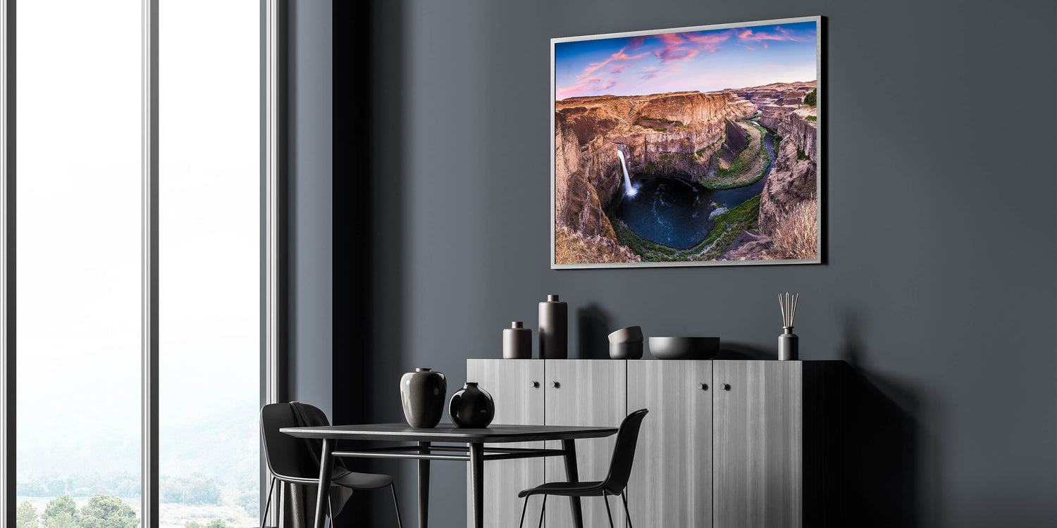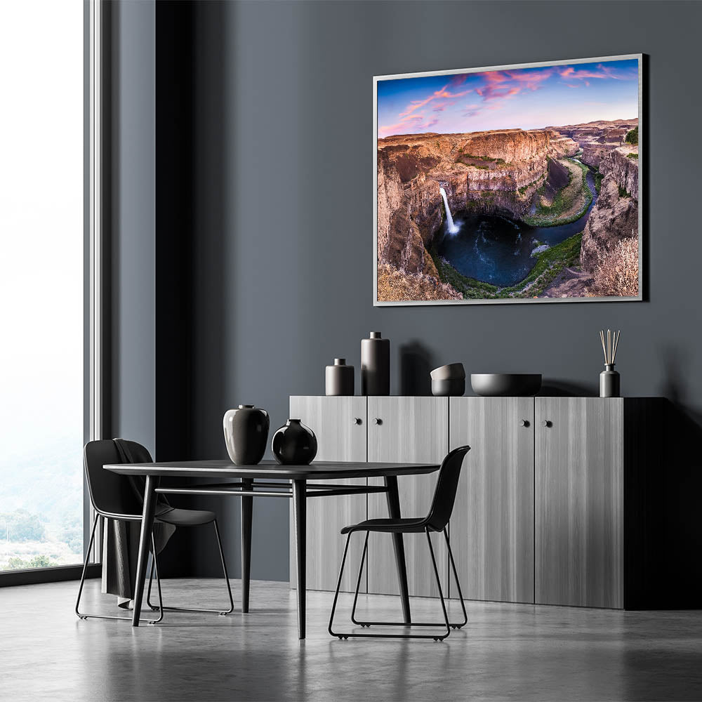 Capture the beauty of the Palouse Wall Art, featuring the awe-inspiring waterfall nestled in the heart of Washington’s majestic Palouse canyon. This Palouse landscape photography immerses you in the breathtaking views of the powerful waterfall surrounded by towering canyon walls and rugged terrain, highlighted by the soft hues of a sunset-lit sky. Perfect for nature lovers and art enthusiasts alike, this artwork brings the essence of the Washington State scenery into any home or office.