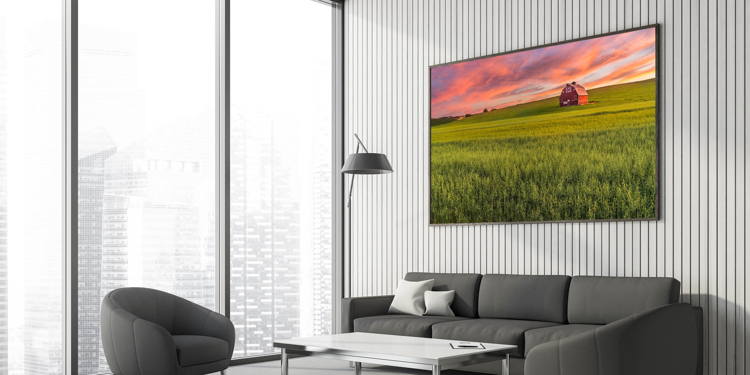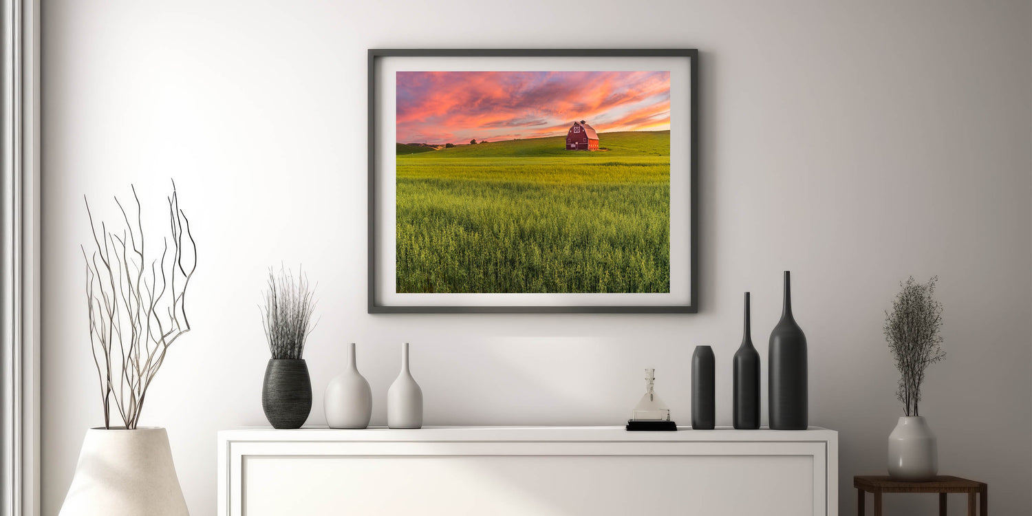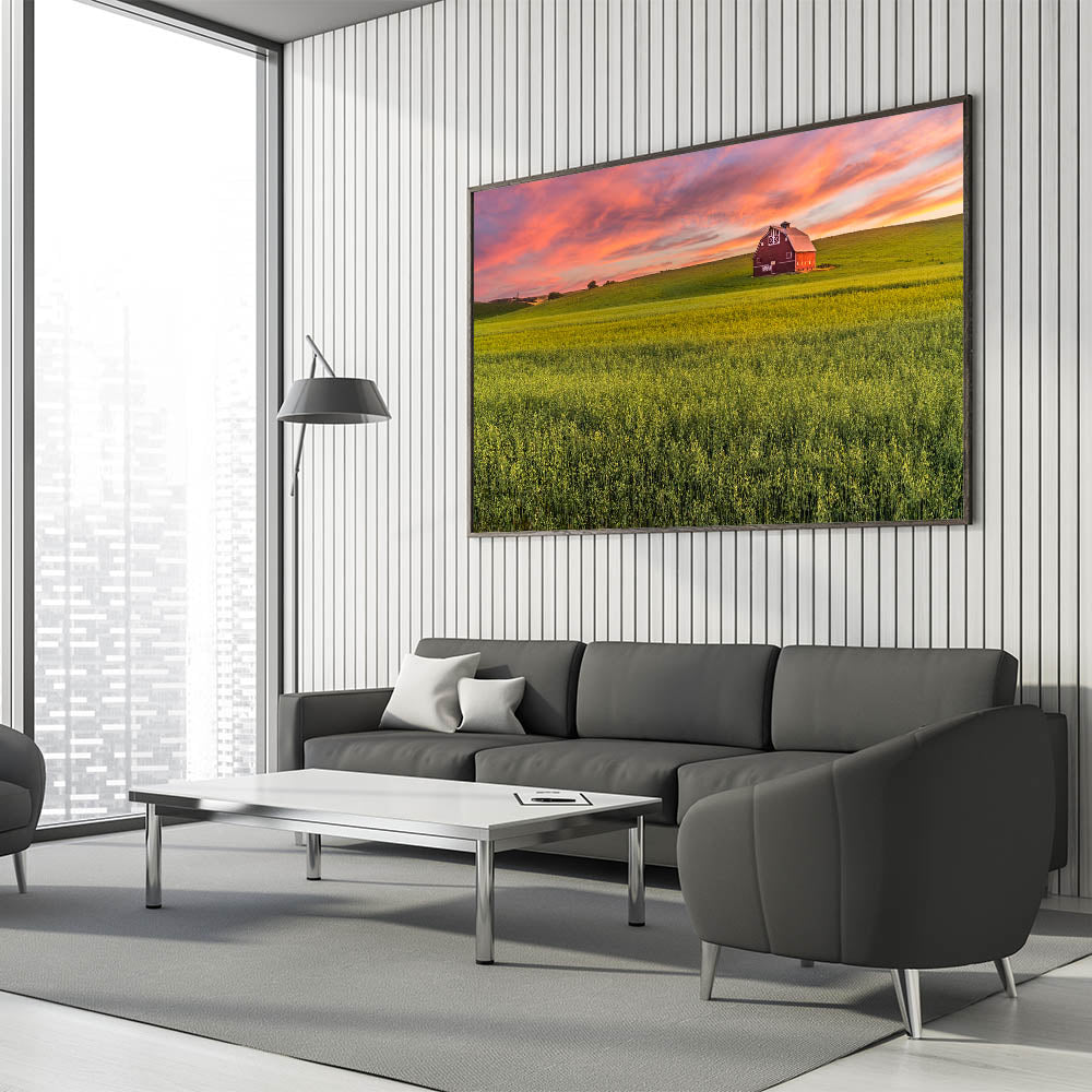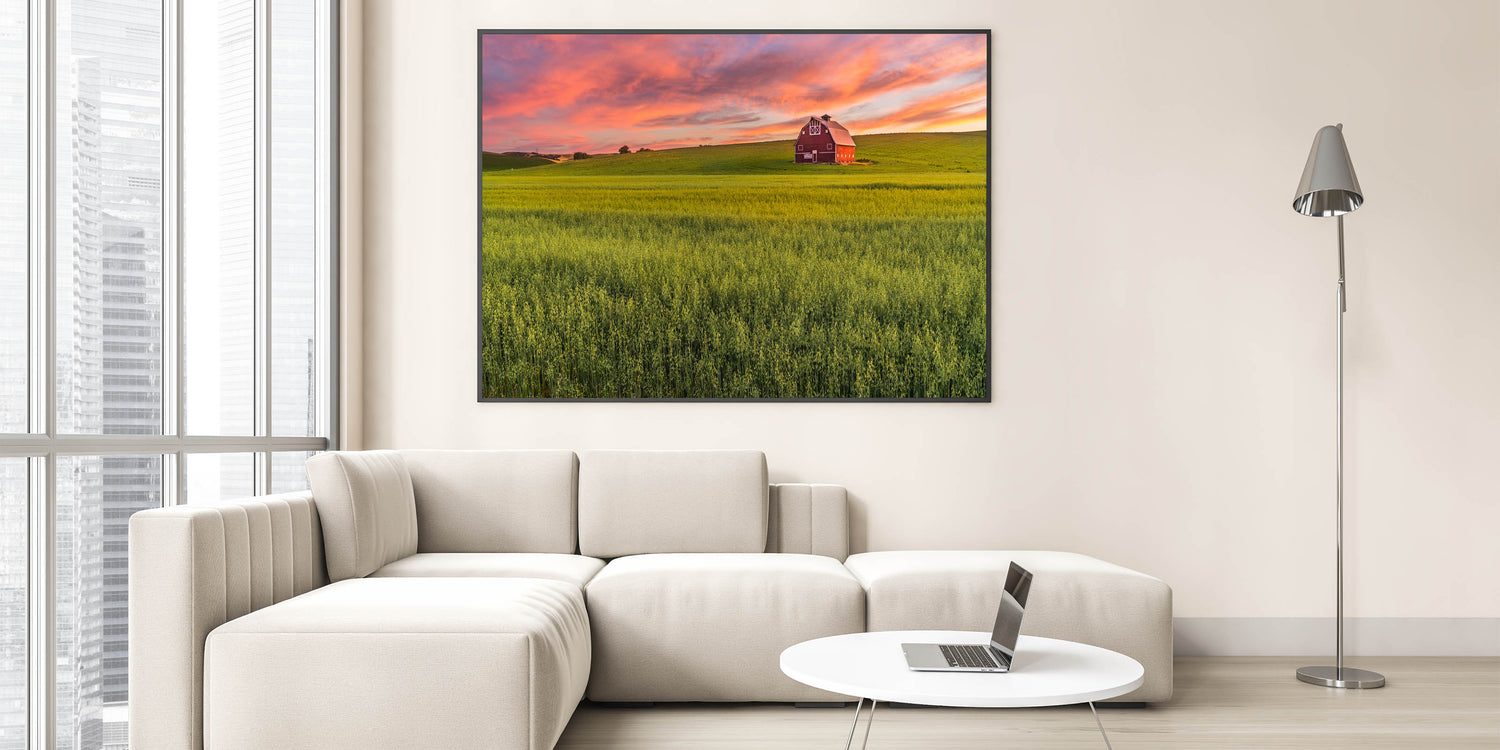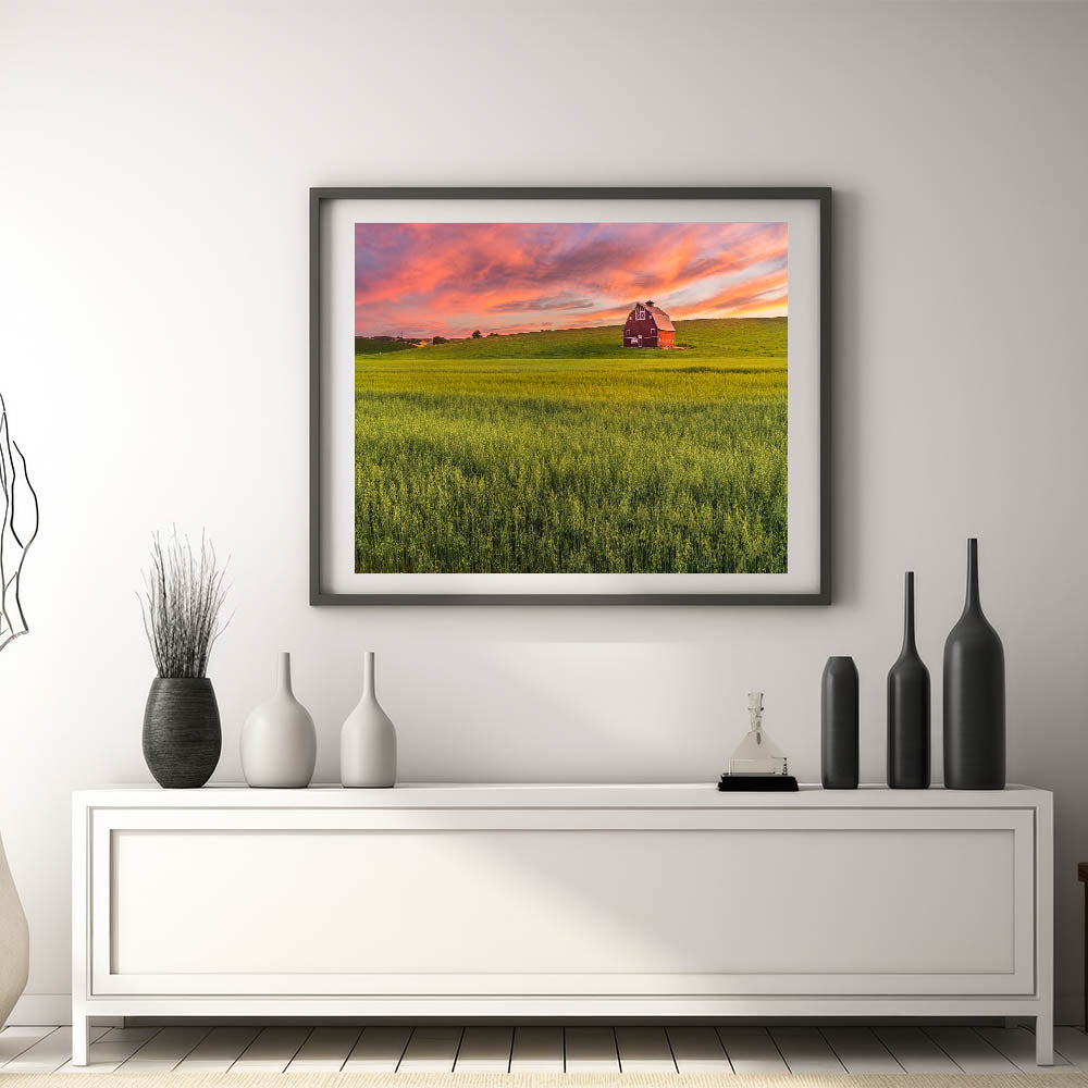 Enhance your space with this stunning Palouse landscape, featuring the iconic red barn and a breathtaking sunset. This artwork is available in various formats to suit your personal style and space.