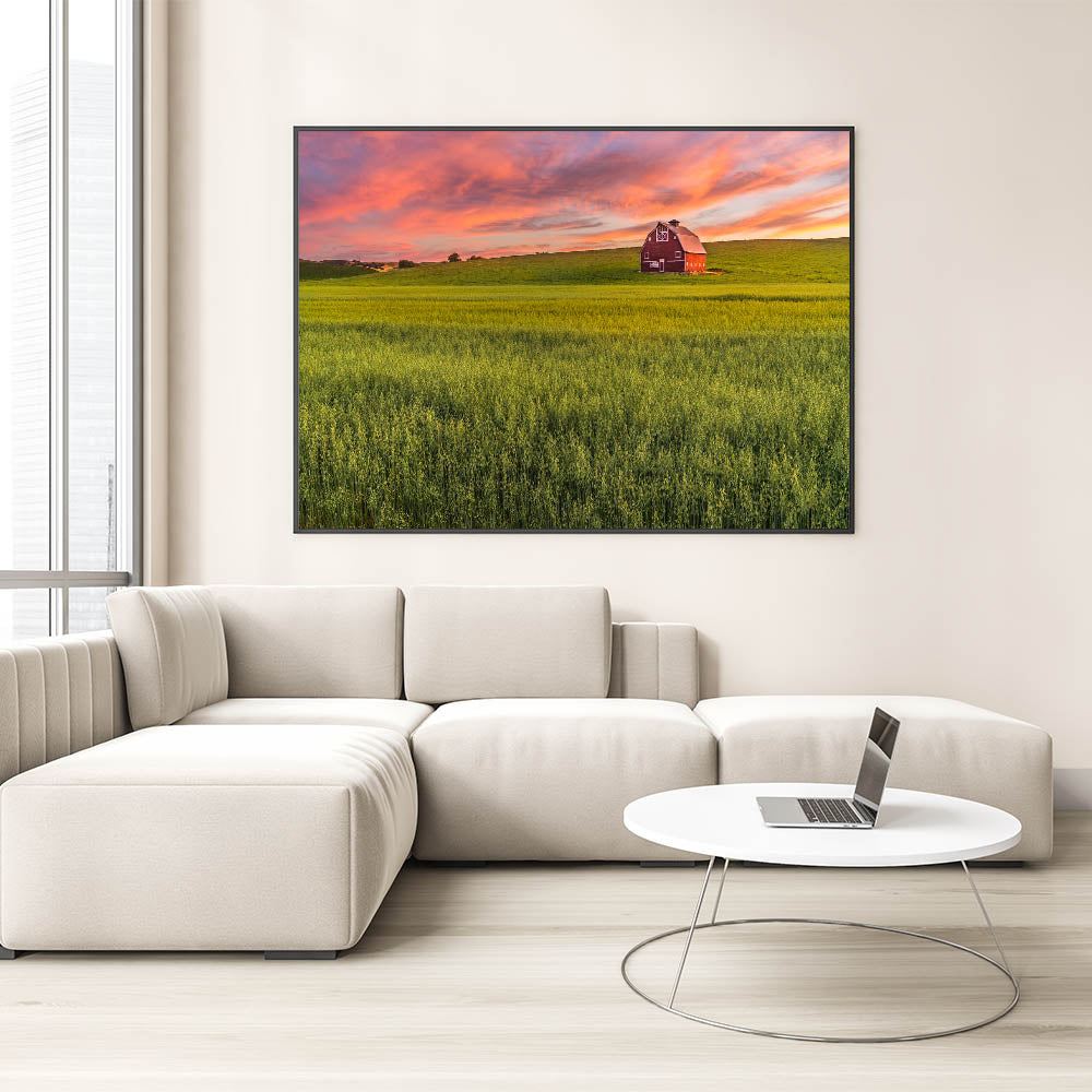 Bring the charm of the Palouse region into your home with this beautiful wall art, featuring a classic red barn set against a stunning sunset sky. The vibrant orange, pink, and red hues of the sunset create a striking contrast with the lush green fields, offering a picturesque glimpse into rural Washington State. This artwork captures the peaceful essence of the Palouse landscape, perfect for adding warmth and tranquility to any room.