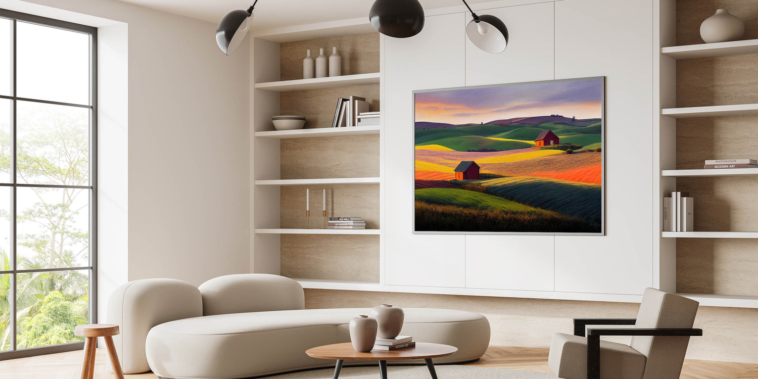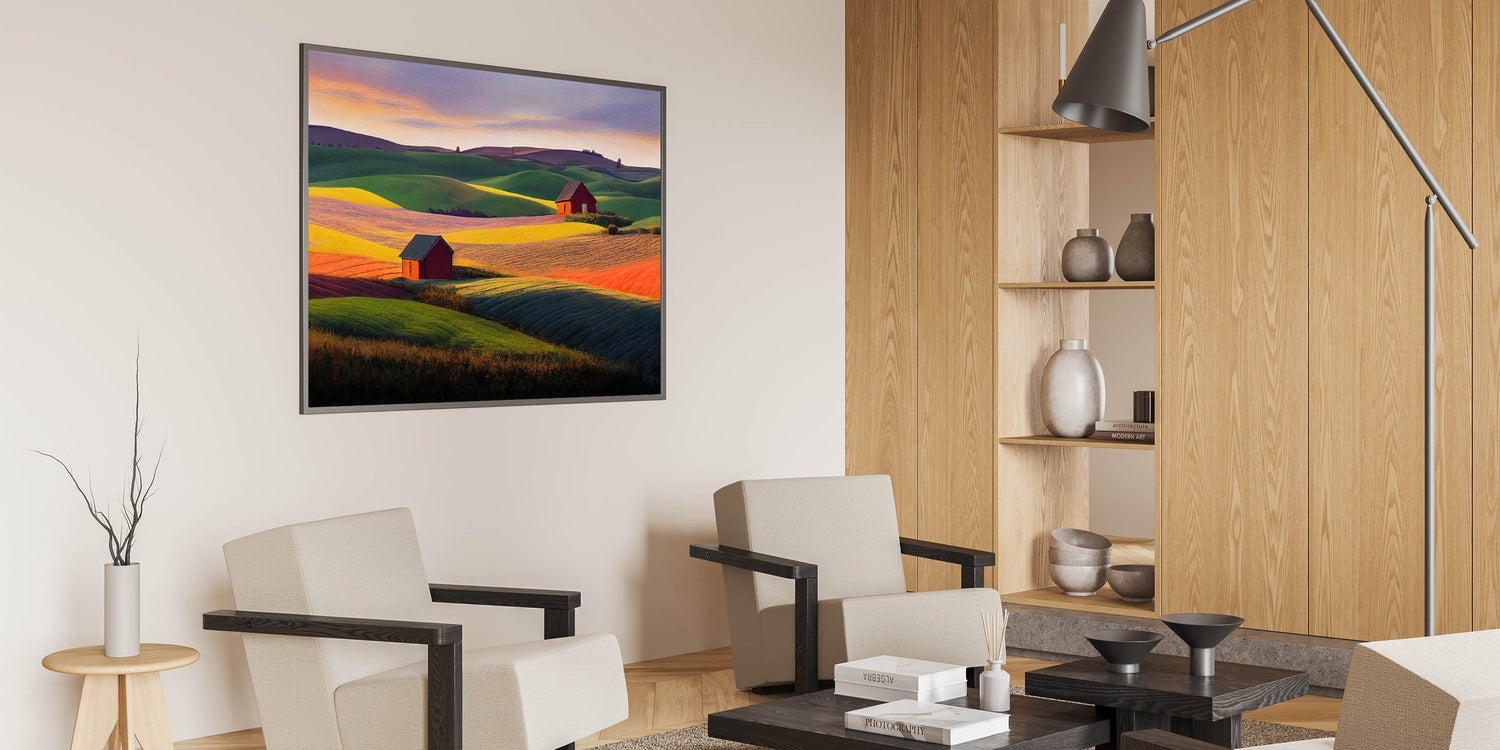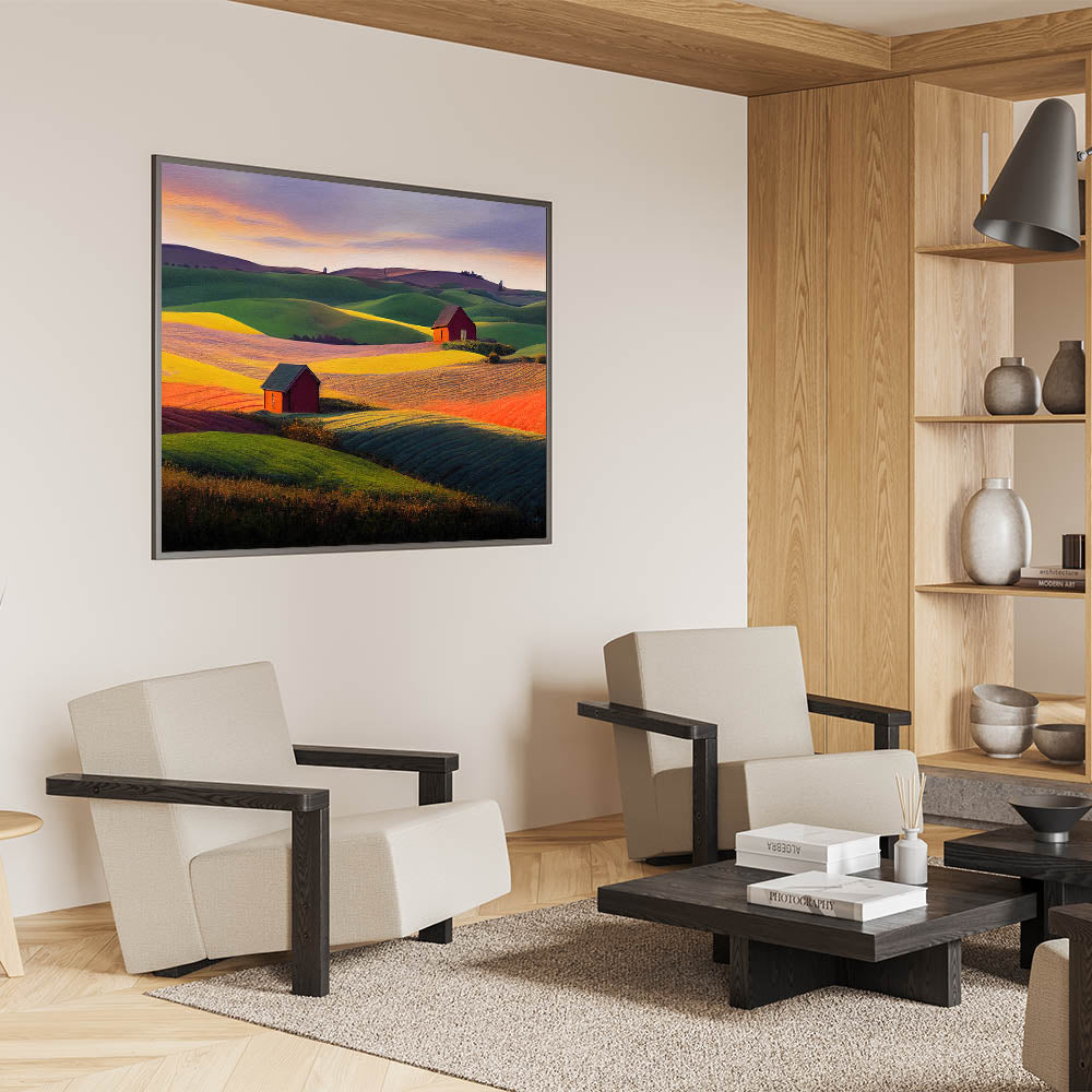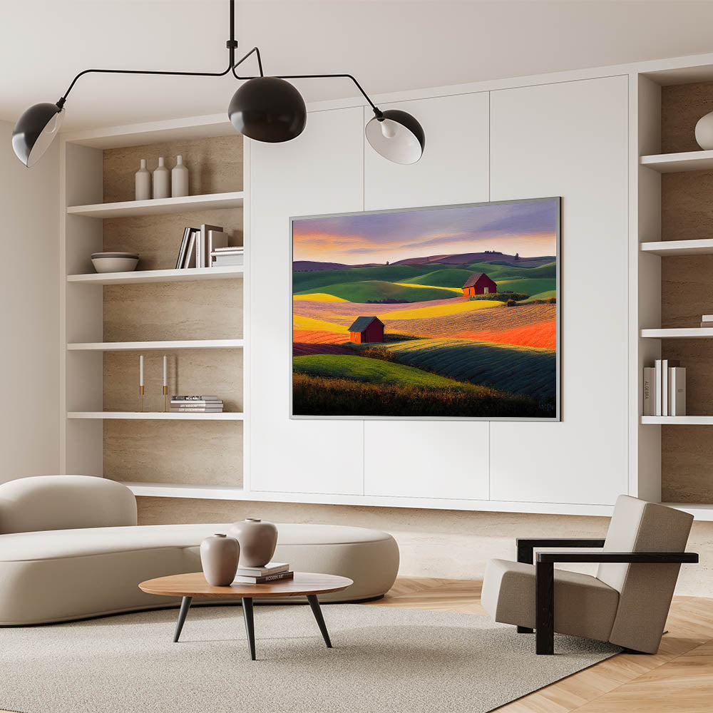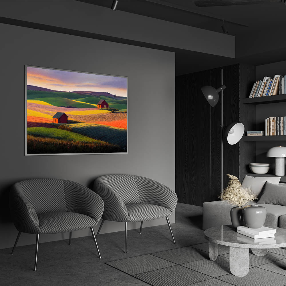 Add the vibrant beauty of the Palouse region to your home with this stunning wall art, featuring vivid green and golden fields dotted with charming red barns. The bright, saturated colors of the landscape come alive under the soft glow of the setting sun, casting long shadows that emphasize the rolling hills and vast open space. This artwork perfectly captures the serene yet lively essence of Washington's Palouse, offering an ideal focal point for any room.