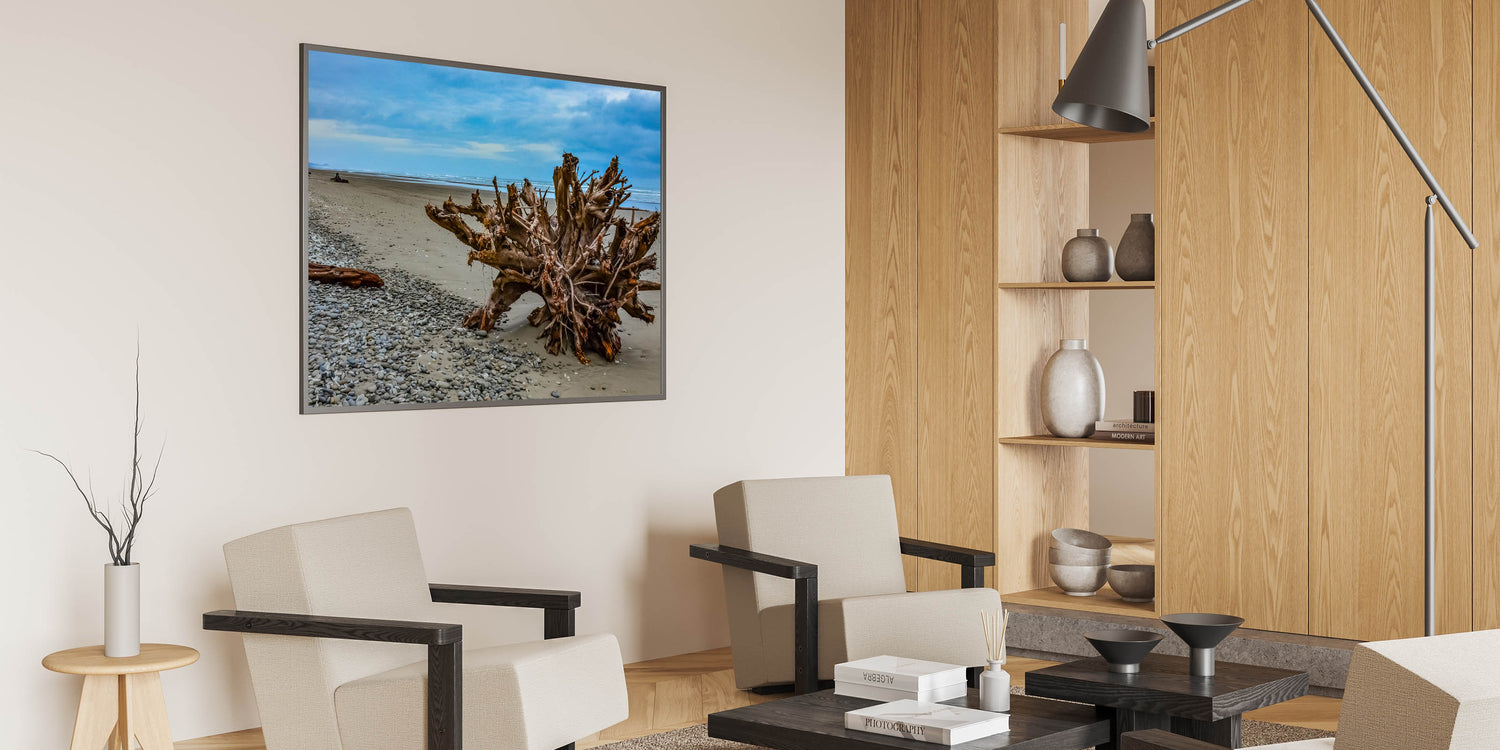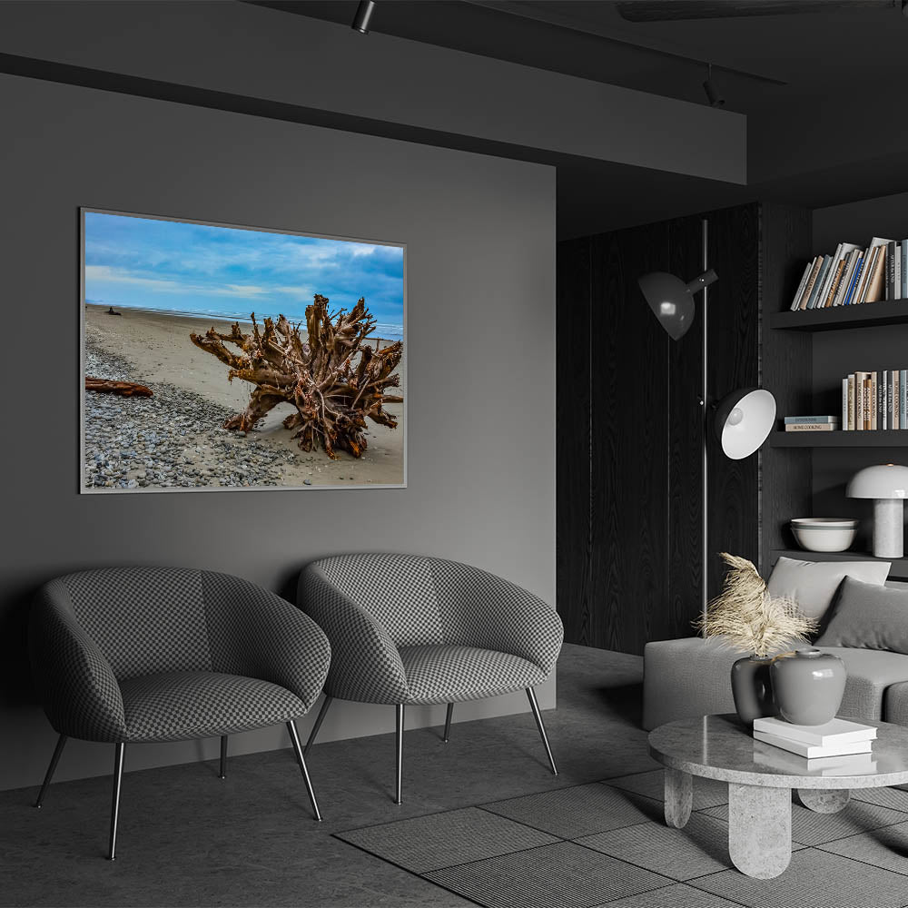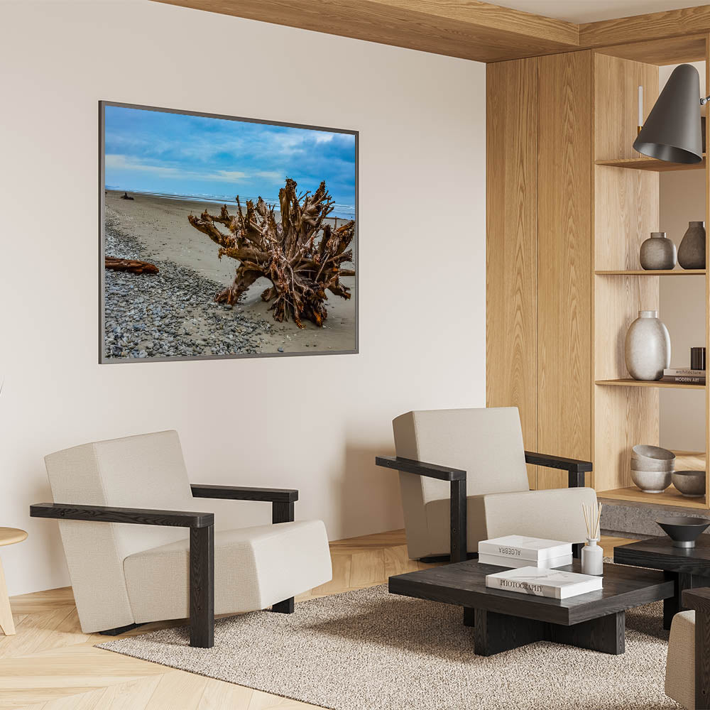 Immerse yourself in the rugged beauty of Washington’s coastline with this stunning Olympic National Park art piece. Featuring a large, weathered piece of driftwood resting on a rocky beach, this artwork captures the raw and natural essence of the Pacific Northwest. The combination of muted blues, grays, and earthy browns brings a serene yet powerful feel to any space.