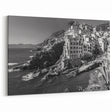 Elevate your space with the timeless elegance of this monochrome coastal village wall art, capturing a dramatic cliffside harbor scene in stunning black and white. This artwork showcases a picturesque Italian village perched on rugged cliffs, where rows of buildings cascade down towards the sea. The intricate details of the architecture and the rugged landscape are brought to life through the sharp contrasts and shadows, creating a striking visual impact. The waves crashing against the rocky shoreline add a dynamic element to the scene, making this piece a perfect focal point for any room.