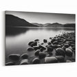 Elevate your home decor with this captivating monochrome seascape wall art. The black-and-white coastal scene features smooth stones along a tranquil shoreline, set against misty mountains in the distance. The absence of color enhances the serene atmosphere, making this piece a perfect addition to modern or minimalist spaces.