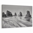 Immerse yourself in the timeless beauty of nature with this Monolithic Rock Seascape Art. This black-and-white coastal print captures the majestic presence of towering rock formations standing resilient against the ever-changing tides. The smooth flow of water around these ancient stones is beautifully contrasted by the sharp, rugged textures of the rocks, creating a dynamic and captivating scene that will add depth and sophistication to any space.