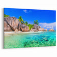Escape to a tropical paradise with this stunning beach landscape wall art featuring majestic granite rocks and crystal-clear waters. This vibrant artwork captures the natural beauty of a pristine beach where the striking contrast between the rugged rocks and the tranquil turquoise sea creates a captivating scene. The lush greenery and bright blue sky further enhance the tropical atmosphere, making this piece a perfect addition to any coastal or nature-inspired decor.