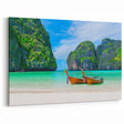 Bring the serenity and vibrant colors of a tropical paradise into your home with this captivating beach landscape wall art. Featuring traditional wooden boats gently resting on the crystal-clear waters of a secluded beach, this artwork perfectly captures the tranquil beauty of an idyllic coastal scene. The lush greenery of towering cliffs contrasts beautifully with the turquoise waters, creating a vivid and refreshing ambiance.